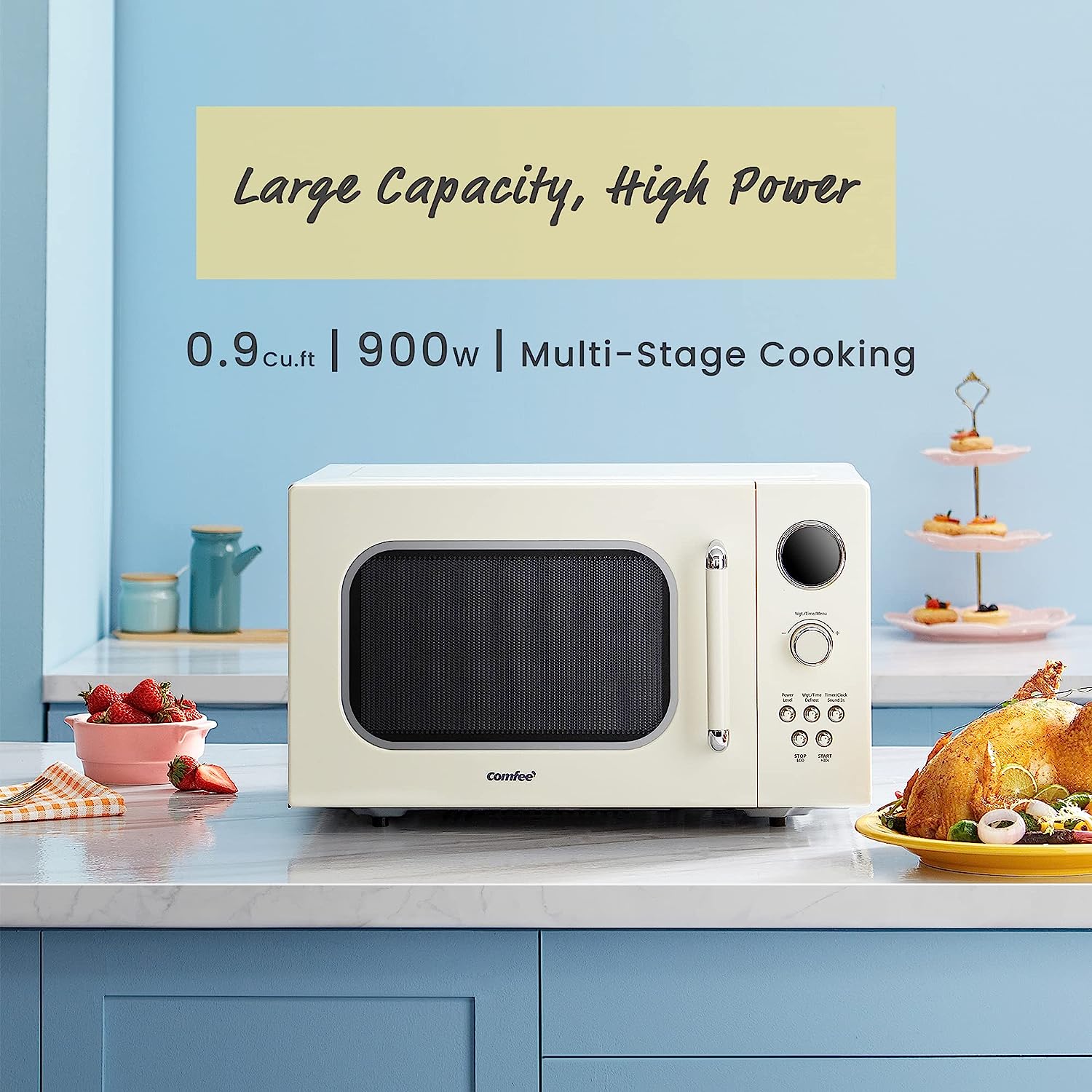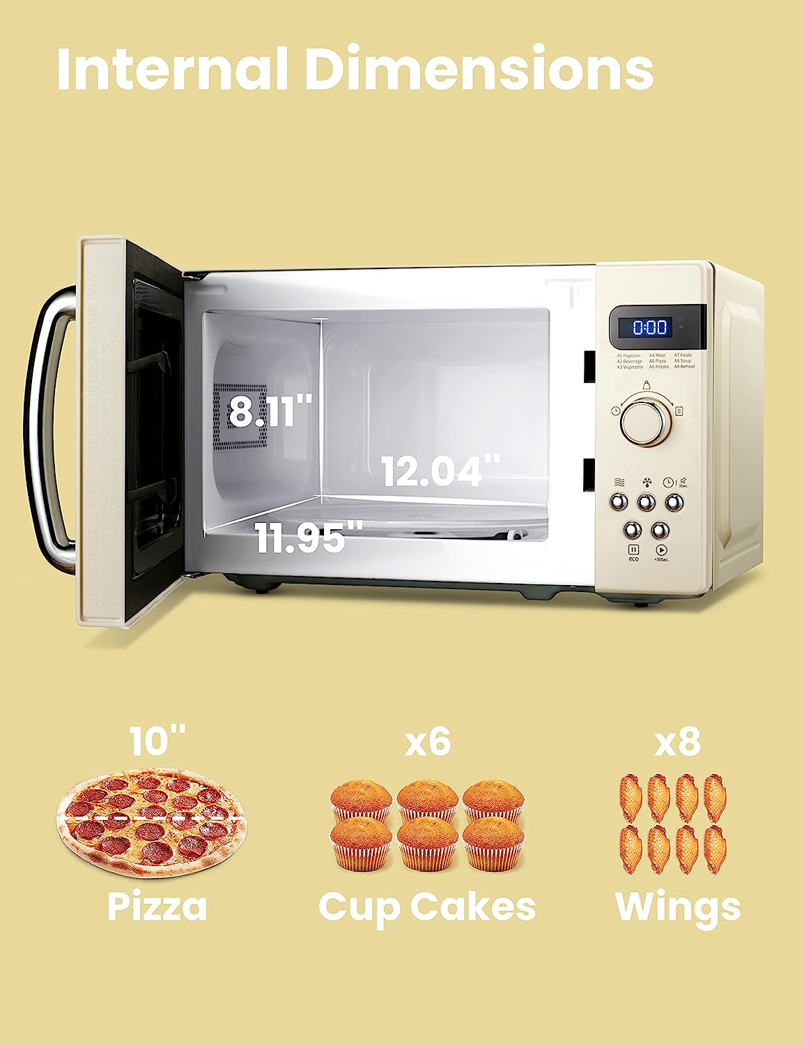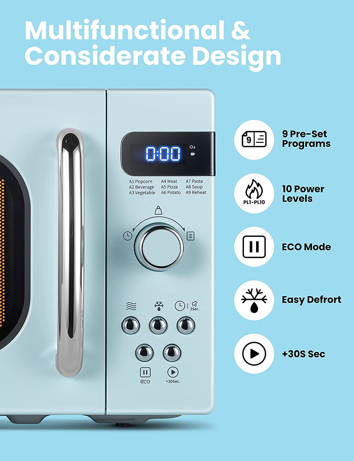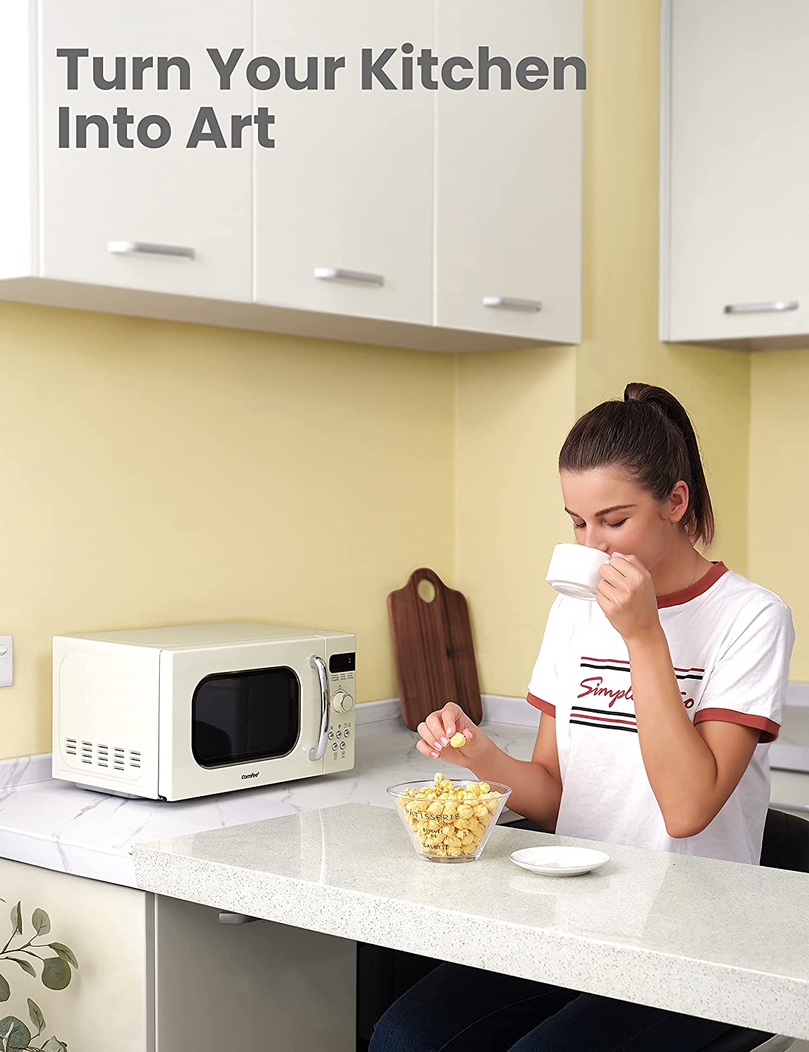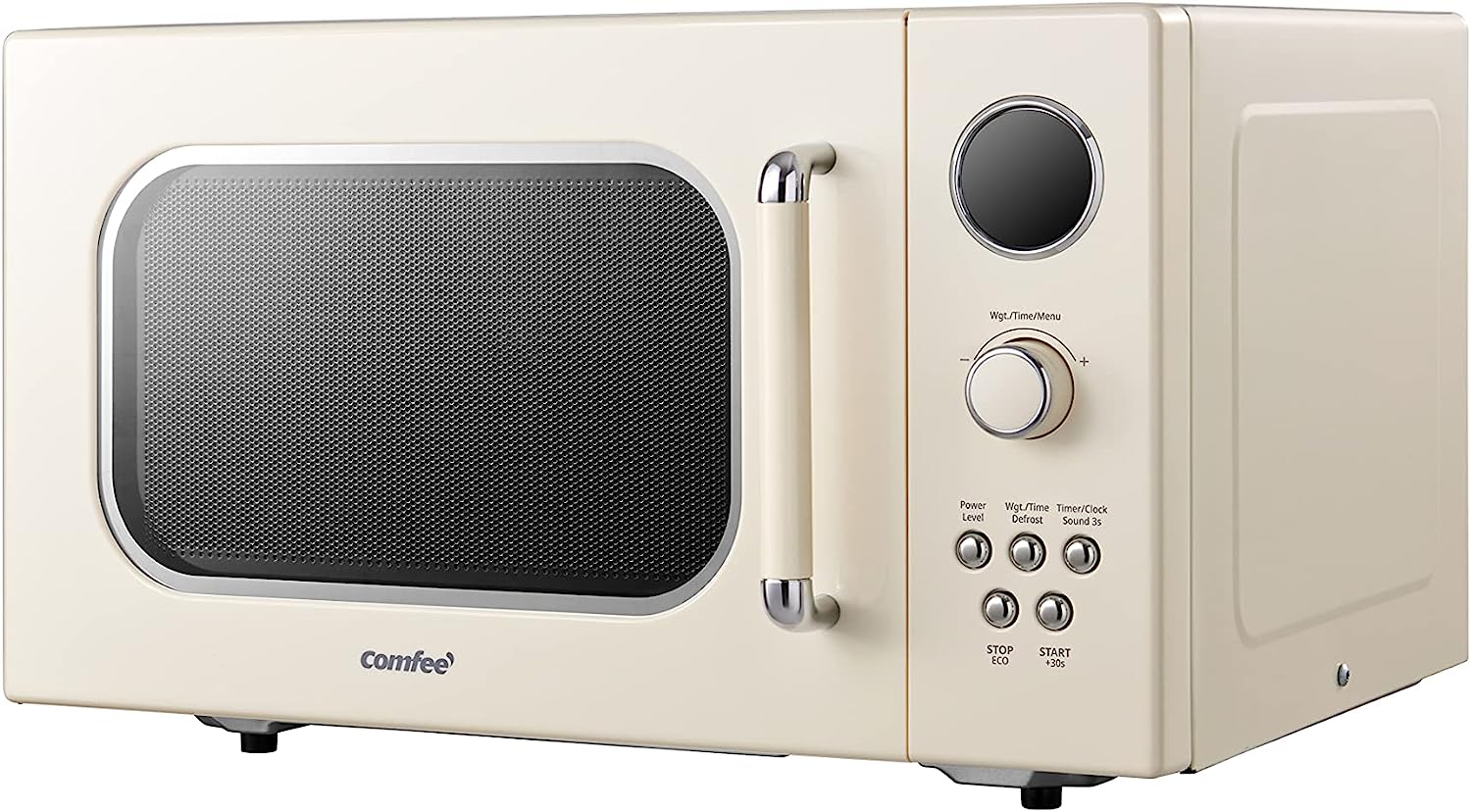 This COMFEE' 0.7 cubic feet 700 watts retro style microwave oven is inspired from those good old days, and refined by modern style and practical functions. It features 9 auto menus, easy defrosting function, microwave cooking with 10 power levels and an express cooking button. It is equipped with position memory turntable, energy saving eco mode, a mute button, clock and kitchen timer. The bright LED digital display, easy-to-read control panel and cool-touch rounded buttons further improve the user experience. And the compact size is ideal for apartment kitchens, vacation homes, offices and dorms.