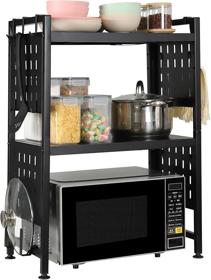 3 Tier Shelf Extendable Microwave Oven Rack Adjustable Bakers Rack for Kitchens Countertop Organizer Shelf with 4 Hooks and Pot Lid Support, Black