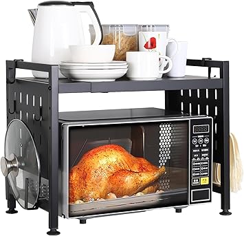 Extendable Microwave Oven Rack 2 Tier Adjustable Shelf Bakers Rack for Kitchens Countertop Appliance Shelf with 4 Hooks and Pot Lid Support, Black