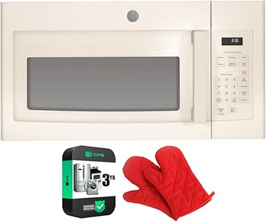 GE JVM3160DFCC 1.6 Cu. Ft. Over-the-Range Microwave Oven Bisque Bundle with Deco Chef Pair of Red Heat Resistant Oven Mitt and 3 YR CPS Enhanced Protection Pack