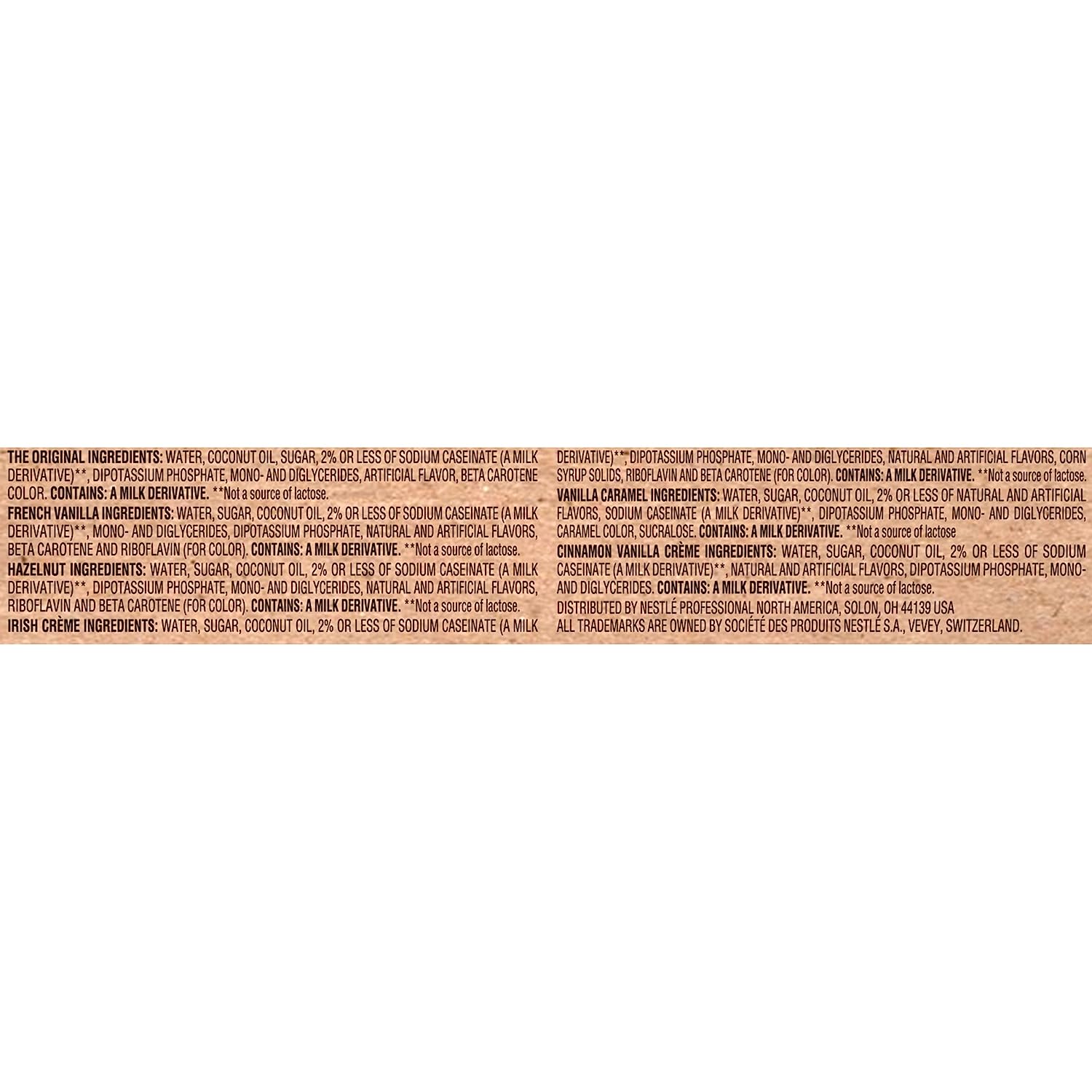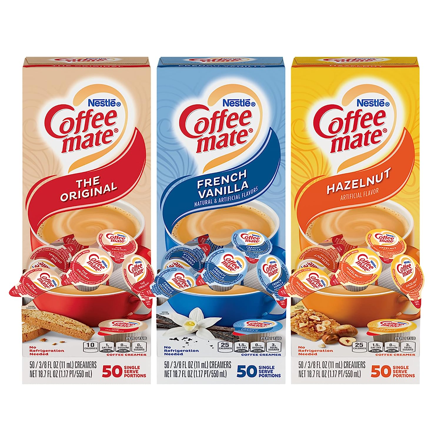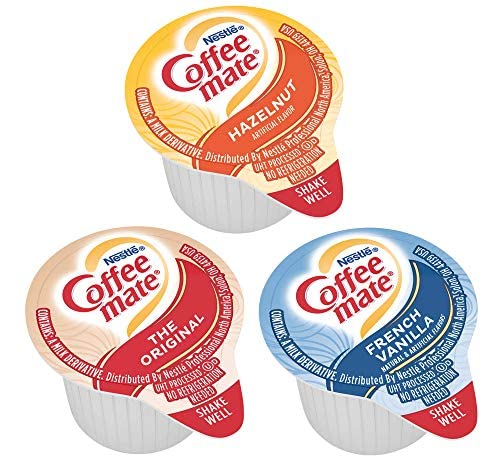 Nestle Coffee mate’s three best-selling flavors packed in one convenient box, Original, French Vanilla and Hazelnut. 50 count of each flavor. Hazelnut is a harmonious blend between a deliciously rich, velvety smooth classic and sweet nutty hazelnut notes. Original is a deliciously rich, velvety smooth creamer that will enhance and enrich your coffee offer with a touch of differentiation. French Vanilla is a harmonious blend between a deliciously rich, velvety smooth classic and bright French Vanilla notes. They are packaged in a convenient dispenser box, which keeps the counter clean, organized, and displayed beautifully. These creamer singles don’t need to be refrigerated, and can retain their irresistible flavor at room temperature for up to 9 months. Easy to use - shake, open and pour. Non-Dairy, Lactose-Free, Cholesterol-Free, Gluten-Free, Kosher Dairy.