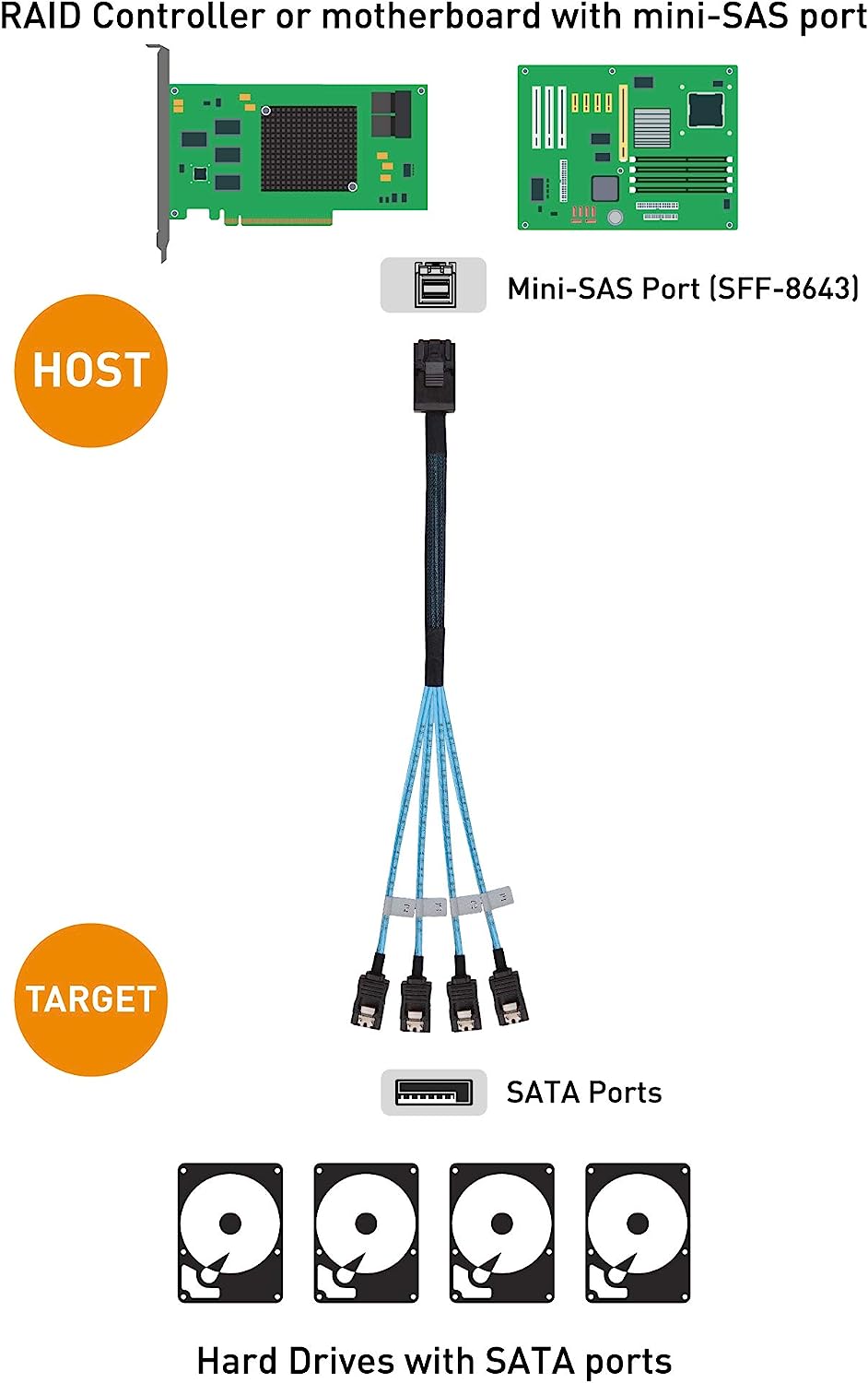 • Internal HD Mini SAS cable is specifically designed to connect a 12 Gbps host bus adapter or RAID controller with SFF-8643 to 4 discrete SATA drives; Mini SAS HD to SATA adapter cable provides reliable internal connectivity between a high density RAID controller card and direct attached storage devices with a SATA plug
