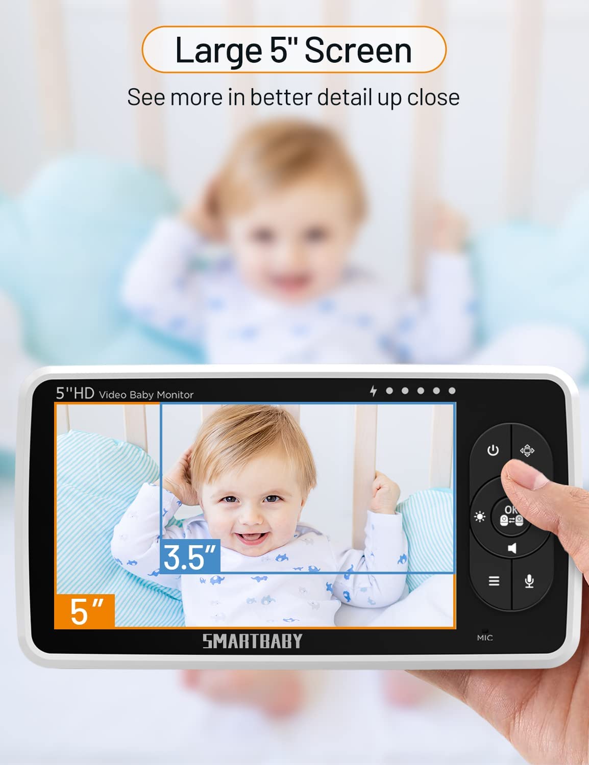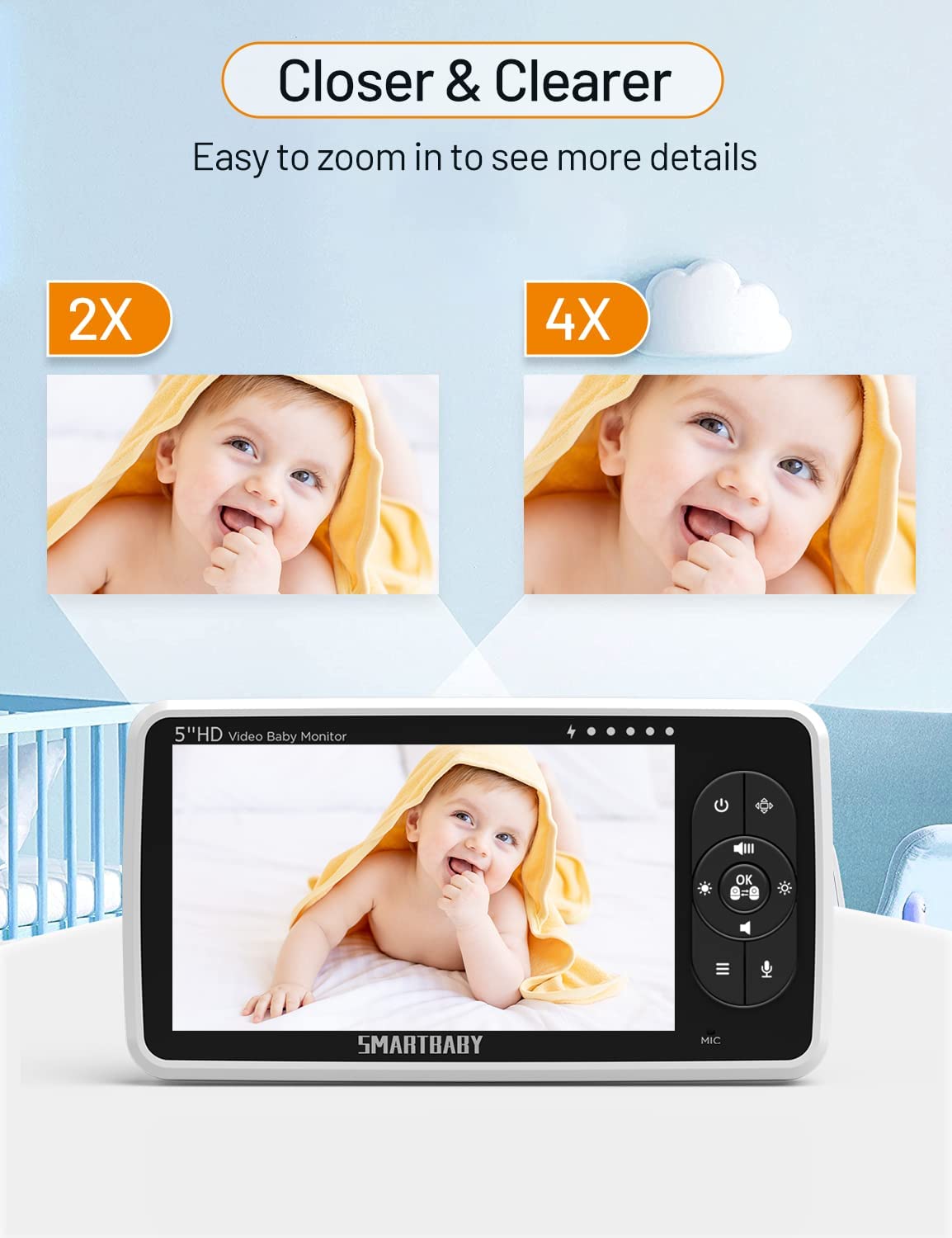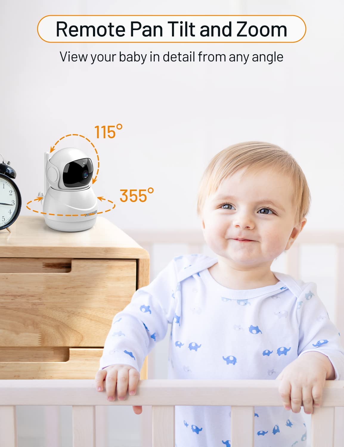• Baby Essentials for Newborn:View every detail and move of your adorable baby on a large 5” screen in 720P HD clarity baby camera monitor; The premium picture and video quality shows 10 times detail and precision as compared to standard 480P -display baby monitors. The baby video monitor with 4x Digital Zoom tilts 115° and pans 355° to provide an expansive view of the nursery to view your baby .You will never miss any moment of taking good care of your baby.