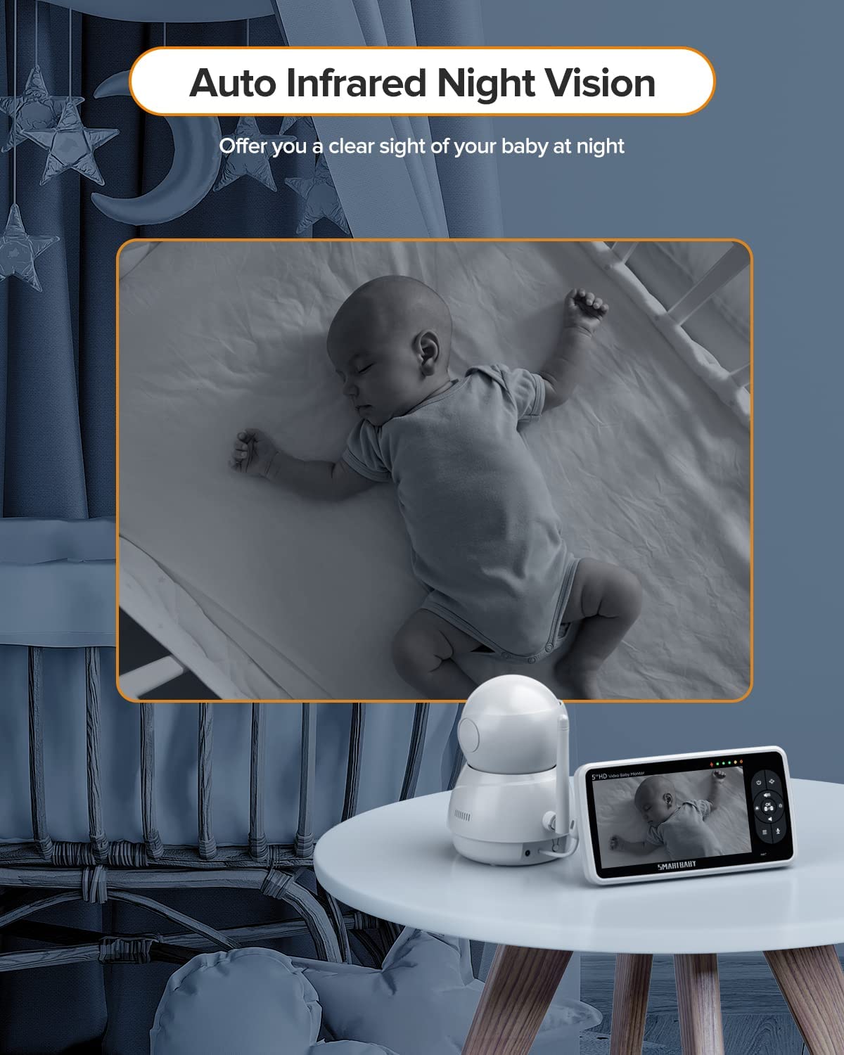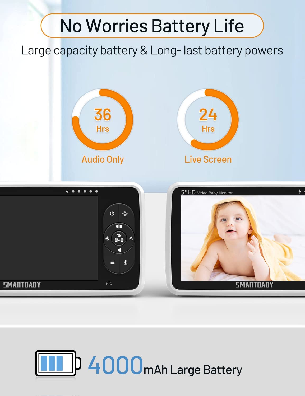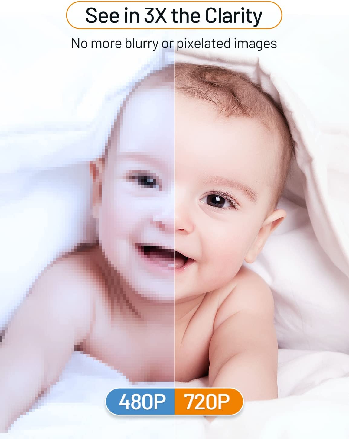 • Baby Essentials for Newborn:View every detail and move of your adorable baby on a large 5” screen in 720P HD clarity baby camera monitor; The premium picture and video quality shows 10 times detail and precision as compared to standard 480P -display baby monitors. The baby video monitor with 4x Digital Zoom tilts 115° and pans 355° to provide an expansive view of the nursery to view your baby .You will never miss any moment of taking good care of your baby.