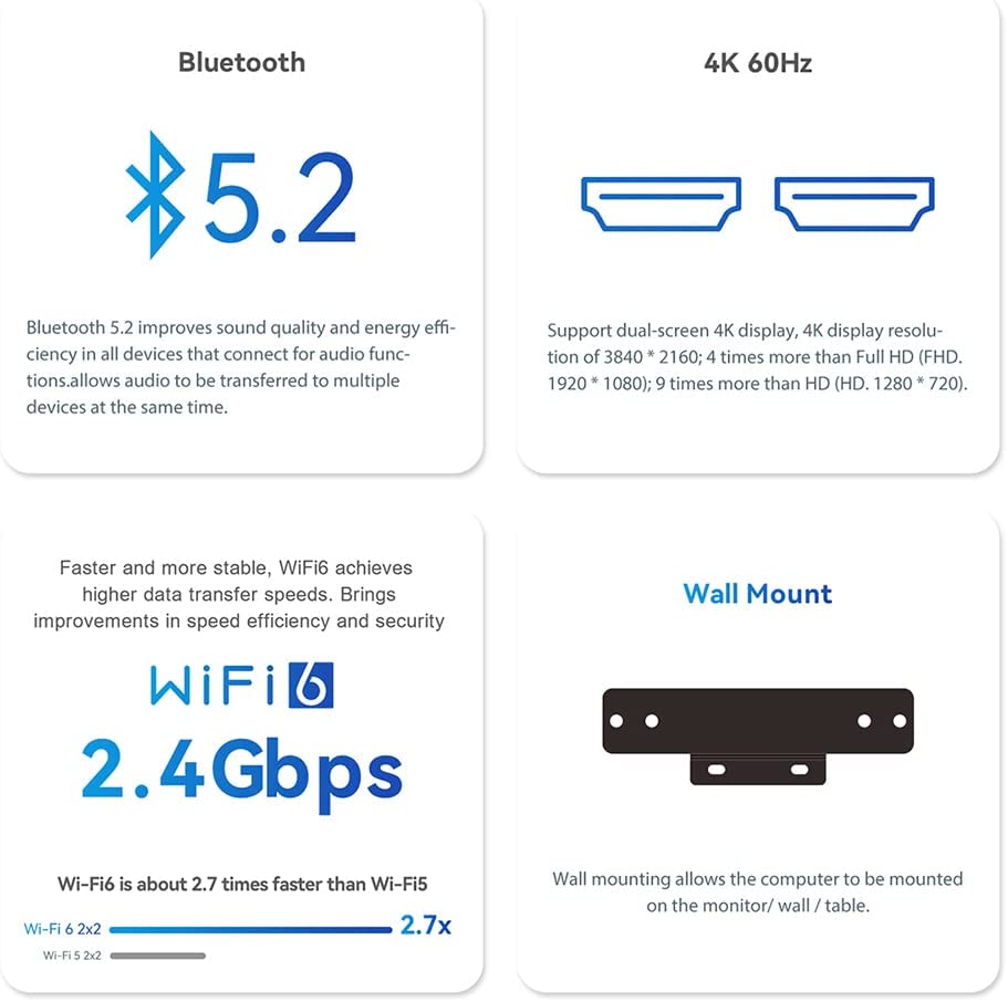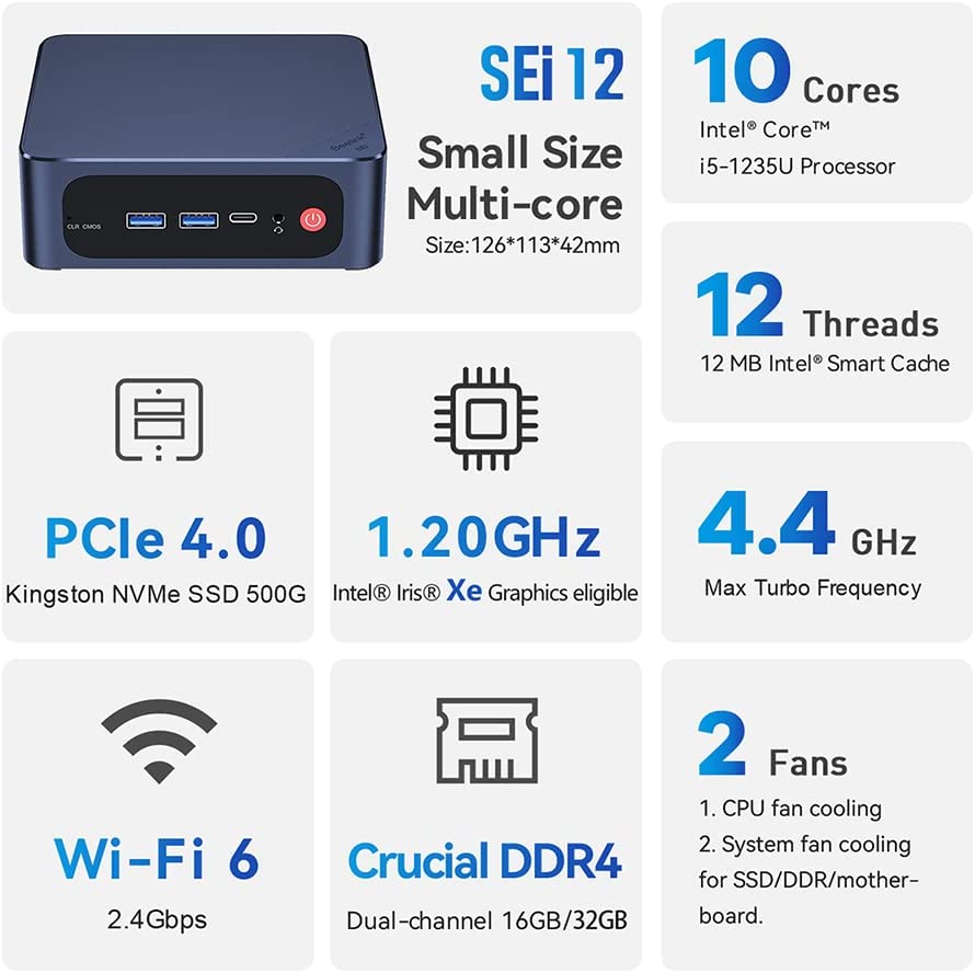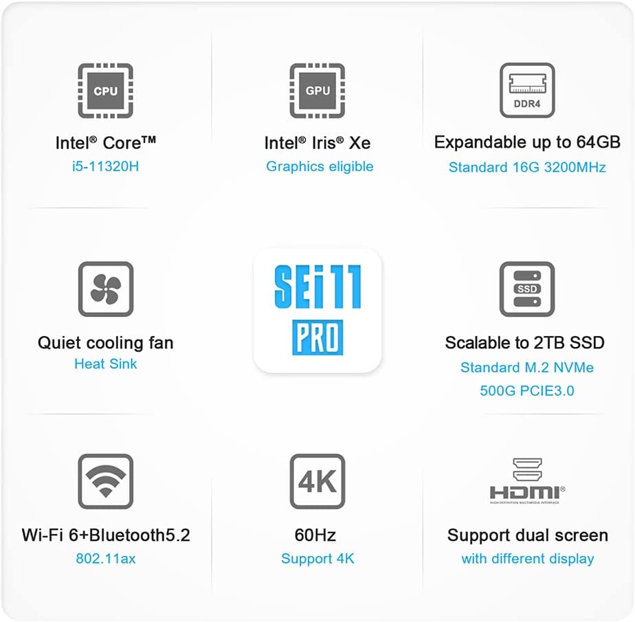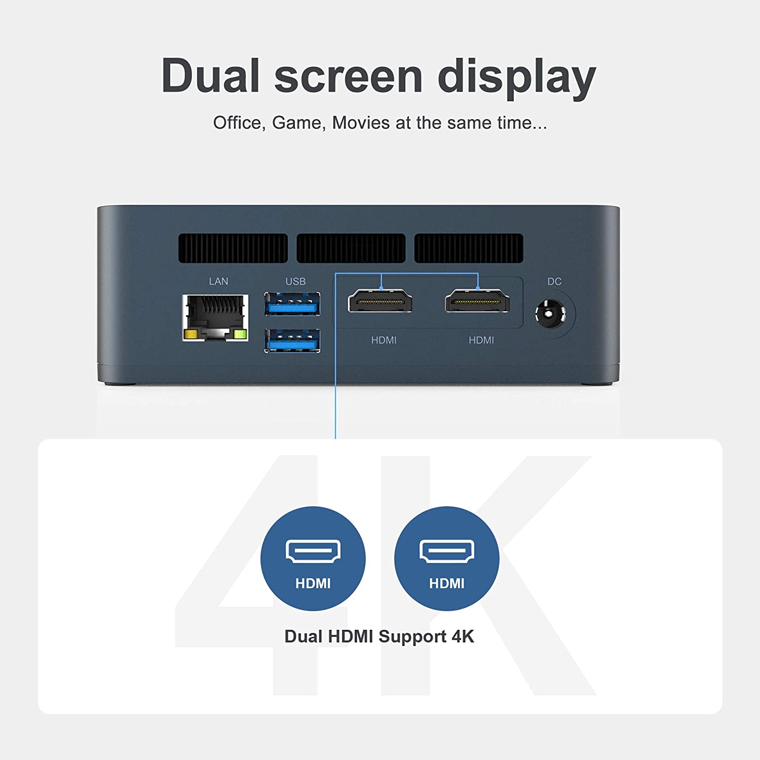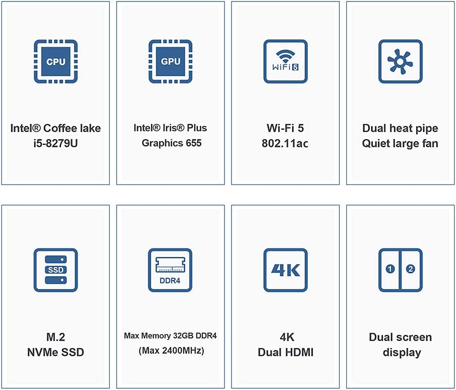 • 【Intel Iris Plus Graphics 655 &Support 4K Dual Screen HD Display】The mini desktop computer SEI8 Supports 4K HD (4096×2304) ultra-high-definition content, 4K@30hz videos play back from Youtube Netflix are always smooth and work well.you can enjoy 4K Web surfing, video playback, watching TV, home theater, and enjoy the entertainment with your family. Dual HDMI Ports .easily connecting 2 monitors, reduce waiting time, efficiency doubled Work.