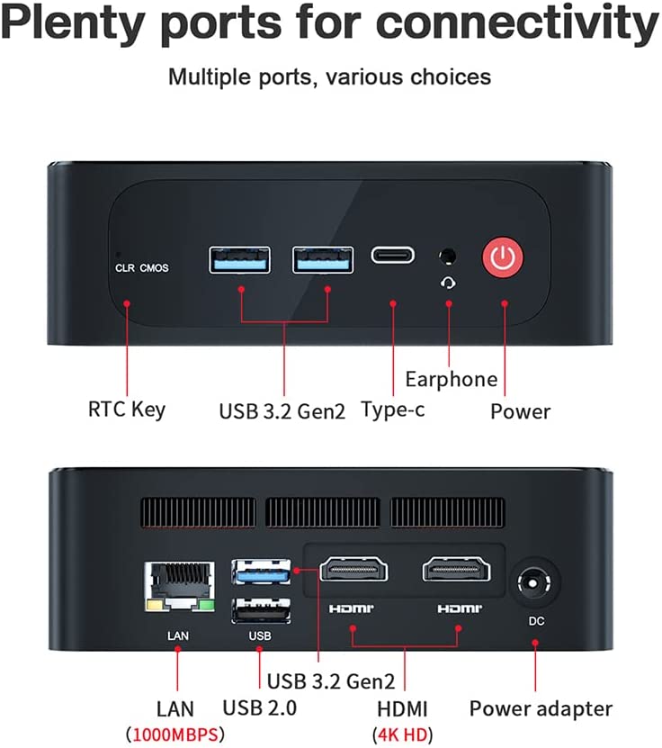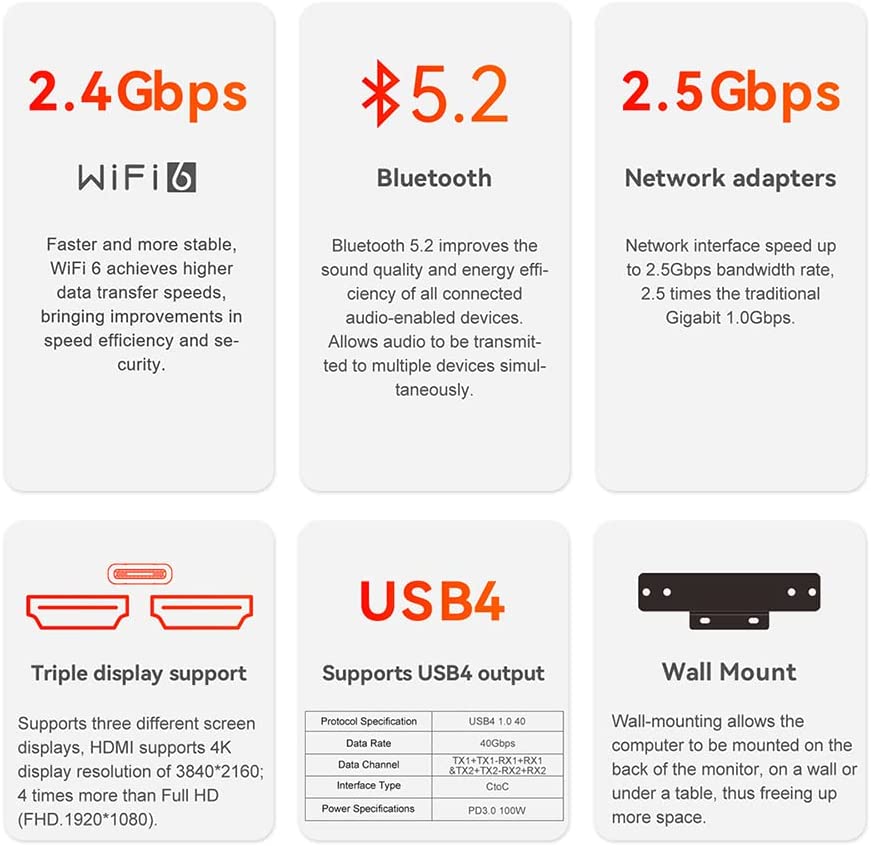 • ?【MULTIPLE INTERFACES & WIRELESS】Beelink Mini PC has a 2.5Gbps Ethernet LAN (RJ-45, Network interface speed up to 2.5Gbps bandwidth rate), 2.4Gbps WiFi6(802.11ax, stronger capacity of resisting disturbance), and built-in Bluetooth 5.2, high-speed wireless connection makes you step ahead. And 3*USB3.2 ports(10Gbps), 1*USB2.0 ports, 2*HDMI ports, 1*USB-C port(USB4 40Gbps), and 1*Audio Jack (HP&MIC), 1*DC Jack, thus offering the user even greater versatility in use.