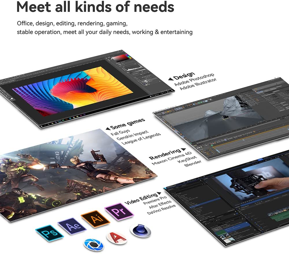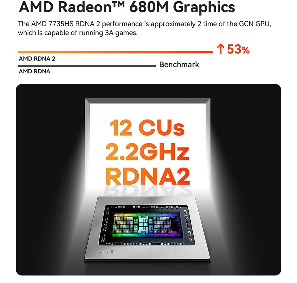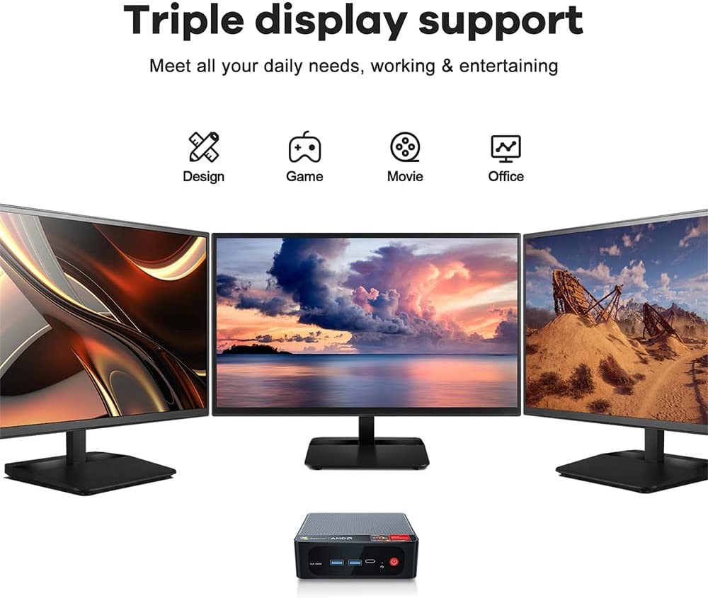 • ?【4K@60HZ HD & TRIPLE DISPLAY】Beelink Mini PC integrates AMD Radeon 680M 12core 2200 MHz GPU to deliver powerful graphics processing power to easily handle the demands of complex design software, 4K@60Hz UHD video editing, and playback, or light gaming. And it can connect 3 screens by 2*HDMI and 1*USB-C, efficiently handle your tasks, and meet your specific needs.