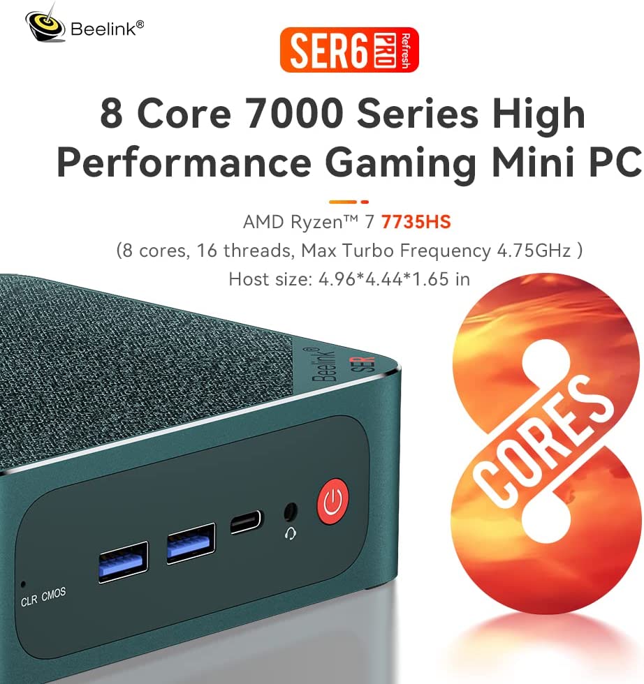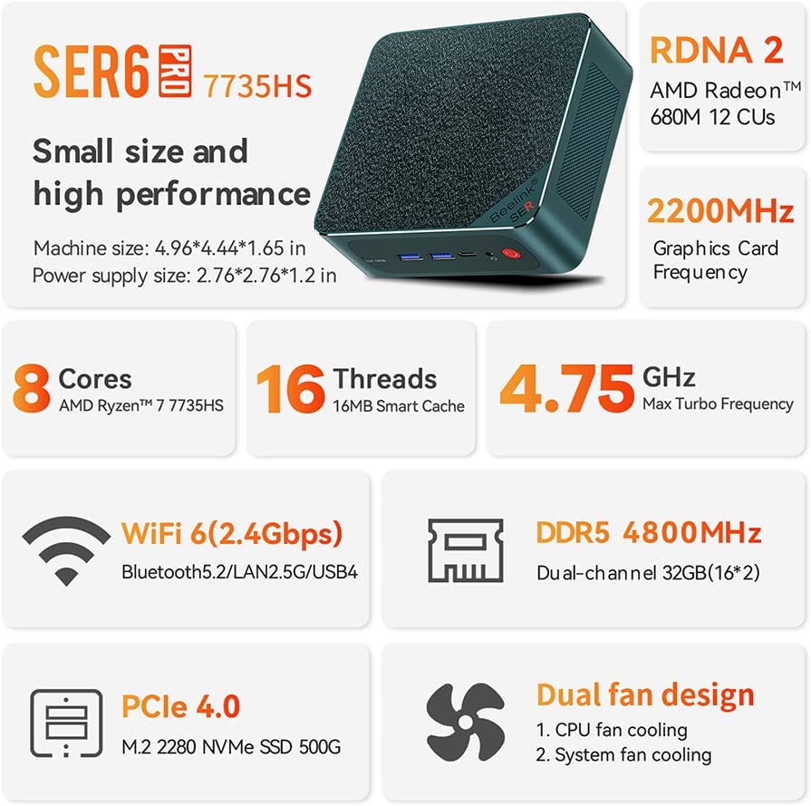 Beelink SER6 Mini PC, AMD Ryzen 7 7735HS(6nm, 8C/16T) up to 4.75GHz, Mini Computer 32GB DDR5 RAM 500GB M.2 NVME SSD, Desktop PC 4K@60Hz Triple Display, Mini Gaming Computer WiFi6/BT5.2/2.5Gbps