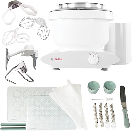 Bosch Universal Plus Stand Mixer with NutriMill Baker's Pack Accessory Bundle including Bowl Scraper, Cookie, and Cake Paddles, Icing Kit, and Silicone Cookie Sheet Liners