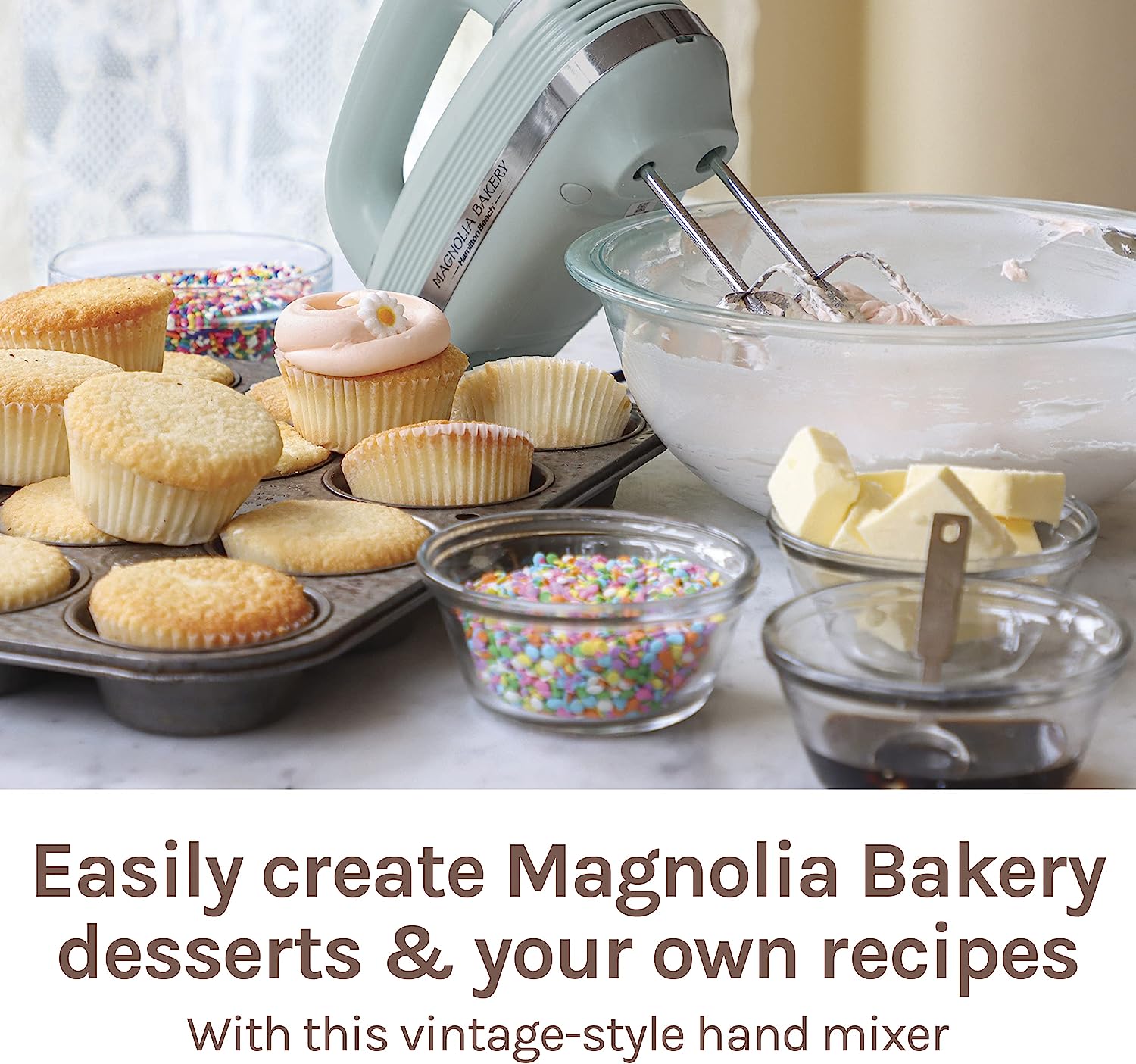Make Magnolia Bakery desserts and your own favorite recipes at home with this vintage-style Magnolia Bakery Hand Mixer by Hamilton Beach. Its powerful DC motor and 5 speeds provide effortless mixing for cupcakes and more. Storage case included.