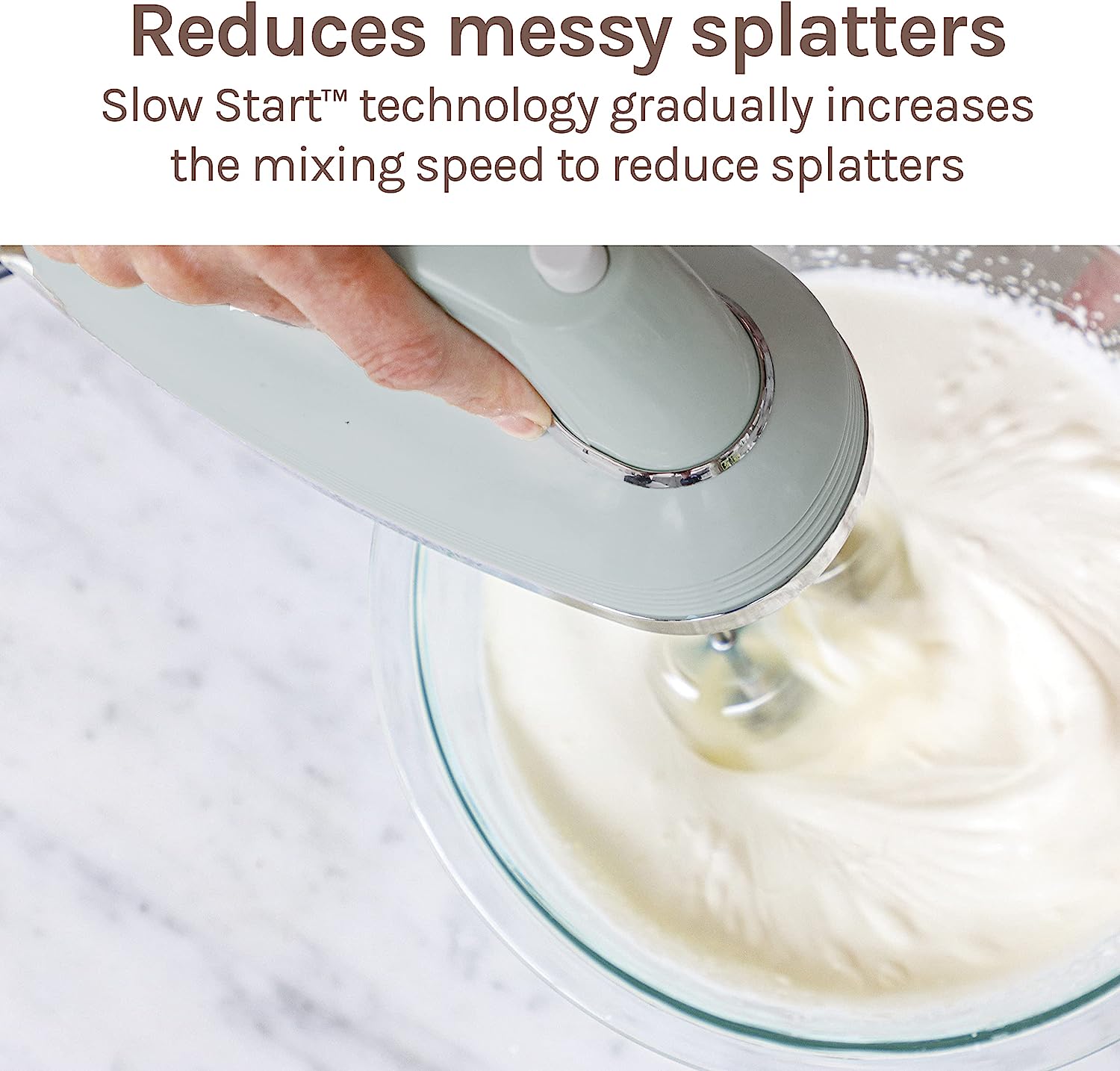 • SLOW START TECHNOLOGY GRADUALLY INCREASES MIXING SPEED. Prevent clouds of flour or splatters of batter by starting slow. This electric hand mixer's starting speed is nearly half as slow as a traditional mixer, so you can add ingredients gradually.
