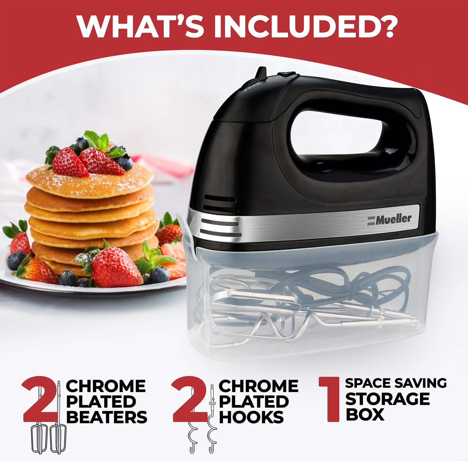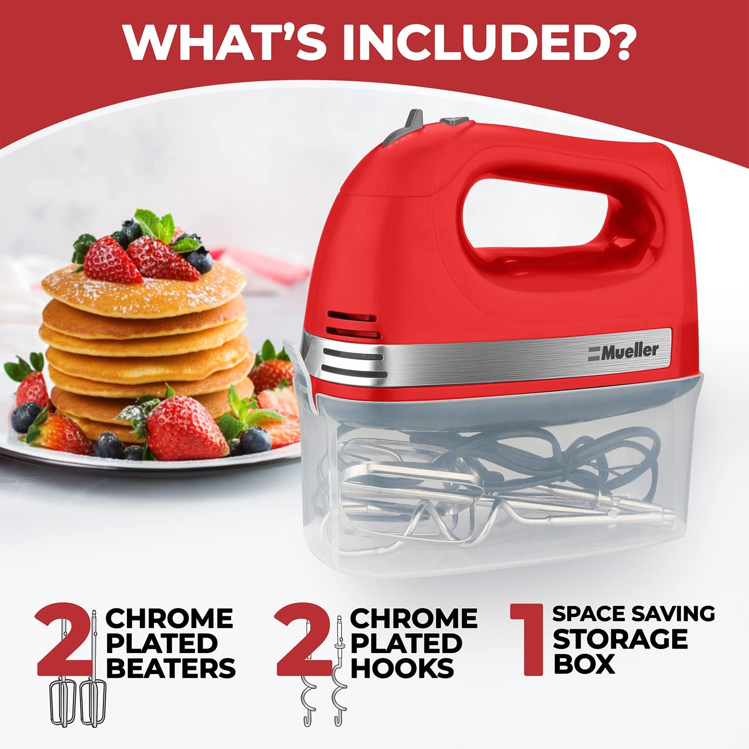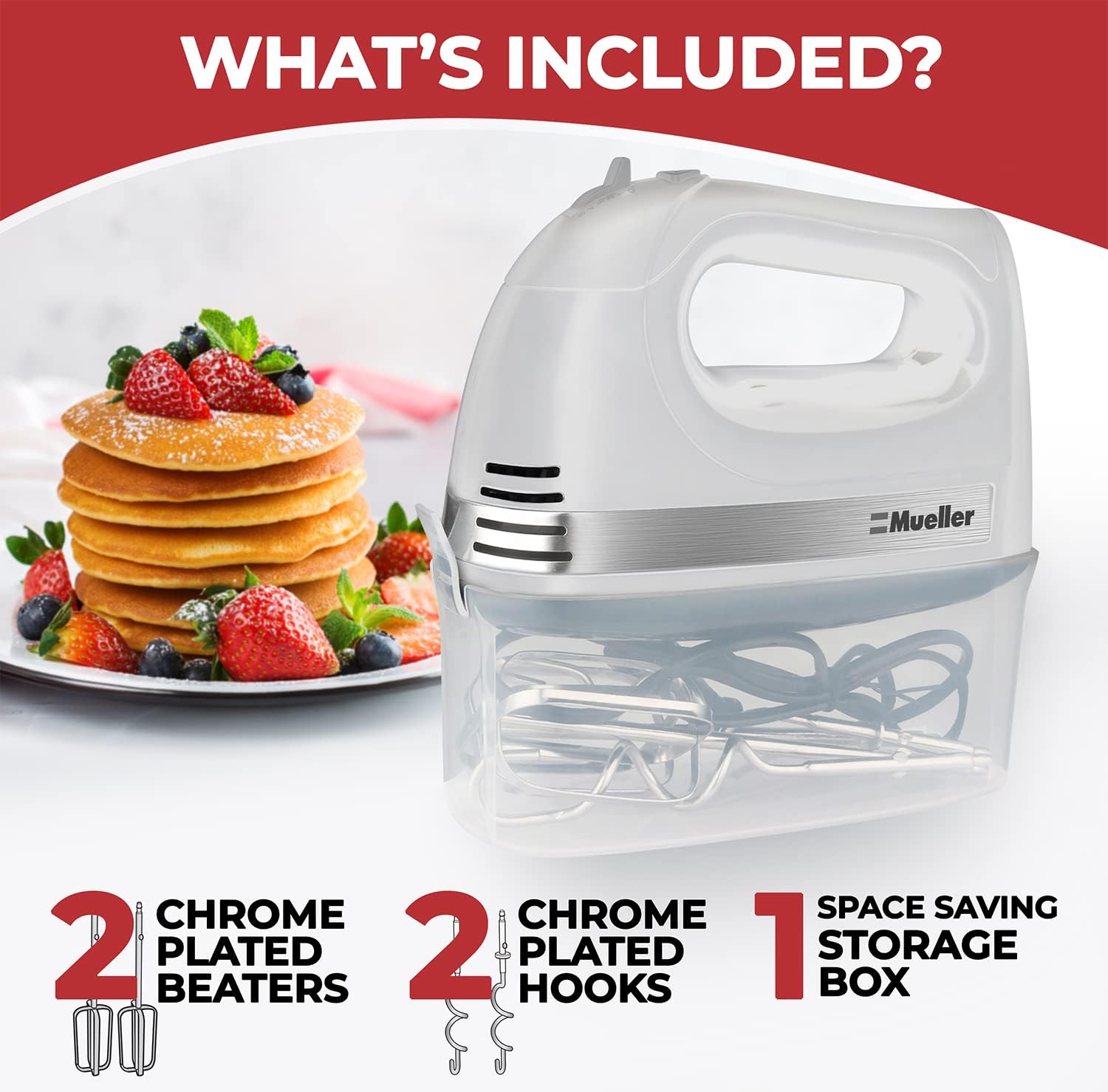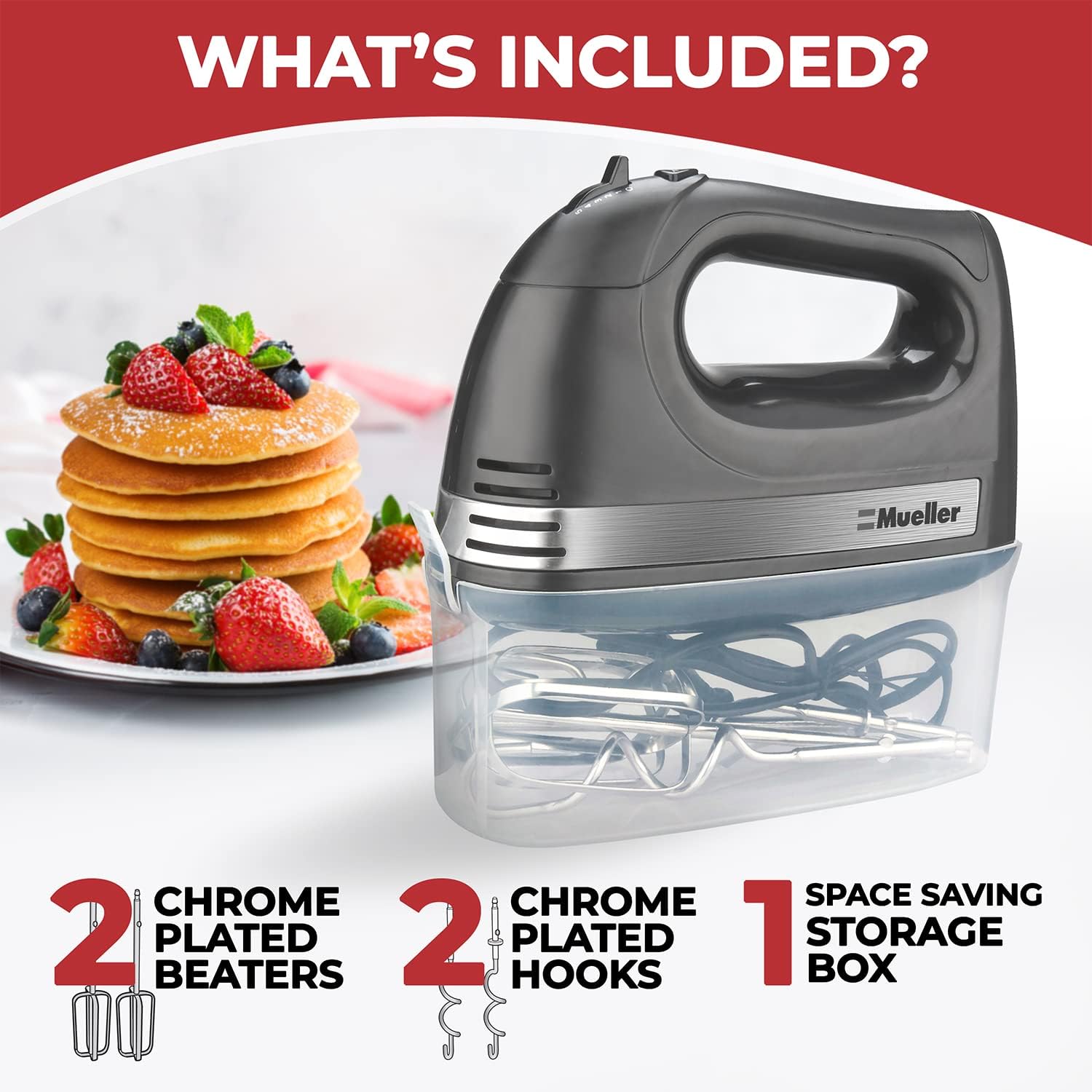 Mueller Electric Hand Mixer, 5 Speed 250W Turbo with Snap-On Storage Case and 4 Stainless Steel Accessories for Easy Whipping, Mixing Cookies, Brownies, Cakes, and Dough Batters