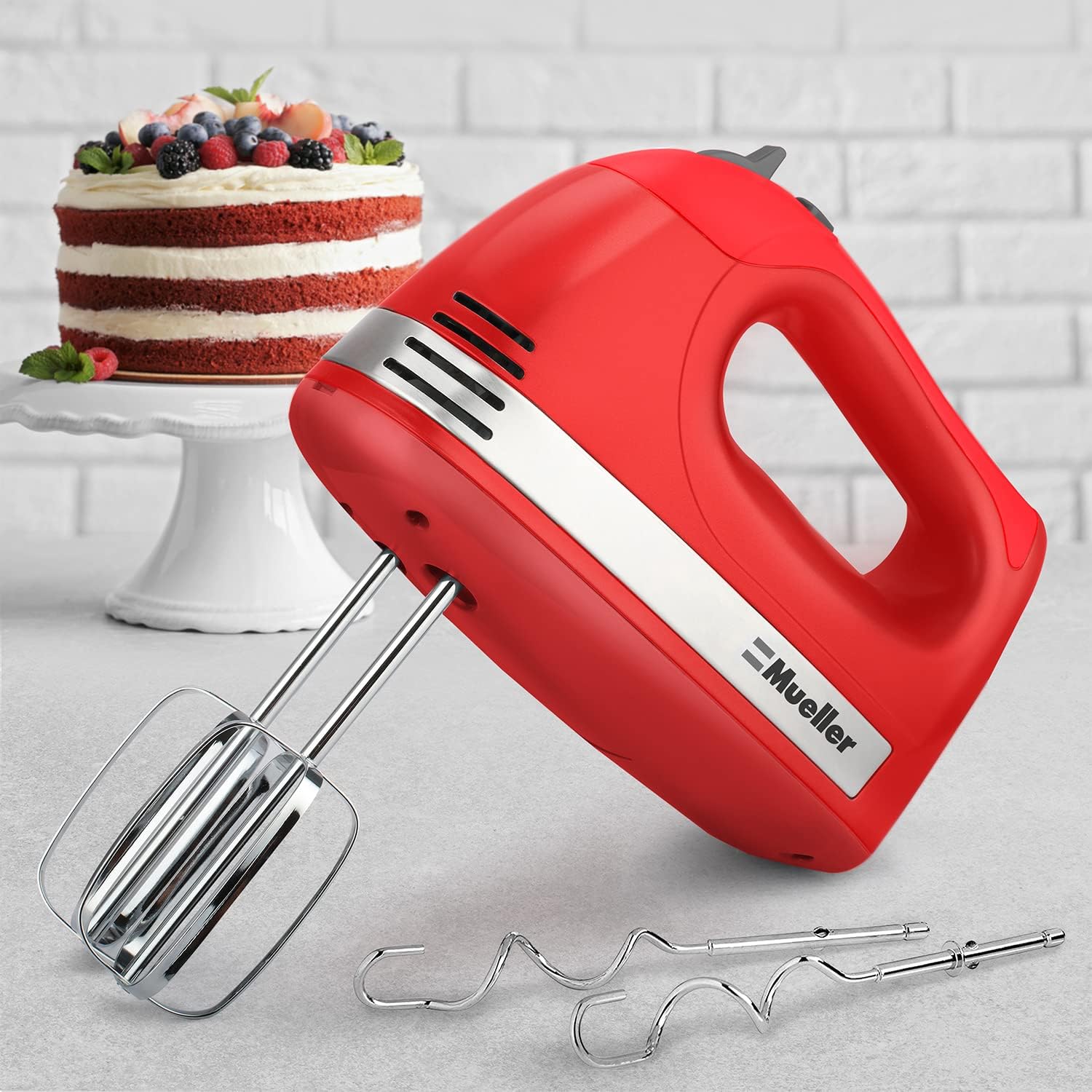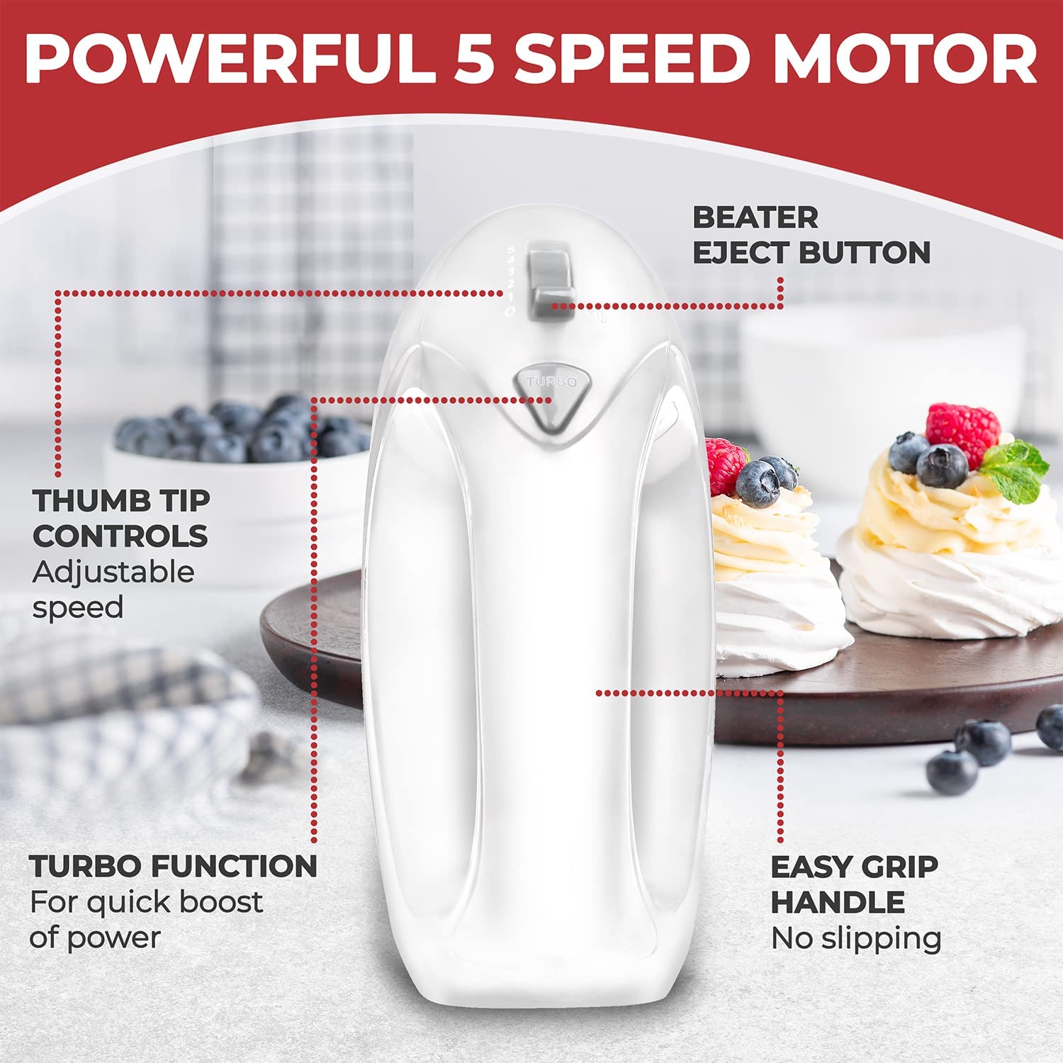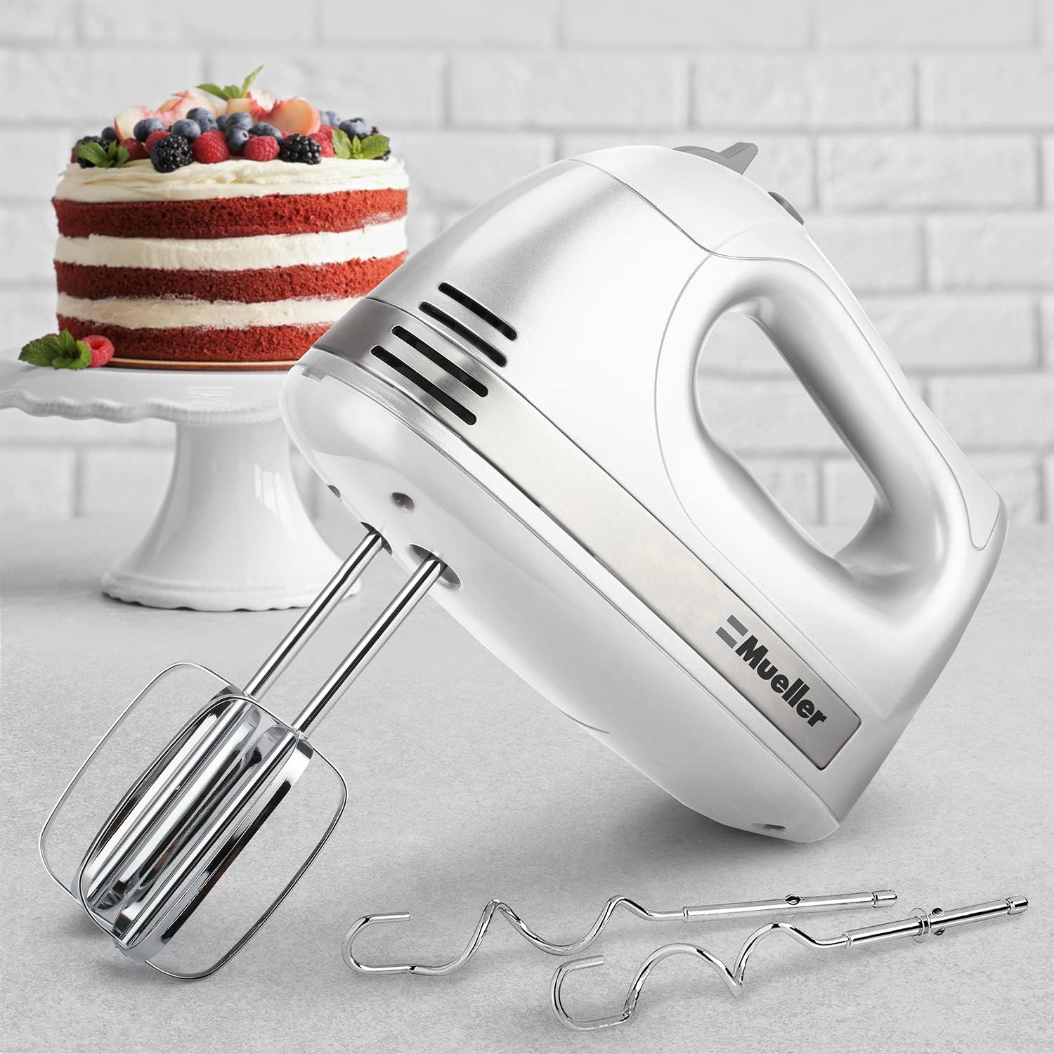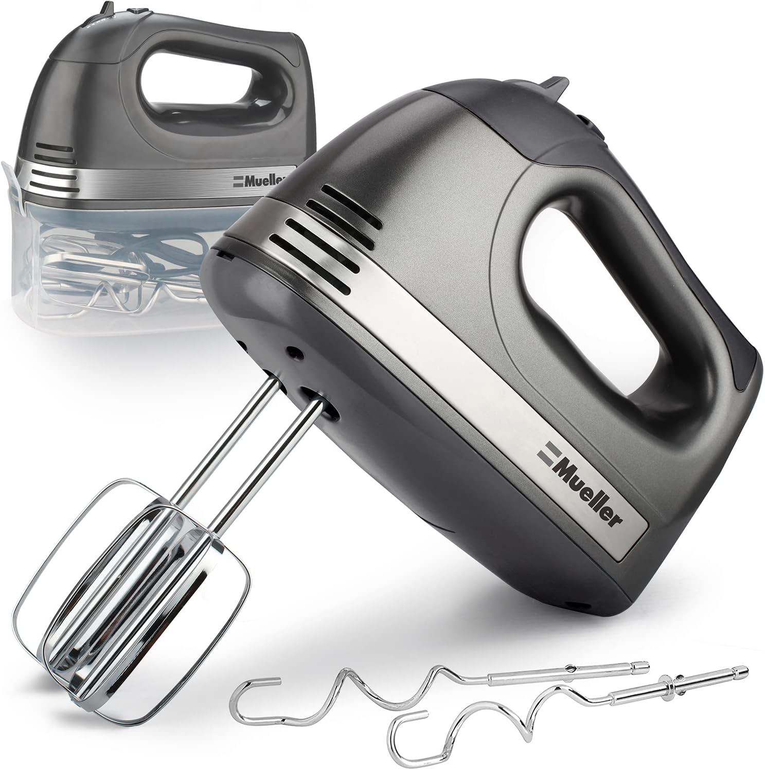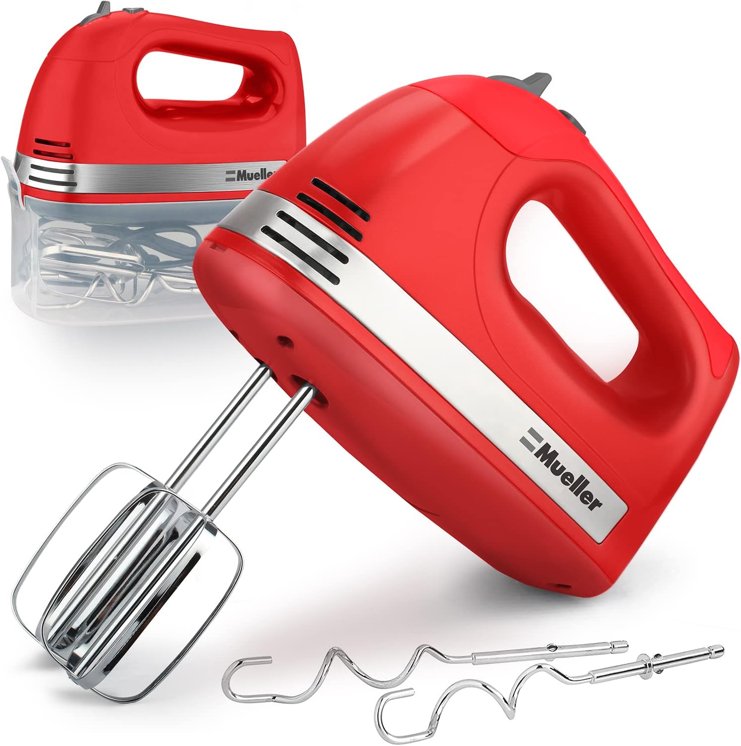 Mueller Electric Hand Mixer, 5 Speed 250W Turbo with Snap-On Storage Case and 4 Stainless Steel Accessories for Easy Whipping, Mixing Cookies, Brownies, Cakes, and Dough Batters