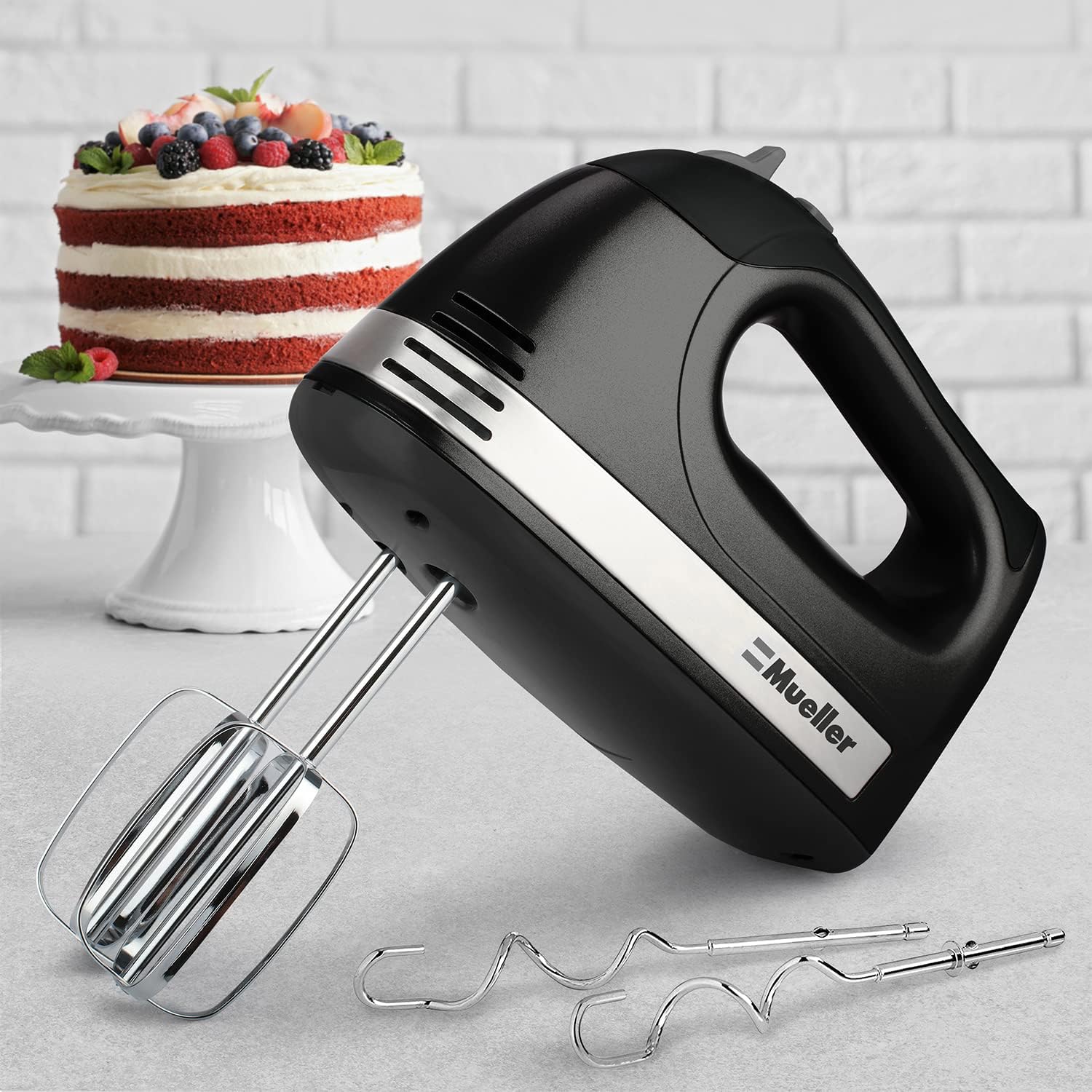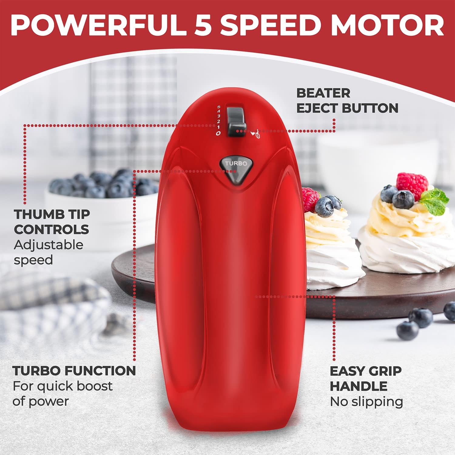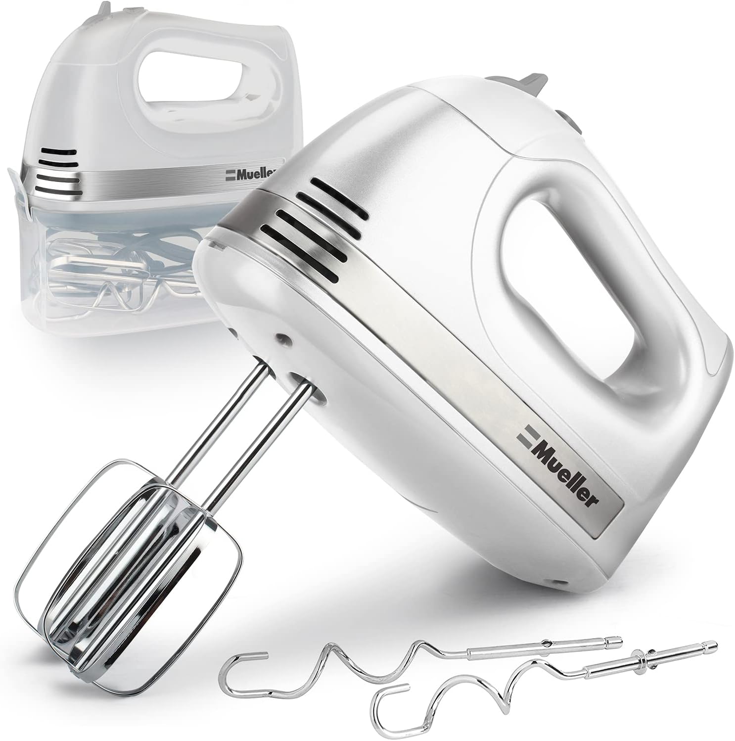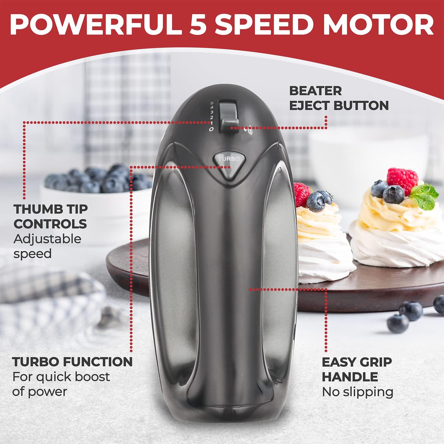 Mueller Electric Hand Mixer, 5 Speed 250W Turbo with Snap-On Storage Case and 4 Stainless Steel Accessories for Easy Whipping, Mixing Cookies, Brownies, Cakes, and Dough Batters