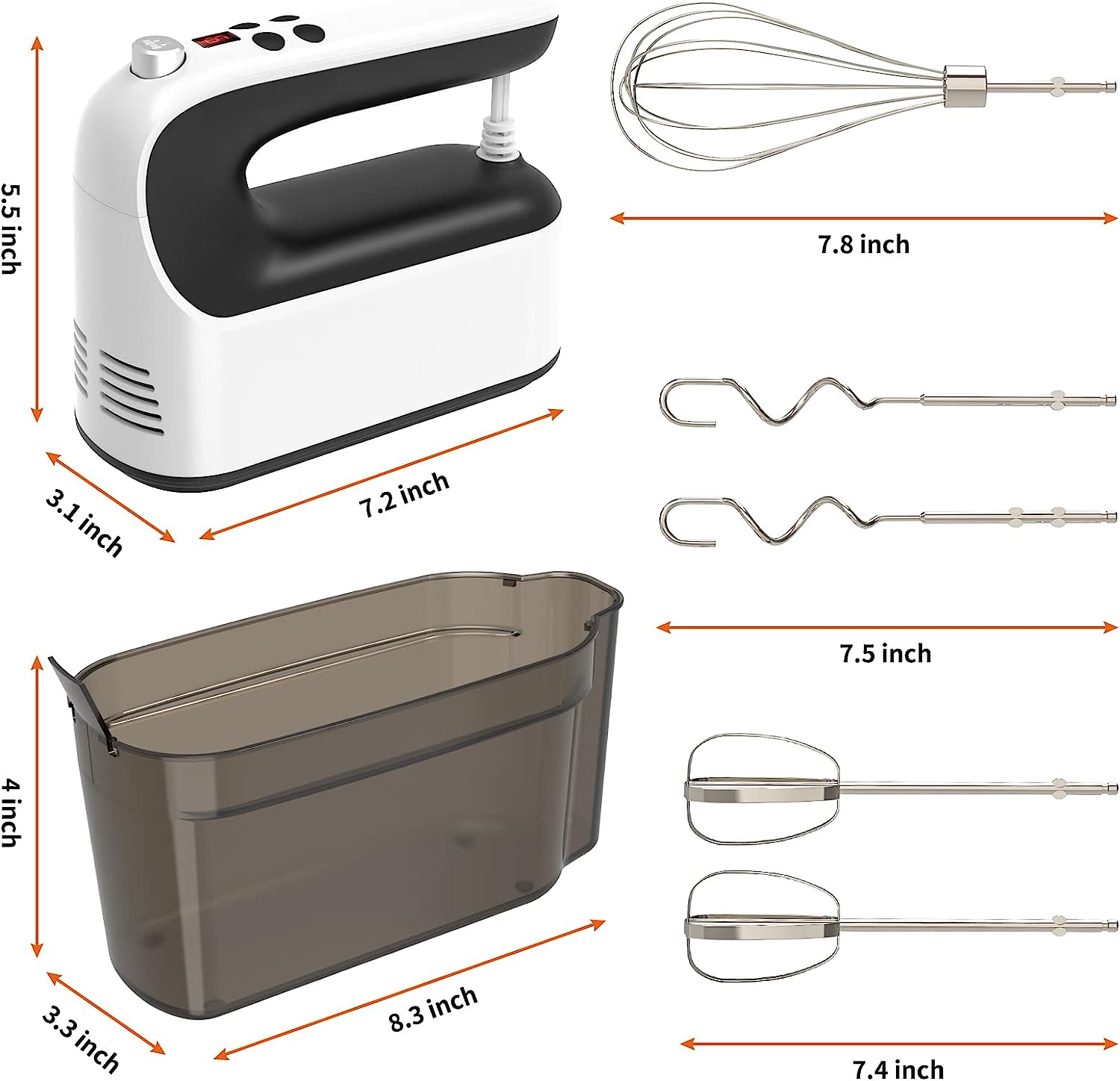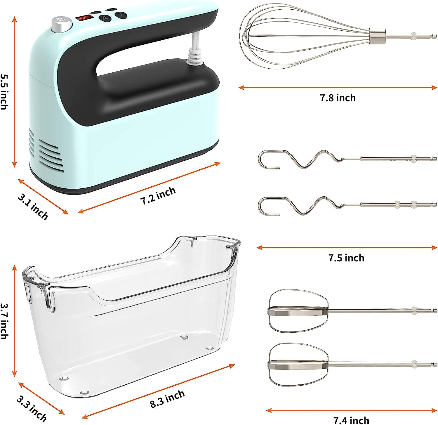 • ?『What you get?』1x Yomelo electric hand mixer, 304 Stainless Steel: 2x Flat Beaters, 2x Dough Hooks, 1x Net Whisk, 1x Storage box, 3 Years warranty, and lifetime customer service. This handheld electric mixer that anyone who loves to bake would be very happy to receive as a holiday gift!