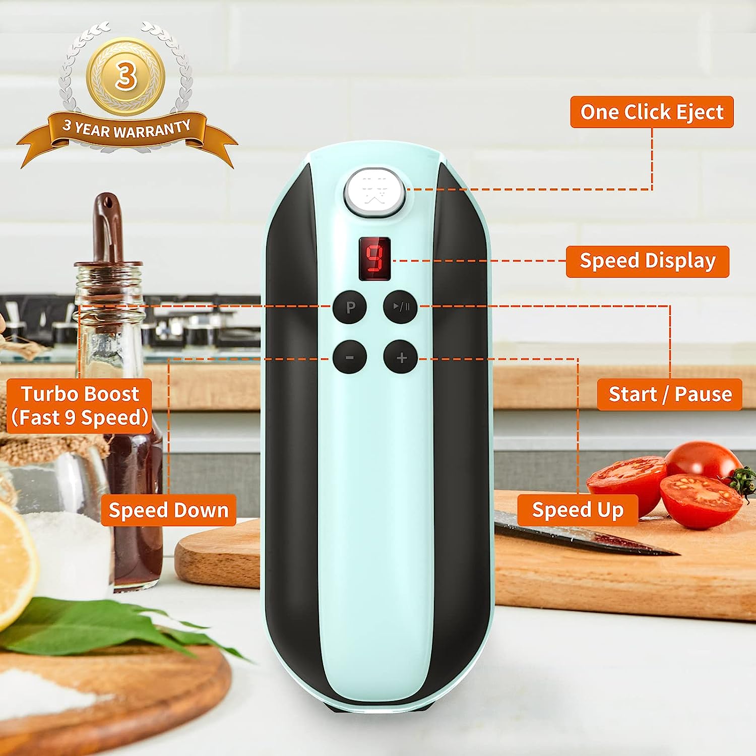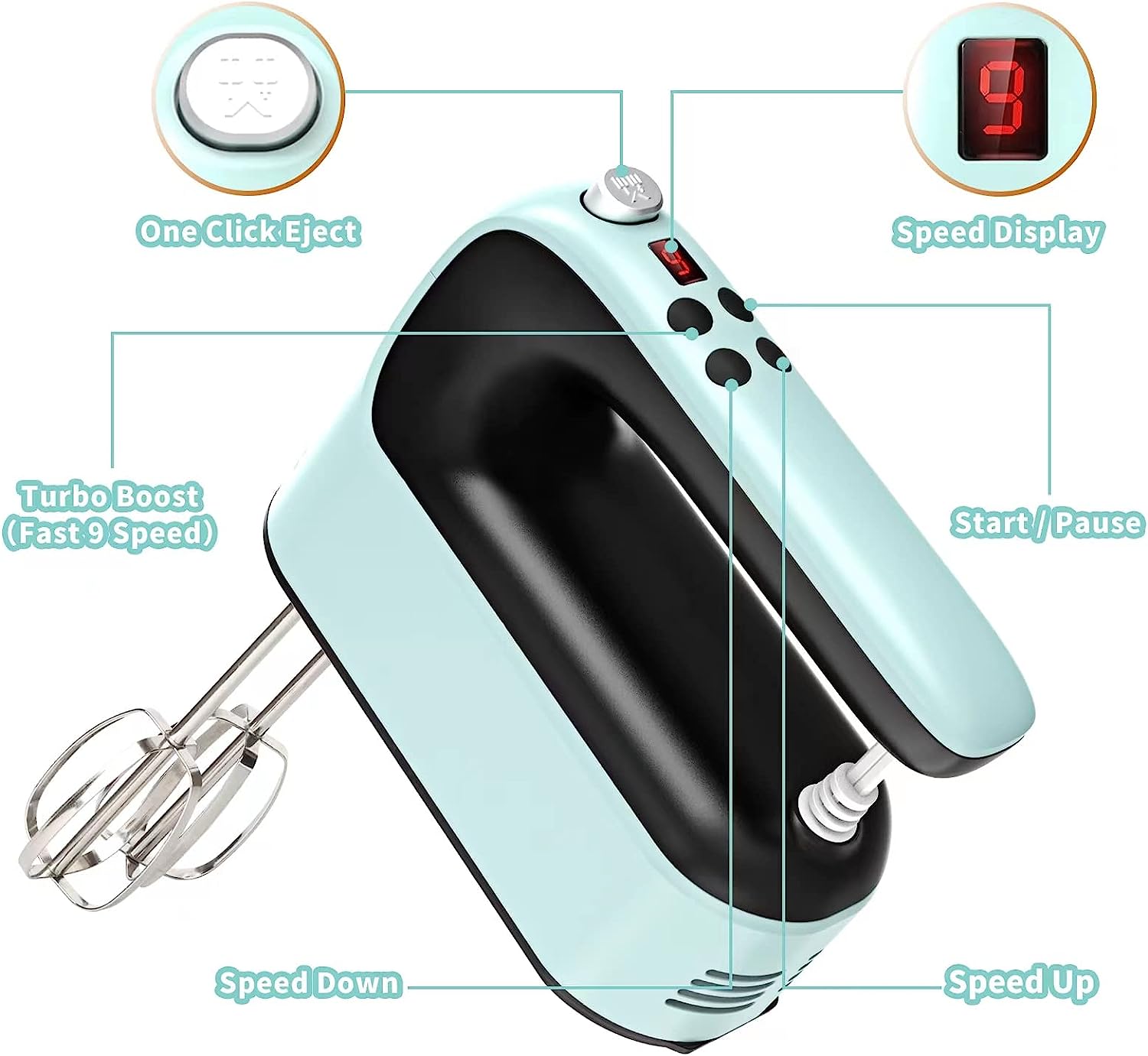 Yomelo 9-Speed Digital Hand Mixer Electric, 400W Powerful DC Motor, Baking Mixer Handheld with Snap-On Storage Case, Touch Button, Turbo Boost, 5 Stainless Steel Accessories, Flat Beaters, Dough Hooks, Whisk (Ice Blue)