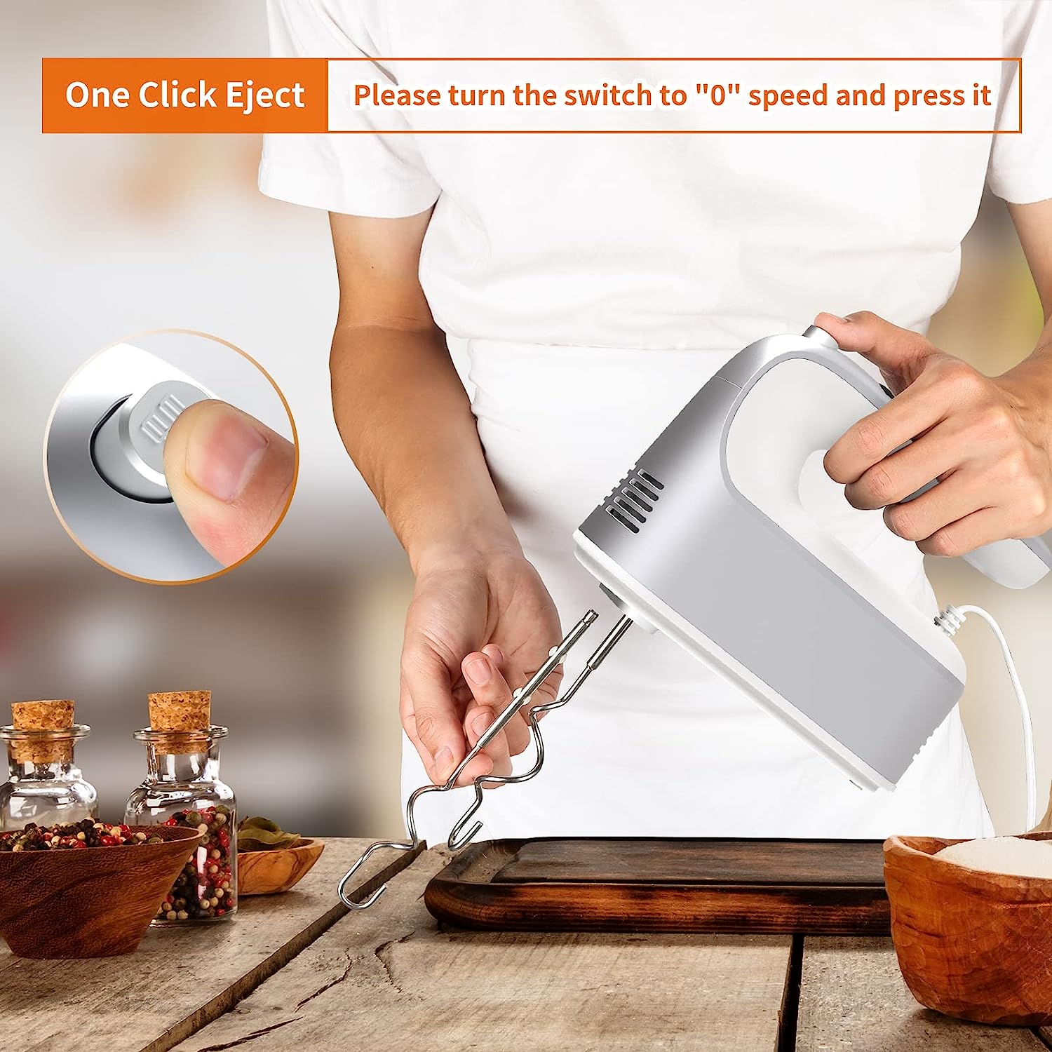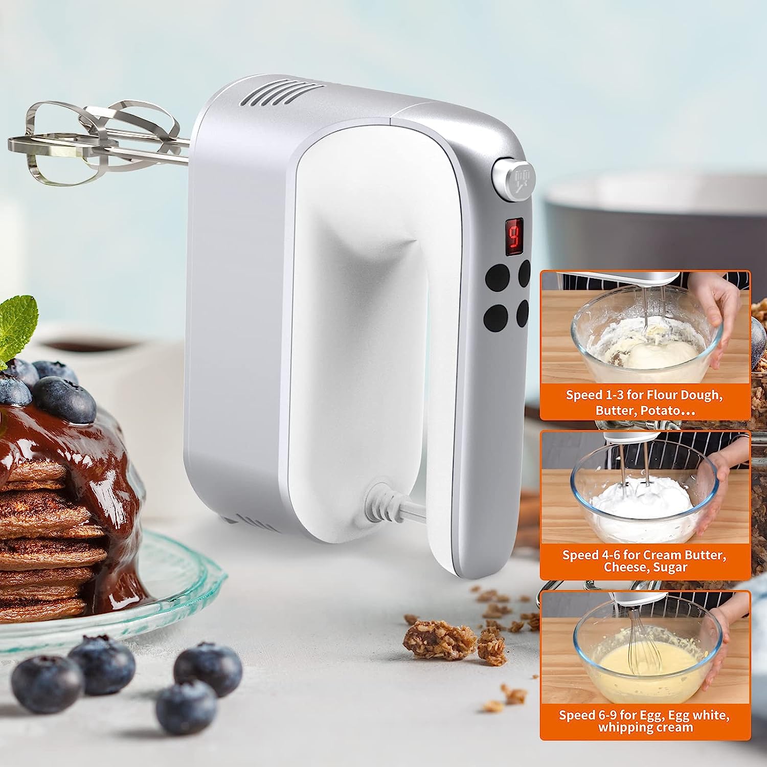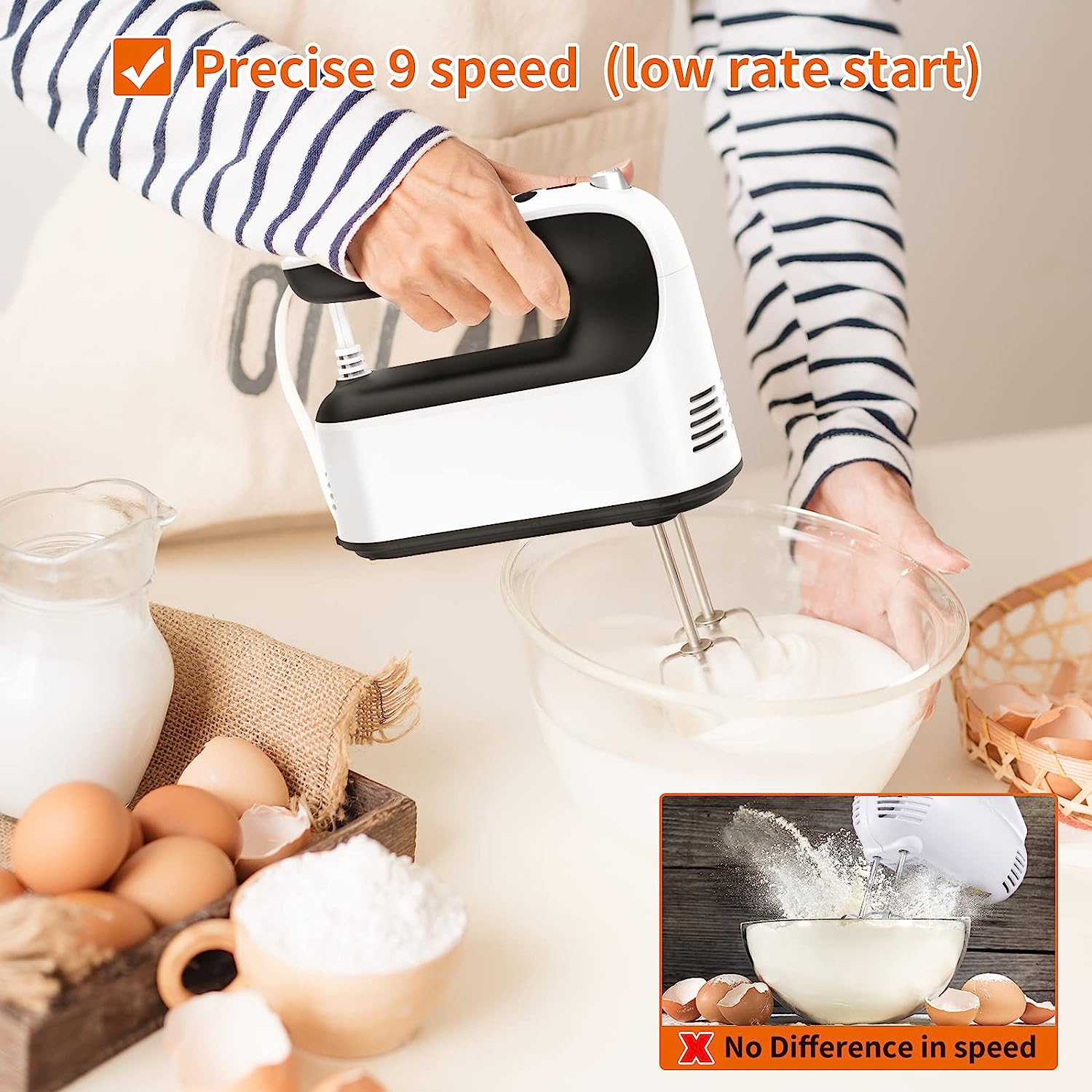• ?『Precise 9 Speed & 400 Watt』9 different speed settings: well-defined speed control for any recipes. Starting from the slowest “1” speed to mix chunky ingredients such as dough, cookies, even shredding cooked chicken or potatoes to the fastest “9” speed to perfectly whipping your egg, egg whites, cream, etc. Built-in 400 Watt DC motor has a strong torque force don’t worry about struggling in the dough.