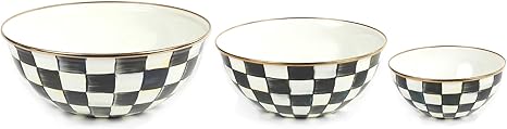 MACKENZIE-CHILDS Enamel Mixing Bowl Set, Small 5-Cup, Medium 10-Cup, and Large 16-Cup Serving Bowls for Entertaining, Set of 3, Black-and-White Courtly Check