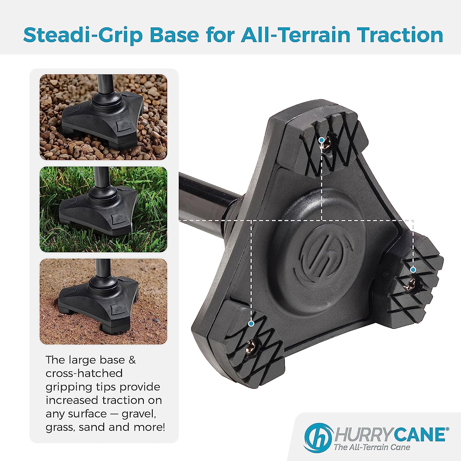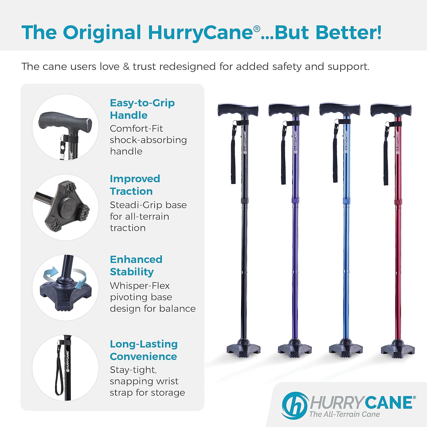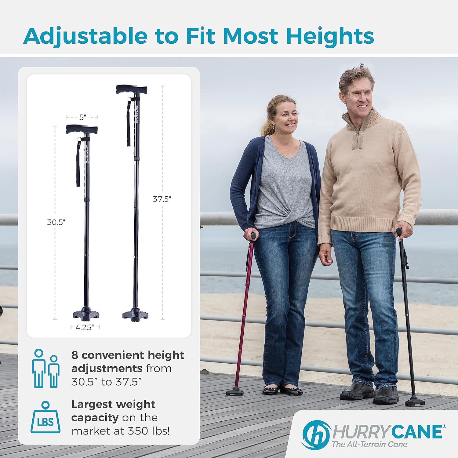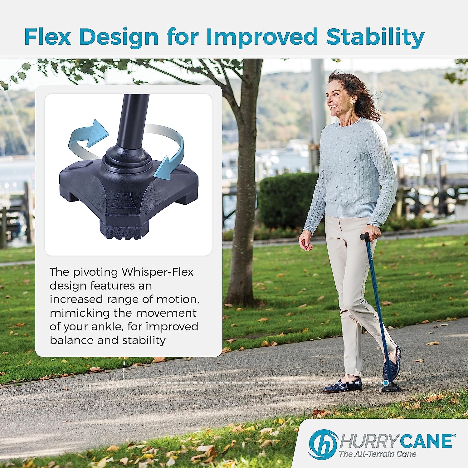 The #1 selling cane for women and men on Amazon just got better! This is the same walking cane for women and men that’s featured on National television! The Freedom Edition includes a re-designed foot locking system with a WhisperFlex base design, for a smooth and silent pivot. Inspired by the Most Advanced Machine on Earth: The Human Body. We built our canes for women and men from the ground up to feel like an extension of the body. Engineered with four critical innovations: 1. Stabilizes like a foot: Just like the human foot, our walking canes for men and women give you three points of contact for superior balance and stability. It naturally simulates your instinctive walking motion to provide you firm footing on any surface. Whether you’re sitting or standing, the SteadiGrip base gives you more traction at any angle. 2. Pivots like an ankle: The ankle is the most complex joint in the body because it has the trickiest job: Supporting your full weight while giving you the flexibility to walk, run, and turn on a dime. Our walking canes for women and men automatically pivot to help you maintain your balance on inclines, uneven ground, and shifting terrain. We designed our walk cane’s proprietary pivoting head to meet the same demanding standards - and it does it all, automatically. 3. Bends like a knee: Your knees bend to help you get in and out of restrictive places like cars. But our folding canes for women and men are even better: Instead of one joint, you get two! When you need to store our quad canes for women and men in a purse, glove box, or beneath a chair, the HurryCane folds up in seconds to one-third its normal size. And when you need, it flips out instantly. While our cane has two joints, it’s still strong and sturdy enough to be pressure-tested to support 350 pounds. 4. Changes in height: People come in all different heights. With just the push of a button, it instantly adjusts to eight convenient heights, ranging from 30.5” to 37.5". To enhance your mobility experience add these HurryCane Accessories: HurryCane Replacement Feet the Heavenly Handle.