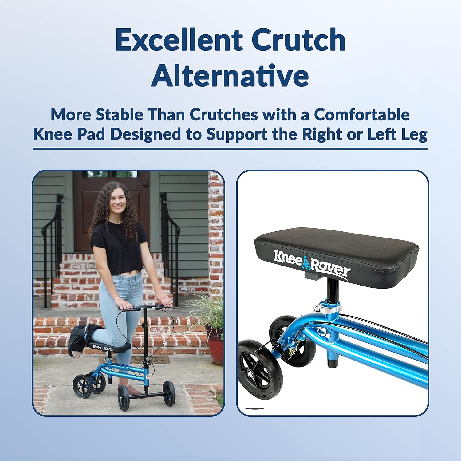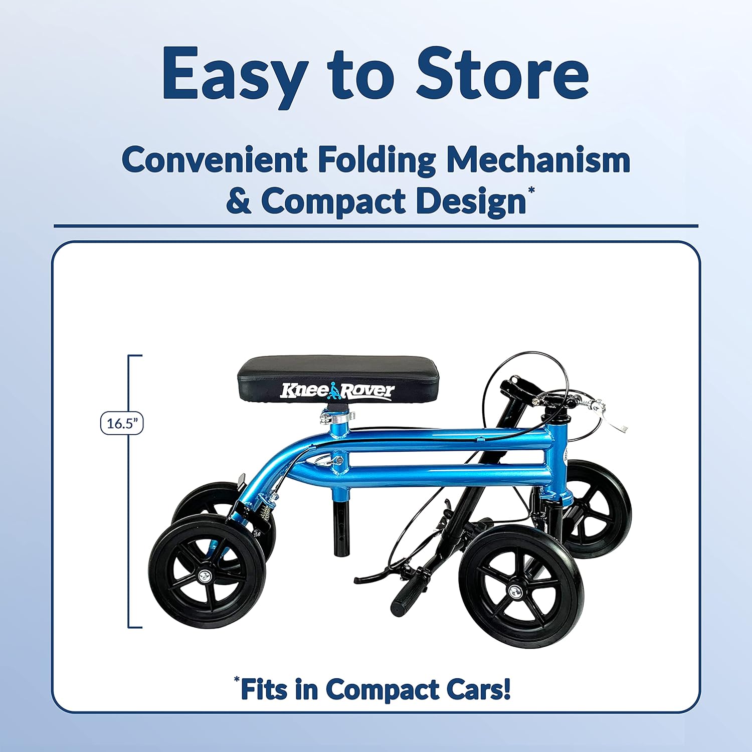Compatible with both the right and left legs, the KneeRover Economy Knee Scooter kneeling walker is lightweight and portable thanks to its simple folding mechanism that utilizes an easy to use thumb-release lever. Additionally, these knee walkers feature tool-free assembly and setup.