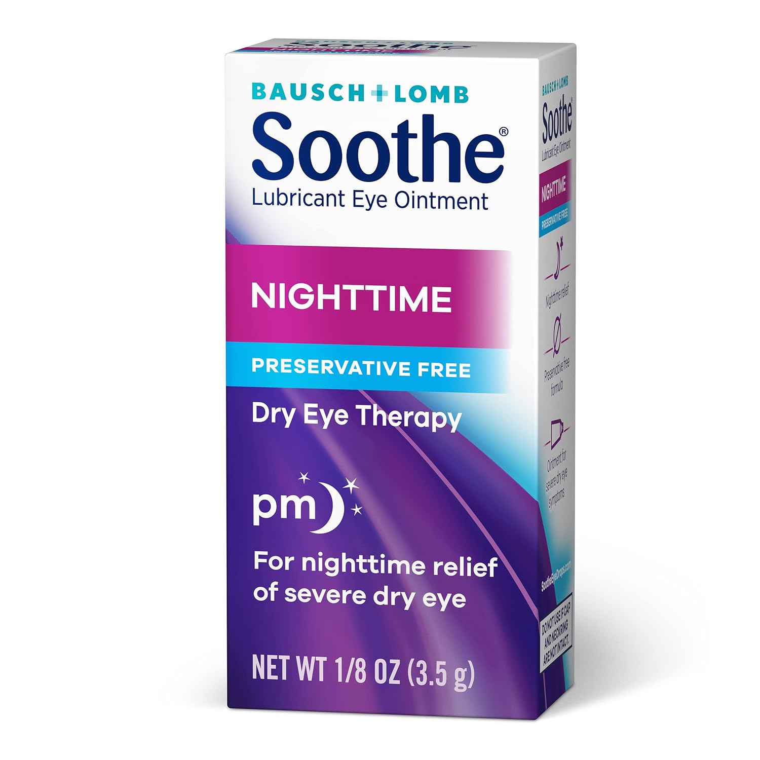 Soothe Preservative-Free Lubricant eye ointment by Bausch + Lomb is designed to provide relief for those who suffer from dry eye syndrome or experience dry, irritated eyes due to environmental factors such as air conditioning or computer use. The formula helps restore the moisture balance in your eyes, providing long-lasting hydration and soothing overnight. This product is sterile and free of preservatives, making it suitable for people with sensitive eyes. Soothe nighttime eye ointment is gentle enough for sensitive eyes and provide long-lasting relief from dry eyes and protects against further irritation. This ointment is easy to use. Simply pull down the lower lid of the affected eye(s) & apply a small amount(1/4 inch) of the ointment to the inside of the eyelid. Apply one or more times daily as needed. Remove contact lenses before using. Bausch + Lomb is a trusted and well-known brand in eye care, providing high-quality products for customers.