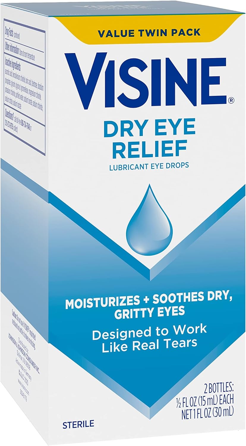 Visine Dry Eye Relief Lubricant Eye Drops to Moisturize and Soothe Irritated, Gritty and Dry Eyes, Designed to Work Like Real Tears, Polyethylene Glycol 400, Twin Pack, 2 x 0.5 fl. oz