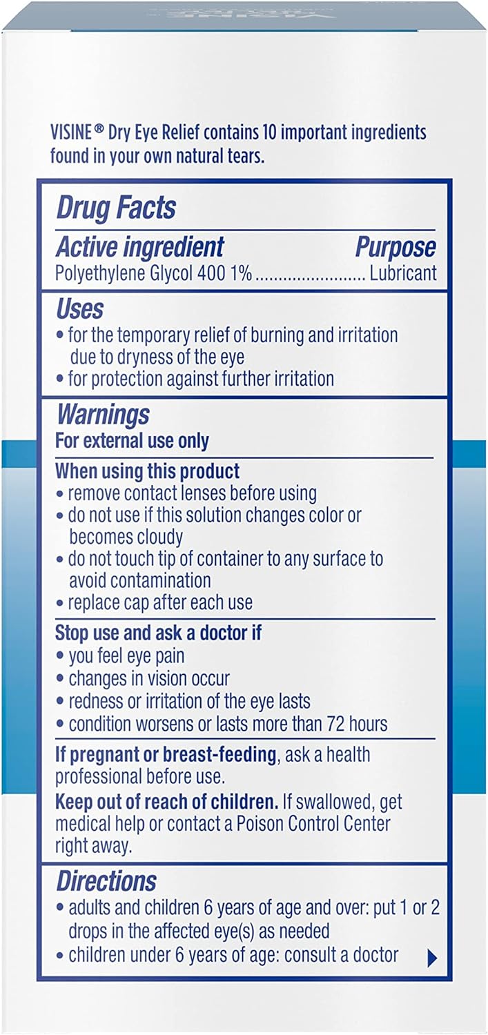 Use Visine Dry Eye Relief Lubricant Dry Eye Drops to moisturize and soothe dry, gritty eyes. These dry eye drops are designed to work like real tears to moisturize and soothe, as well as to protect against further eye irritation. Formulated with the lubricant polyethylene glycol 400, these hydrating eye drops provide soothing relief. Whether eyes are dry from riding on an airplane, screen time irritation, or sitting in an air-conditioned room, these sterile lubricating eye drops feature a hydrating formula for effective relief. From Visine, a brand backed by 60 years of expertise, these moisturizing eye drops help provide dry eye relief on-the-go and are available in a small bottle that slips easily into a bag or purse, so you can soothe your dry eyes anywhere.