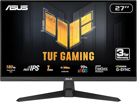 ASUS TUF Gaming 27Š—� 1080P Monitor (VG279Q3A) Š—– Full HD, 180Hz, 1ms, Fast IPS, Extreme Low Motion Blur Sync, FreeSync Premium, G-SYNC Compatible, Variable Overdrive, 99% sRGB, DisplayPort, HDMI