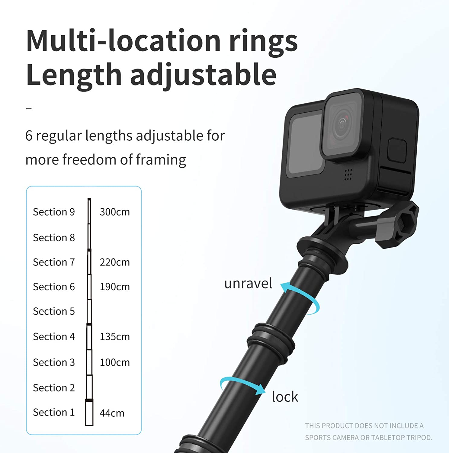 Extendable at more than 6 Lengths 44cm/17.3", 100cm/39.4", 135cm/53.15", 190cm/74.8", 225cm/88.6", and the longest 300cm/118"br>Made in Upgraded Carbon Fiber Material which makes it as lightweight as possible at 300g/0.66lbs, very easy to carry out for traveling!