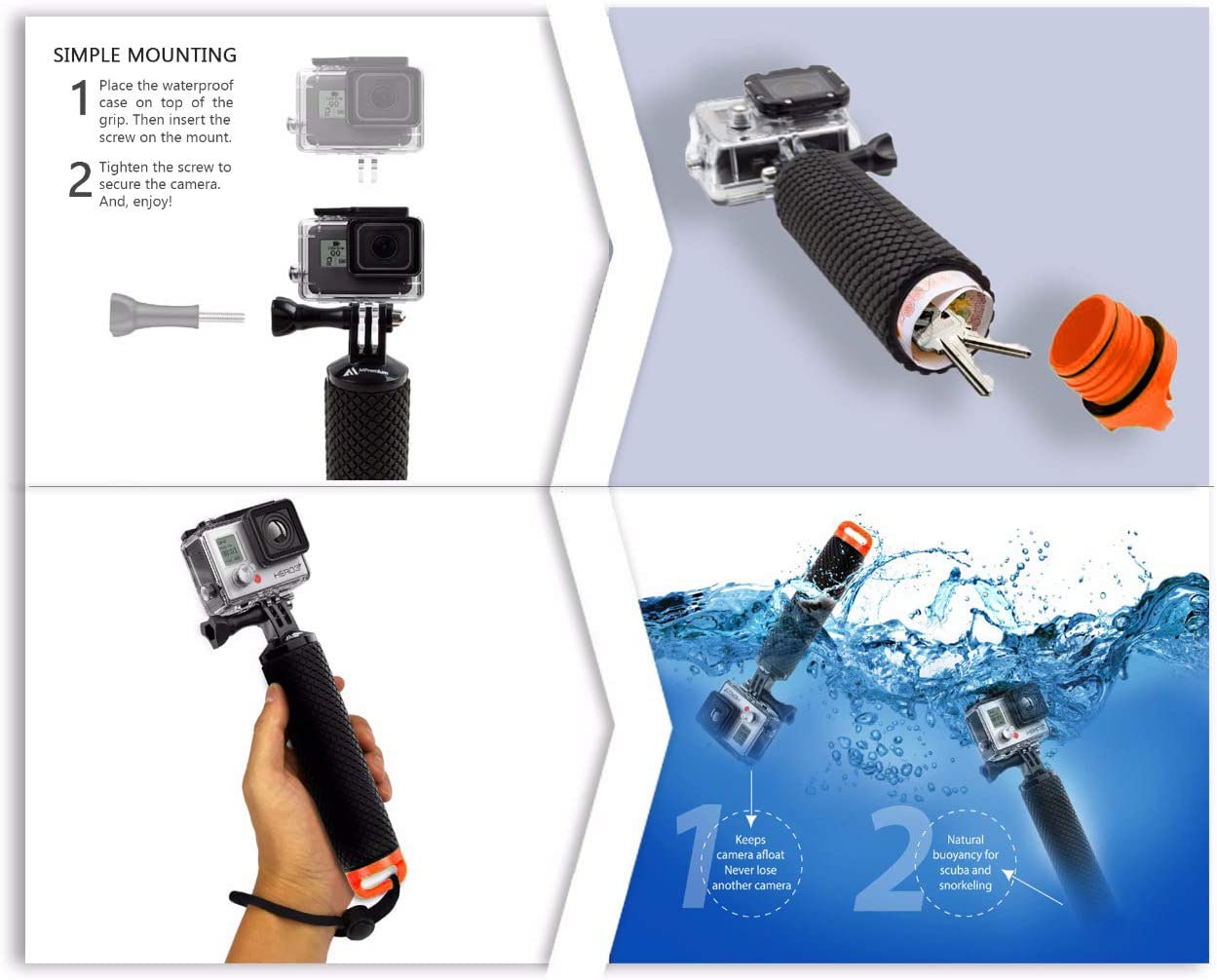 • ►NEVER LOSE ANOTHER GOPRO CAMERA - The floaty body design of the handler will keep the camera on the water surface and prevent it from drowning. The bright orange color cup at the bottom of the handle allows for increased visibility, easy spotting and retrieval in water. Perfect for photography during deep sea diving, snorkelling, scuba diving, swimming, surfing and other water sports activities.
