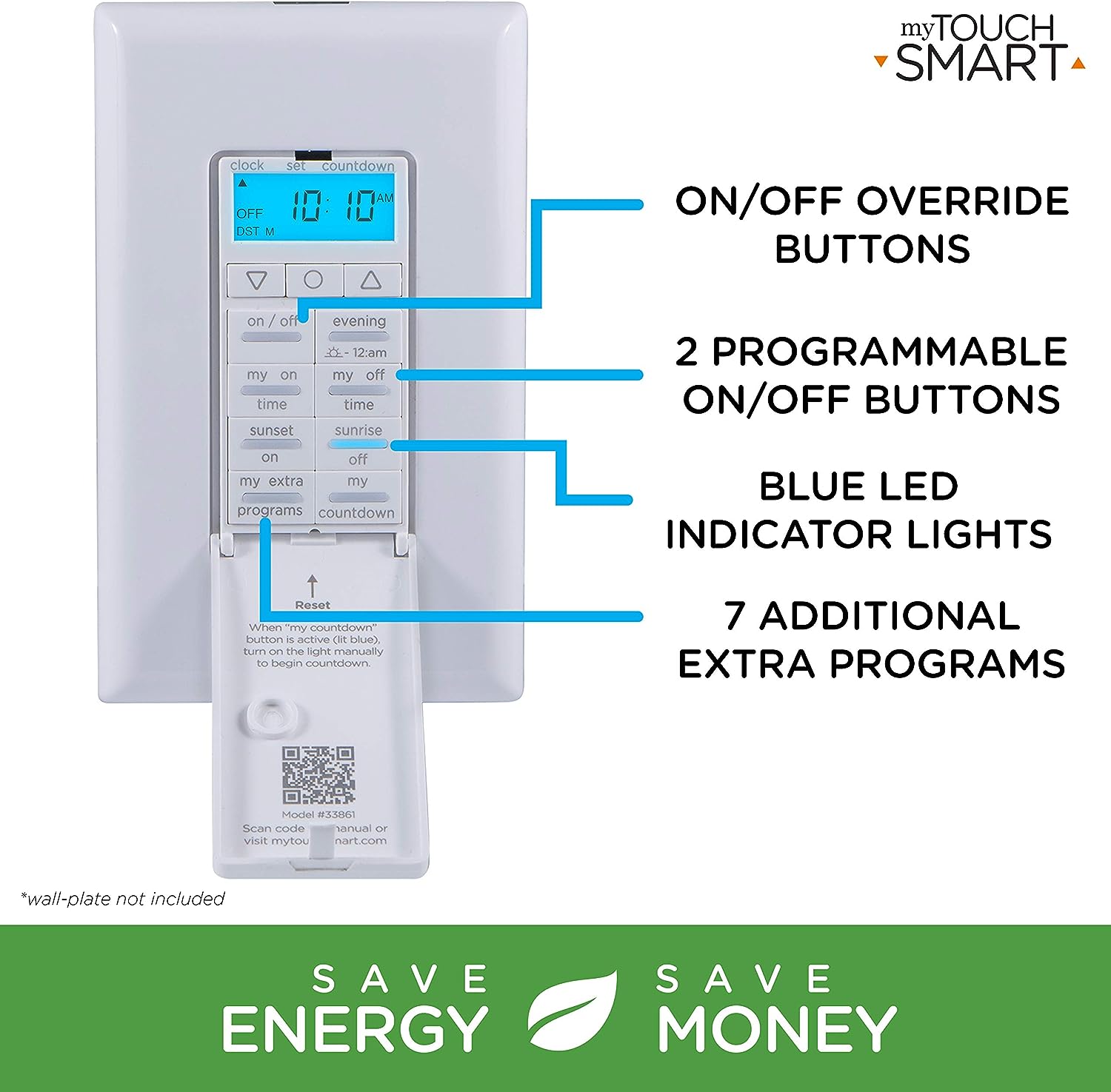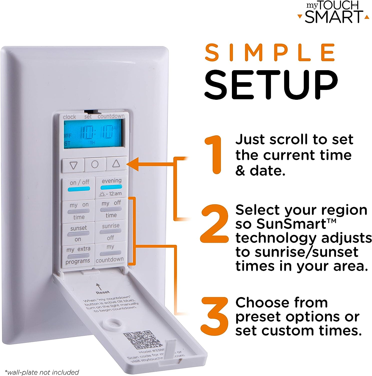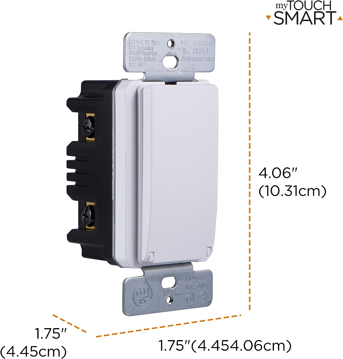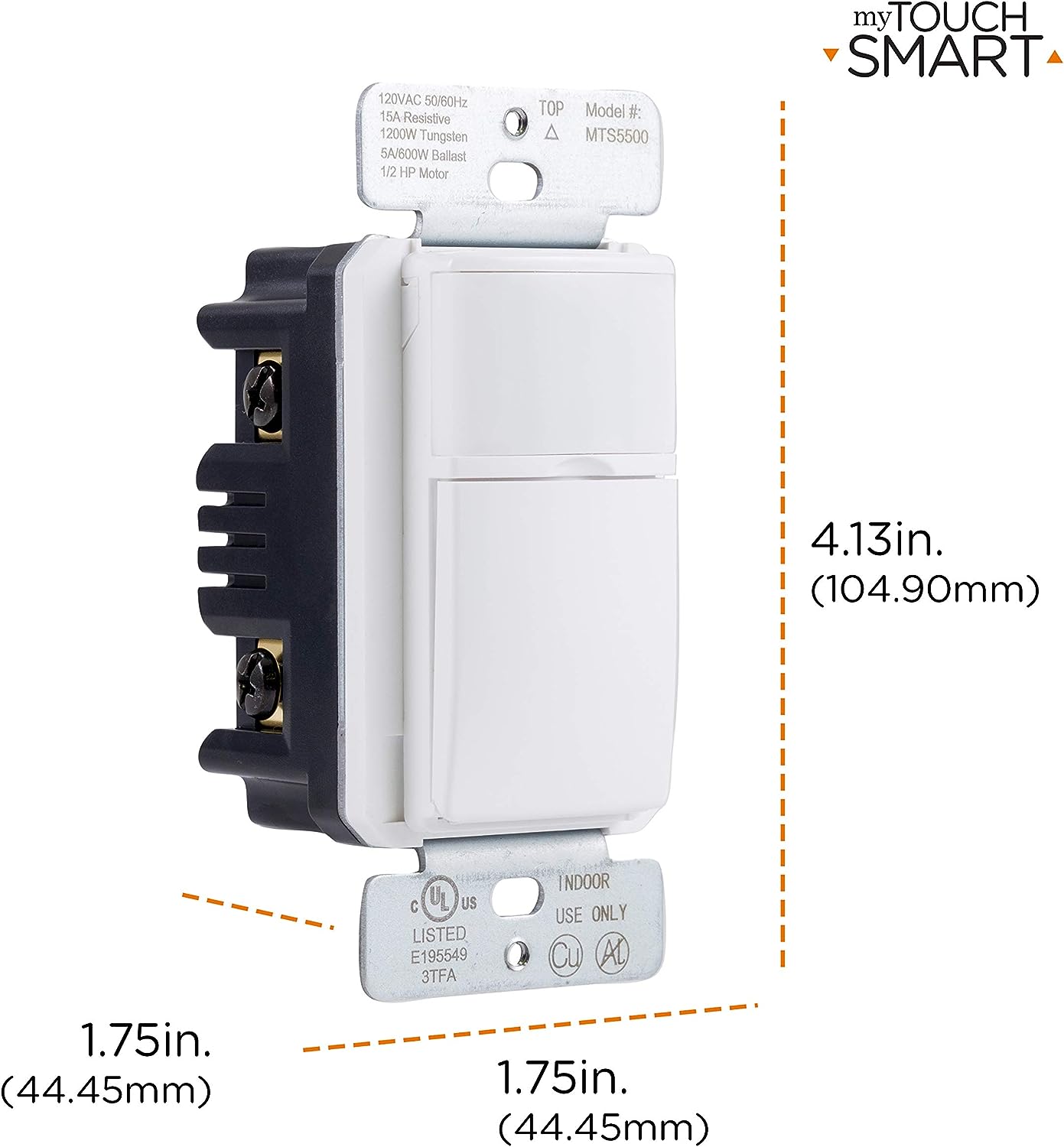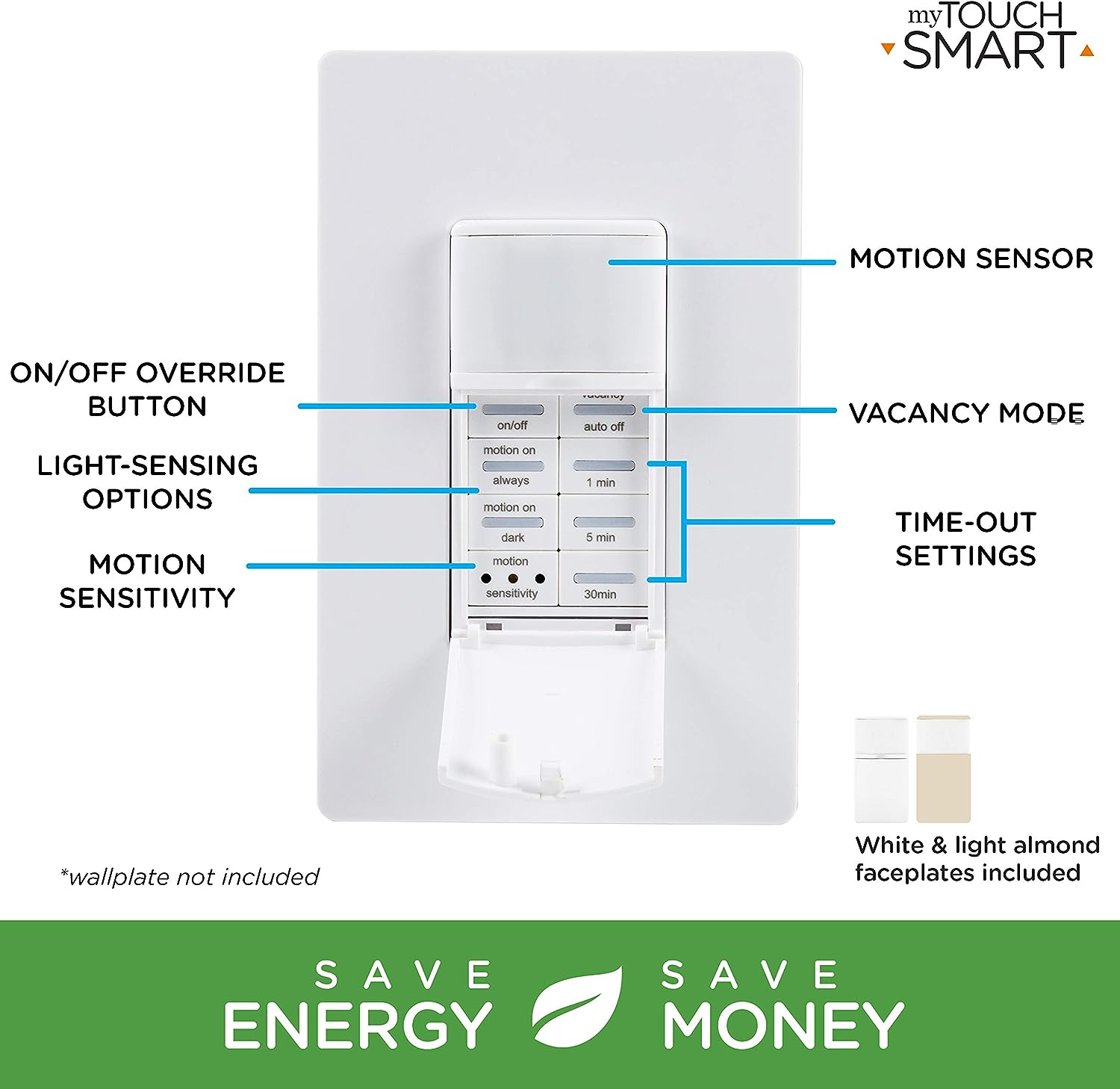 Move toward simple control with the myTouchSmart In-Wall Motion Sensor. The motion sensor activates lights when movement is detected so you never have to search for a switch in a dark room. Simple-set programming delivers convenient automation to your lighting and is compatible with LED, CFL, incandescent and halogen bulbs. Easy-to-use buttons control how long lights remain on once motion is no longer sensed. Choose from occupancy mode for full automation or vacancy mode to turn on lights manually and off after a selected time from 1-30 minutes. Adjustable motion sensitivity with a detection range of up to 30ft., coverage area of up to 150 degrees and a light-sensing function make the sensor perfect for any room. Blue LED indicators identify selected settings to keep track of your programs. NO WALL PLATE INCLUDED but a changeable door – white and light almond included – conceals the buttons and LEDs, blends in with existing switches, and serves as a manual ON/OFF switch. Space-saving screw terminals allow the sensor to replace any switch. Increase your control with the myTouchSmart In-Wall Motion Sensor.