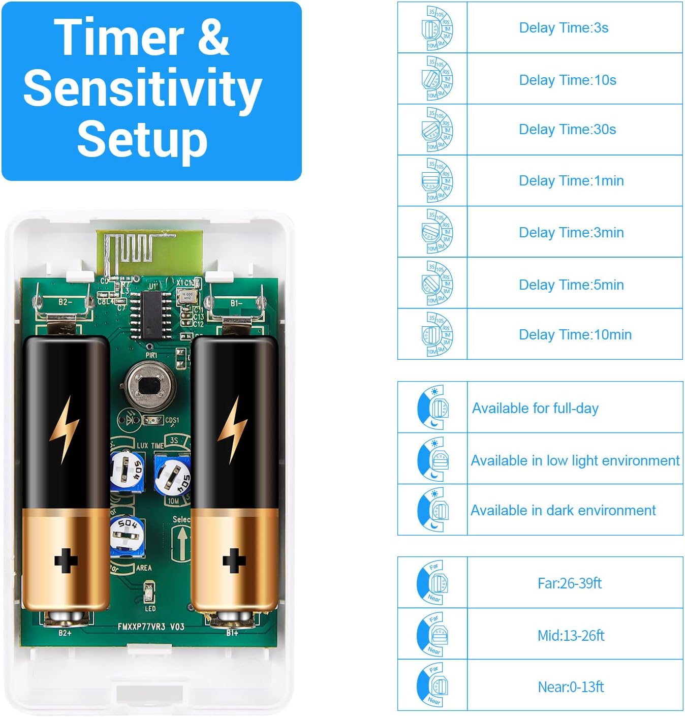 • ✅【three adjustabel Sensing mode】Motion Status Delay Settings:3S,10S,30S,1min,3min,5min and 6min(default time:30s), Adjustable Sensing Range: Near: 0-13ft Mid; 13-26ft Far: 26-39ft (Default Range:13-26ft),Sensing Setting: Available for full-day, Available in low light environment, Available in dark environment(default:full day),Please adjustable the sensing mode before installing. Automatically switches on the devices when motion detected. Pefect for different usage scenarios at home