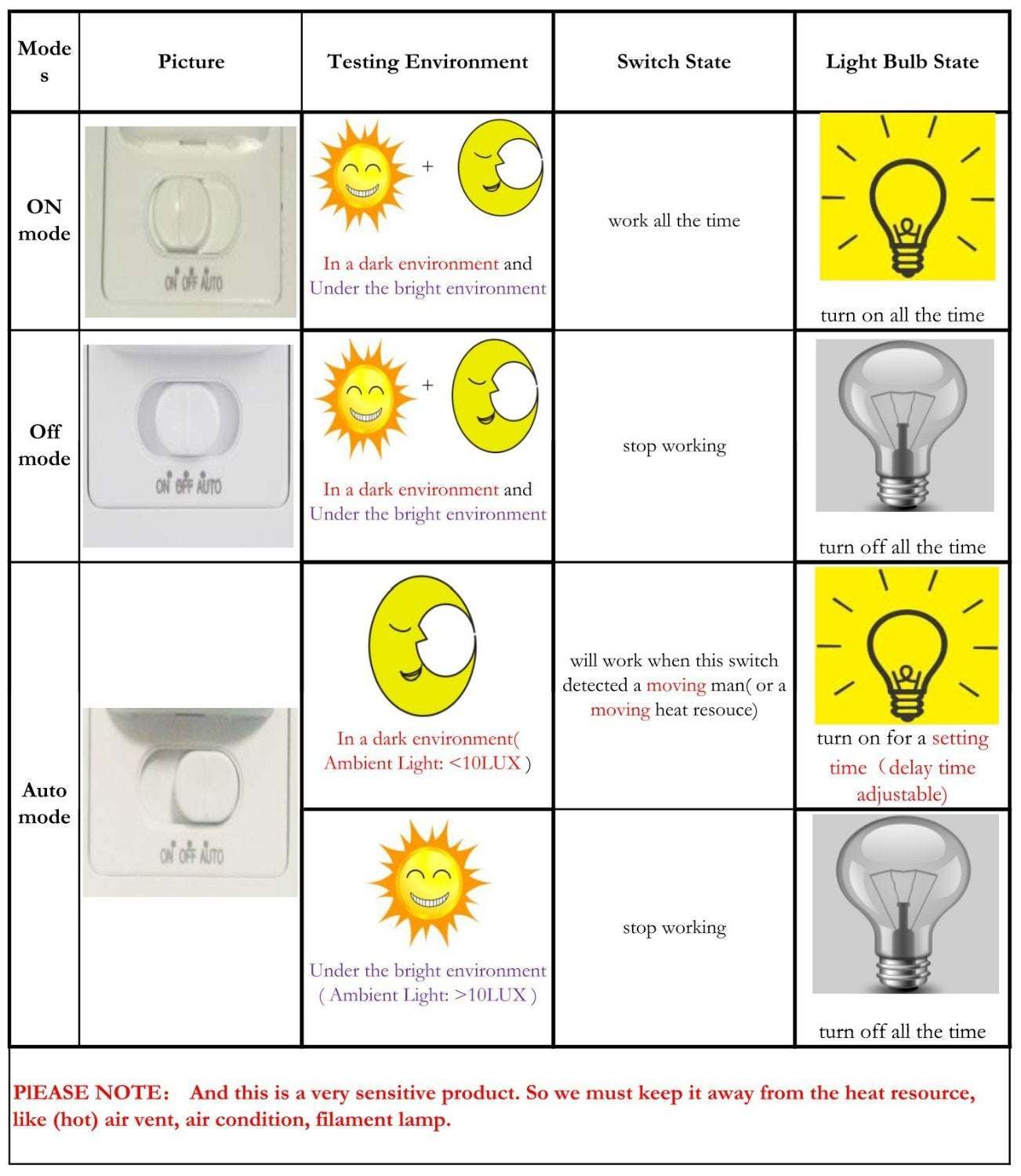 • 【Motion Sensor & Light Sensor Switch】: Automatically turn on/off lights based on room occupancy when detect hear source and environment brightness. Detection motion speed is 0.6~1.5m/s.