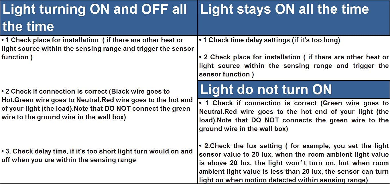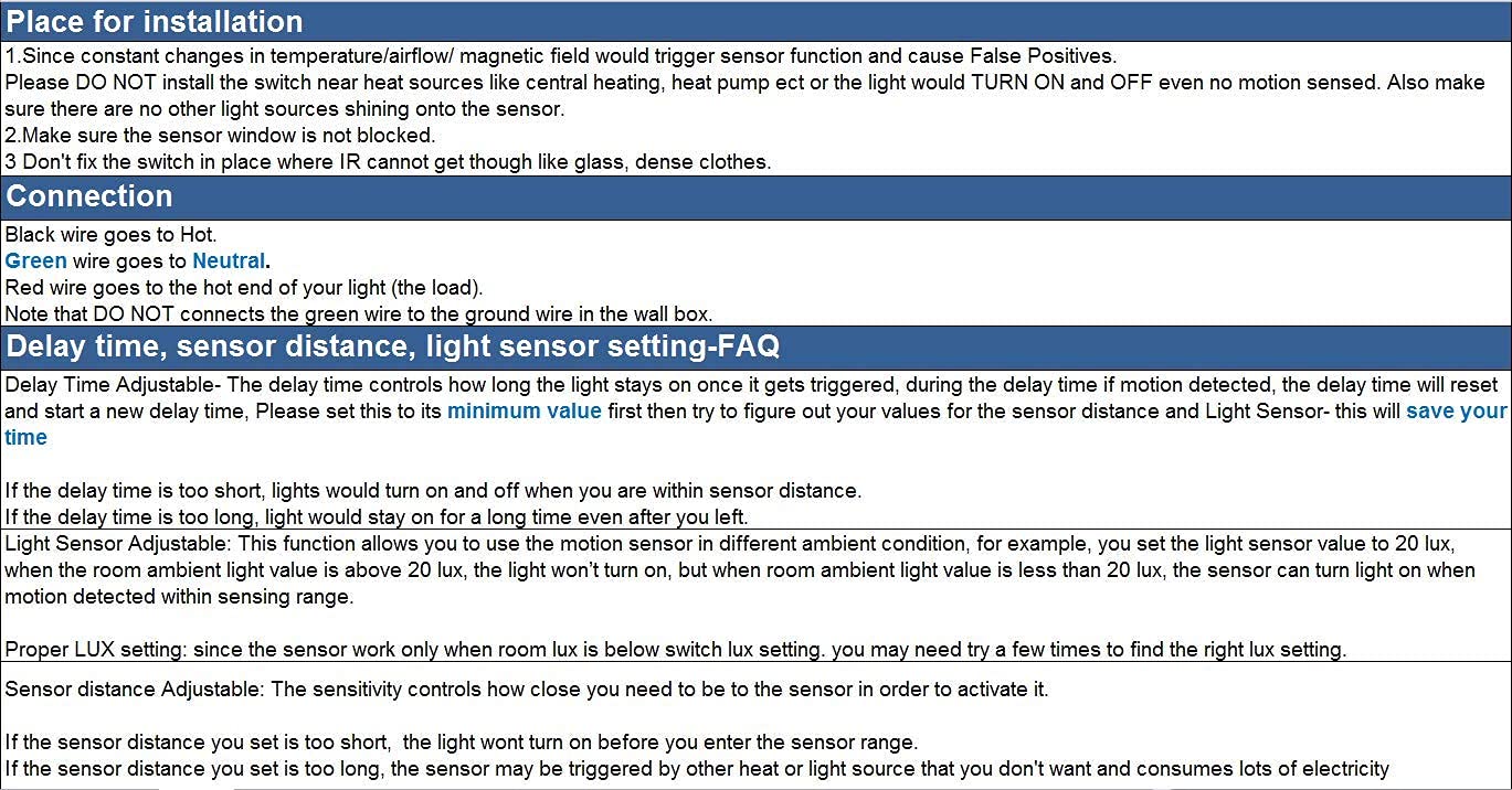 • 【Three Mode and Energy-saving】: AUTO mode works as an occupancy sensor (Auto ON, Auto OFF). ON and OFF modes allow you to override the sensor and use the sensor switch as a regular light switch.Motion sensor switch uses a passive infrared (PIR) sensor to energy-saving and lower bills.