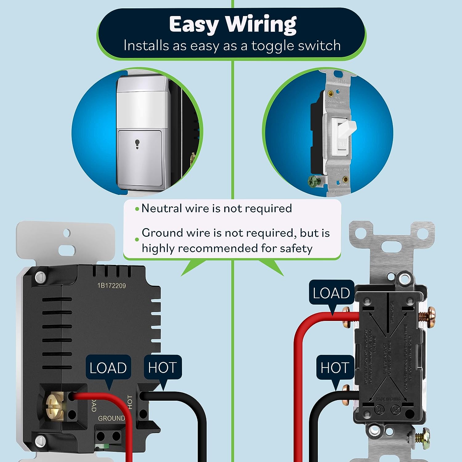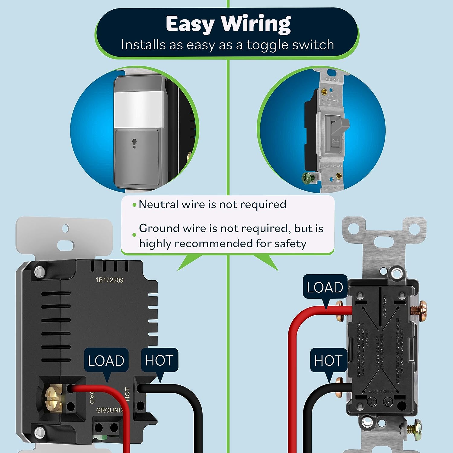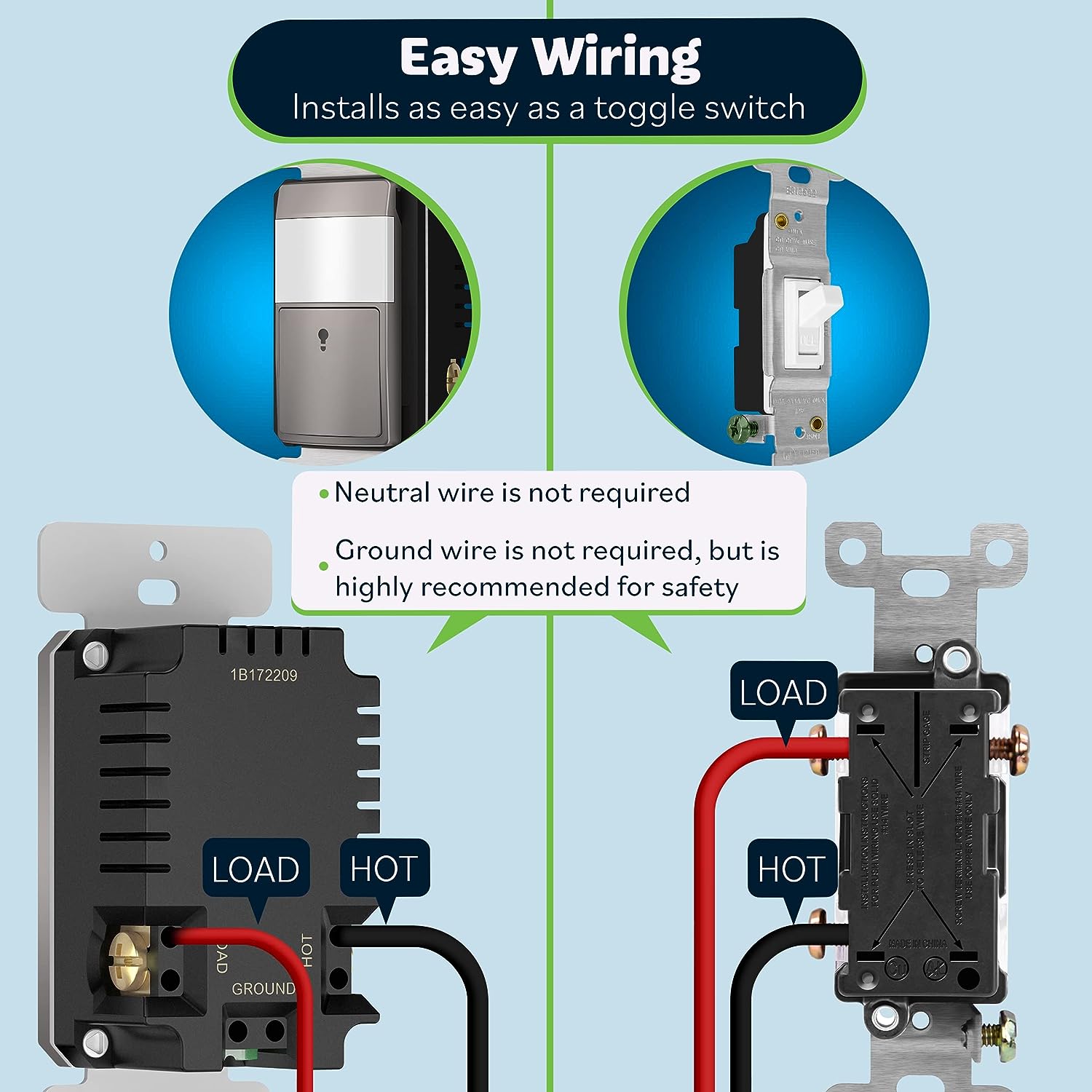 • Motion sensor wall switch features a universal wiring design with interchangeable hot and load wires to make installation easier; no longer second guess which wire goes where