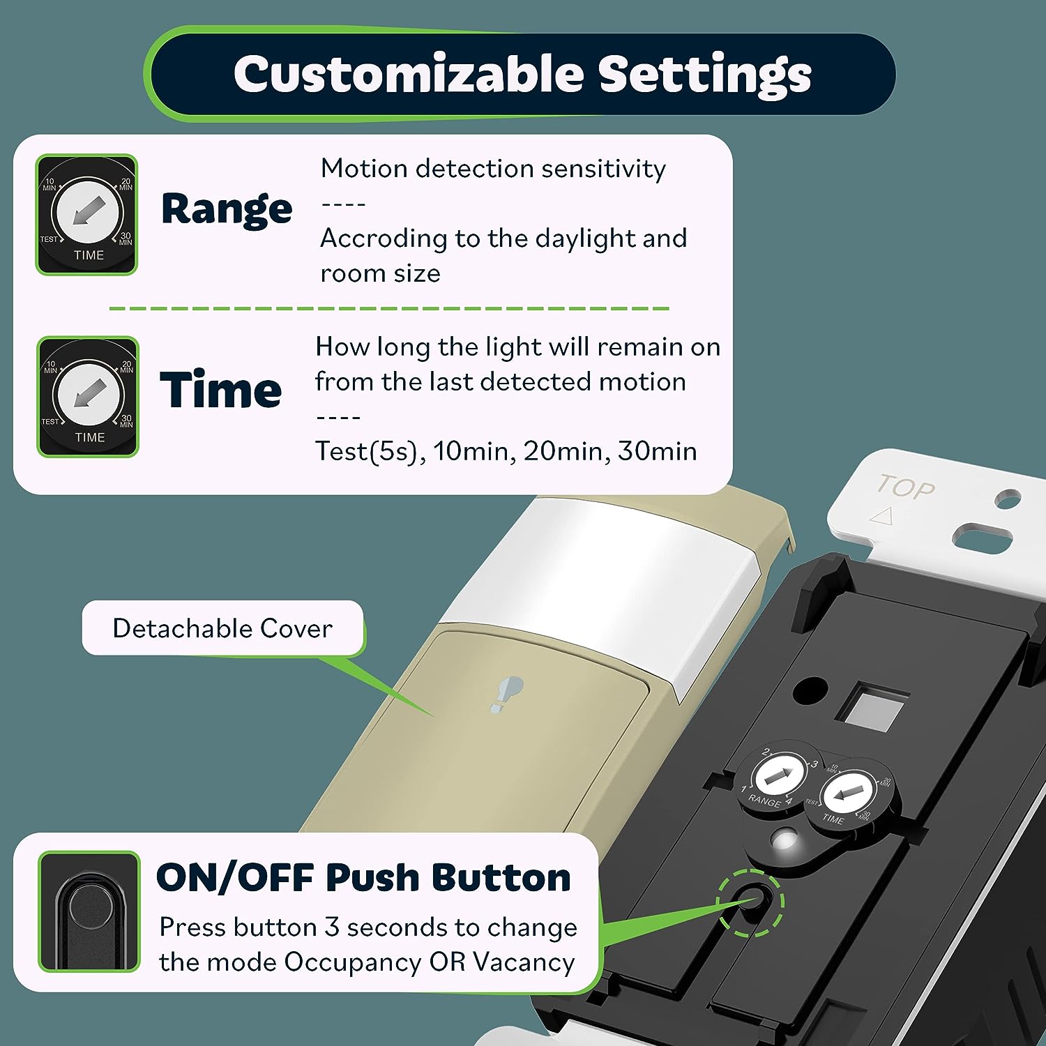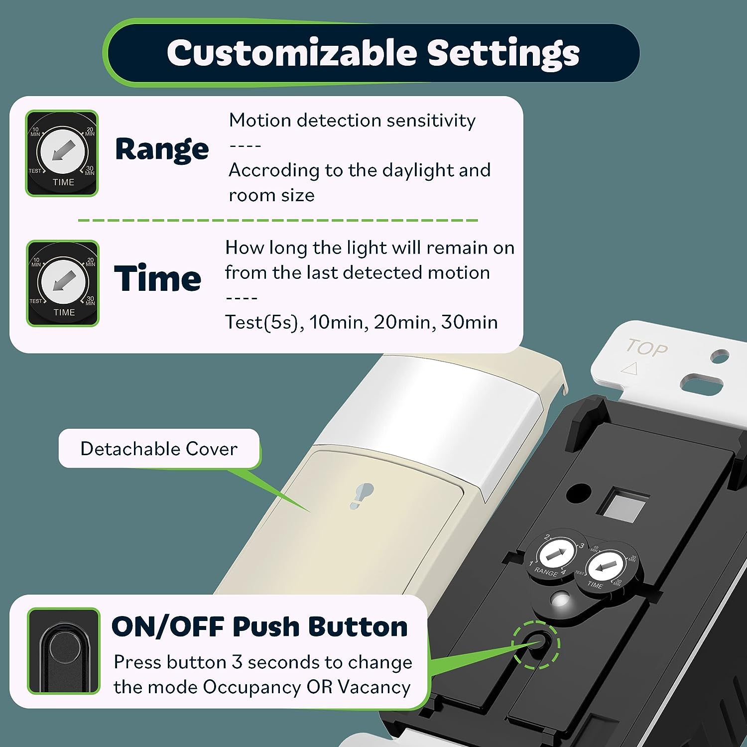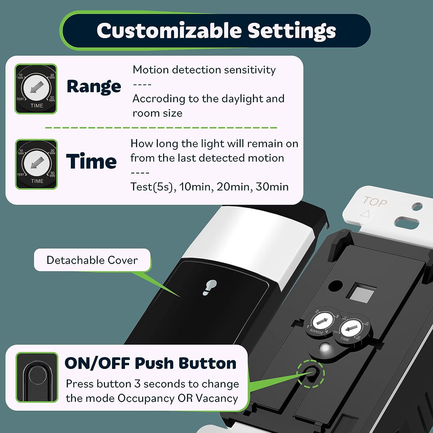 • ????????? ?????? ???? (Auto ON, Auto OFF) and ??????? ?????? ???? (Manual ON, Auto OFF) allow you to customize the sensor according to your needs; adjustable time delay options: 15 sec (Test), 5 min, 10 min, 20 min, 30 min; change mode with the OCC/VAC switch located under the face of the device