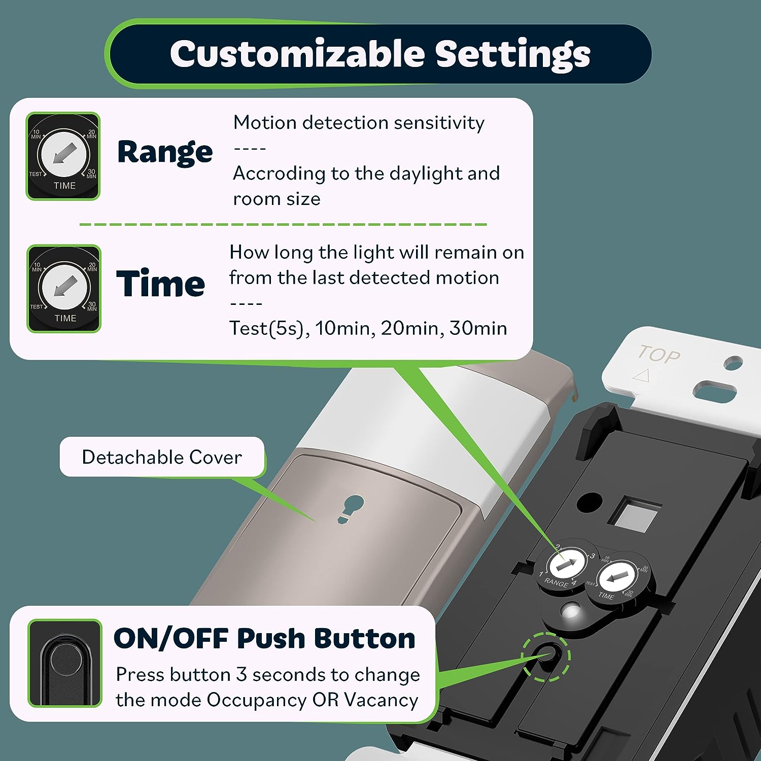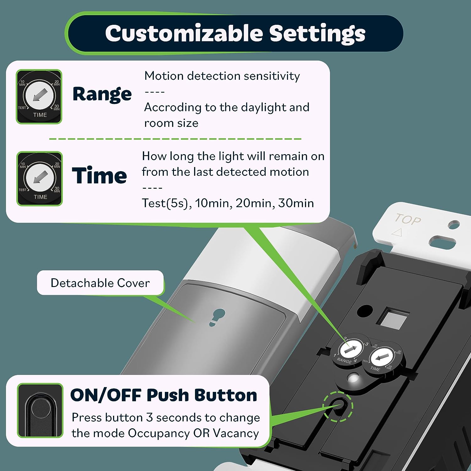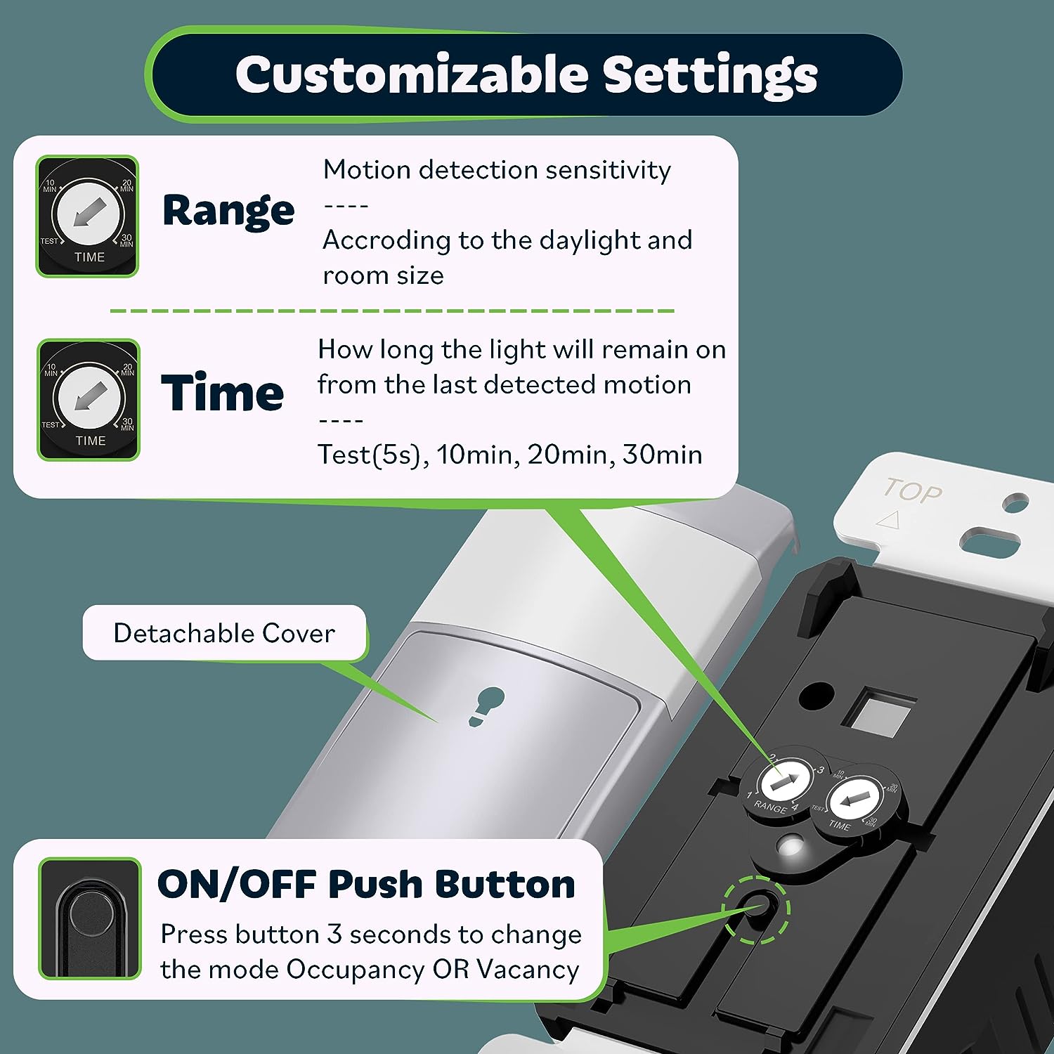 • ????????? ?????? ???? (Auto ON, Auto OFF) and ??????? ?????? ???? (Manual ON, Auto OFF) allow you to customize the sensor according to your needs; adjustable time delay options: 15 sec (Test), 5 min, 10 min, 20 min, 30 min; change mode with the OCC/VAC switch located under the face of the device