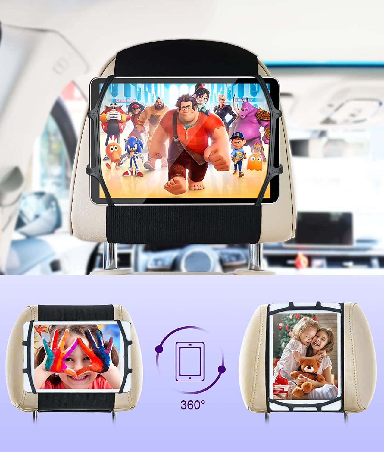 • 🚓🚗【Horizontally or Vertically Viewing】360° rotatable design enables easily installed horizontally or vertically in the car. Your neck won't be sore and won't affect your eyesight, at the same time free your hands to avoid fatigue. Keep your child or other back seat passengers entertained during long-distance driving. It is the best choice for watching movies, reading and playing games, etc.