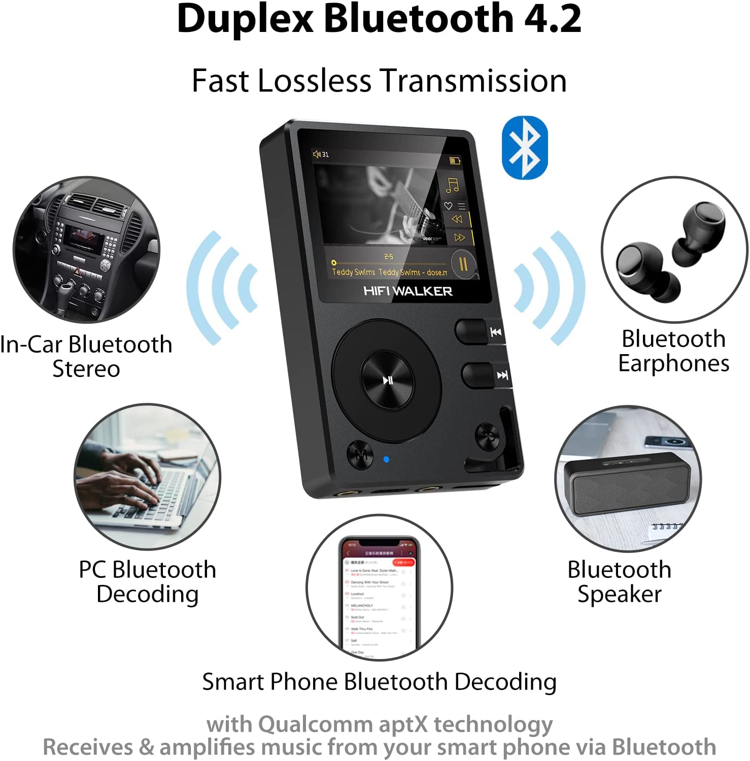 • [MP3 Player with Bluetooth] This Bluetooth MP3 player features 2-way Bluetooth 4.2, which supports high-definition wireless audio using Qualcomm aptX technology. It can work as a sender to deliver signals or as a receiver to amplify music wirelessly. You can enjoy up to 10 hours of uninterrupted high-fidelity audio through headphones or a Bluetooth device.