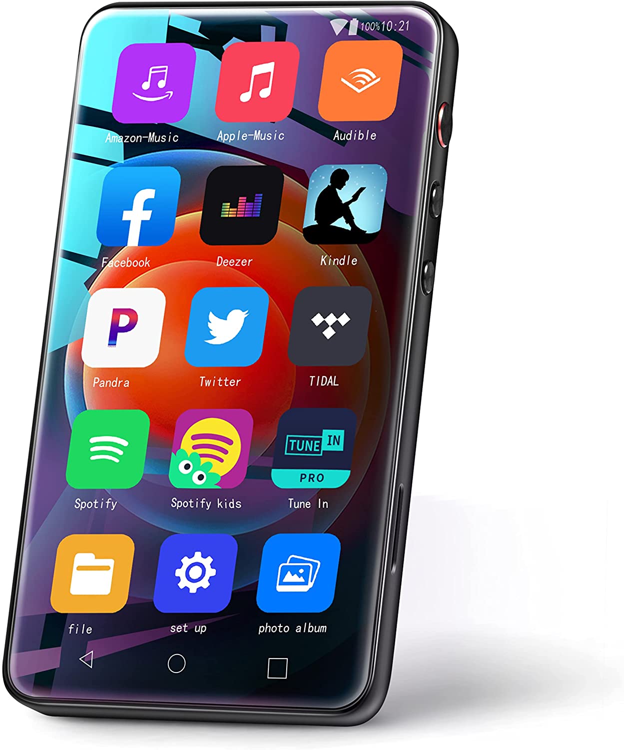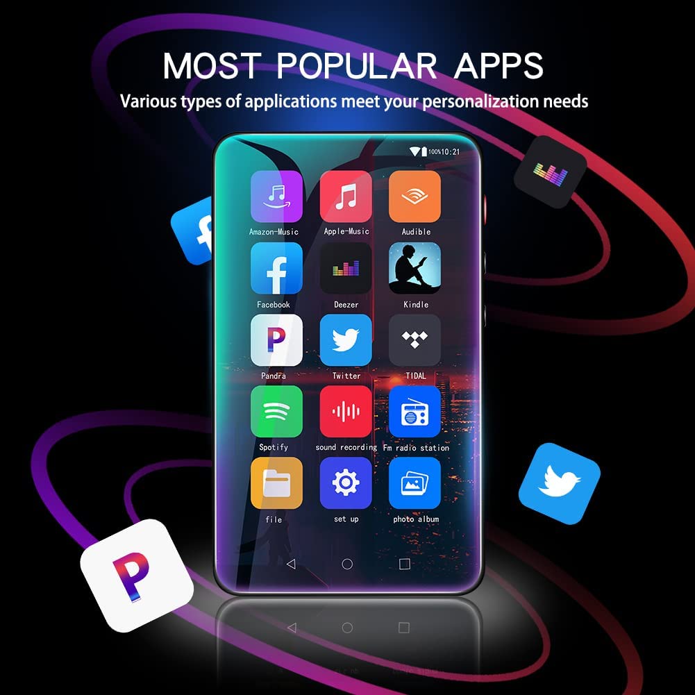 • 📶Smart WIFI wireless connection: This mp3 player support to download/upload/listen the music or watch the video online after you connect the WiFi. This mp3 player cover variety of mainstream media APPs in it, such as: Amazon Music, Apple Music, Spotify, Facebook, Audible, Deezer, Kindle, Pandora, Twitter, TIDAL, FM Radio, Sound Recorder, Videos, etc.