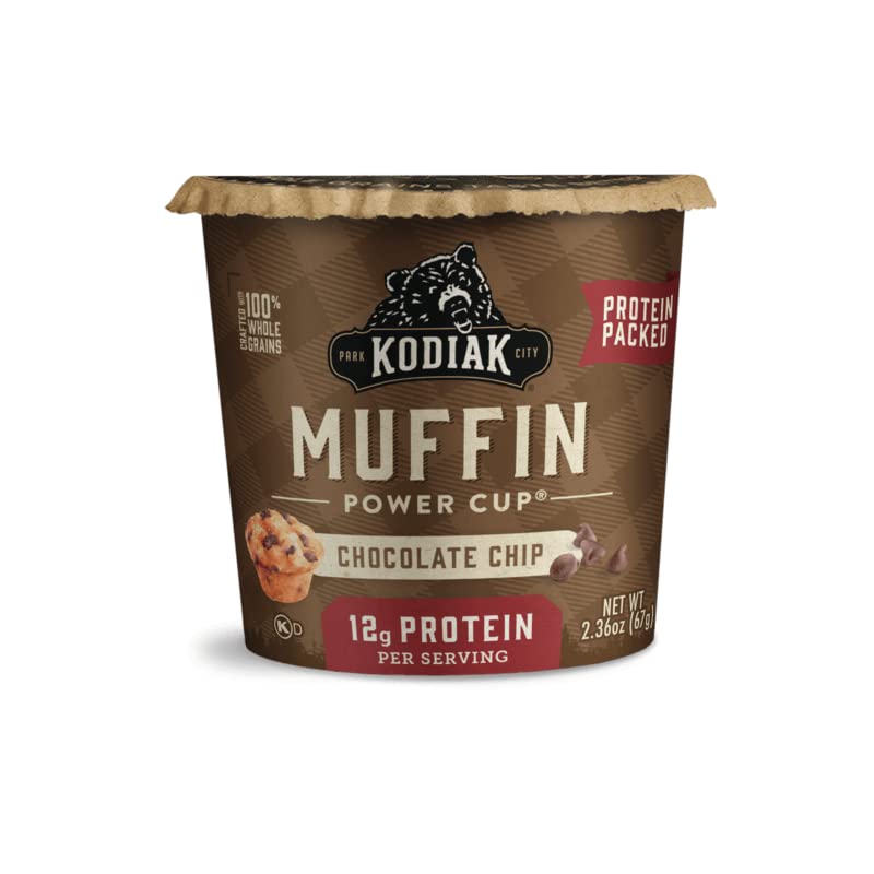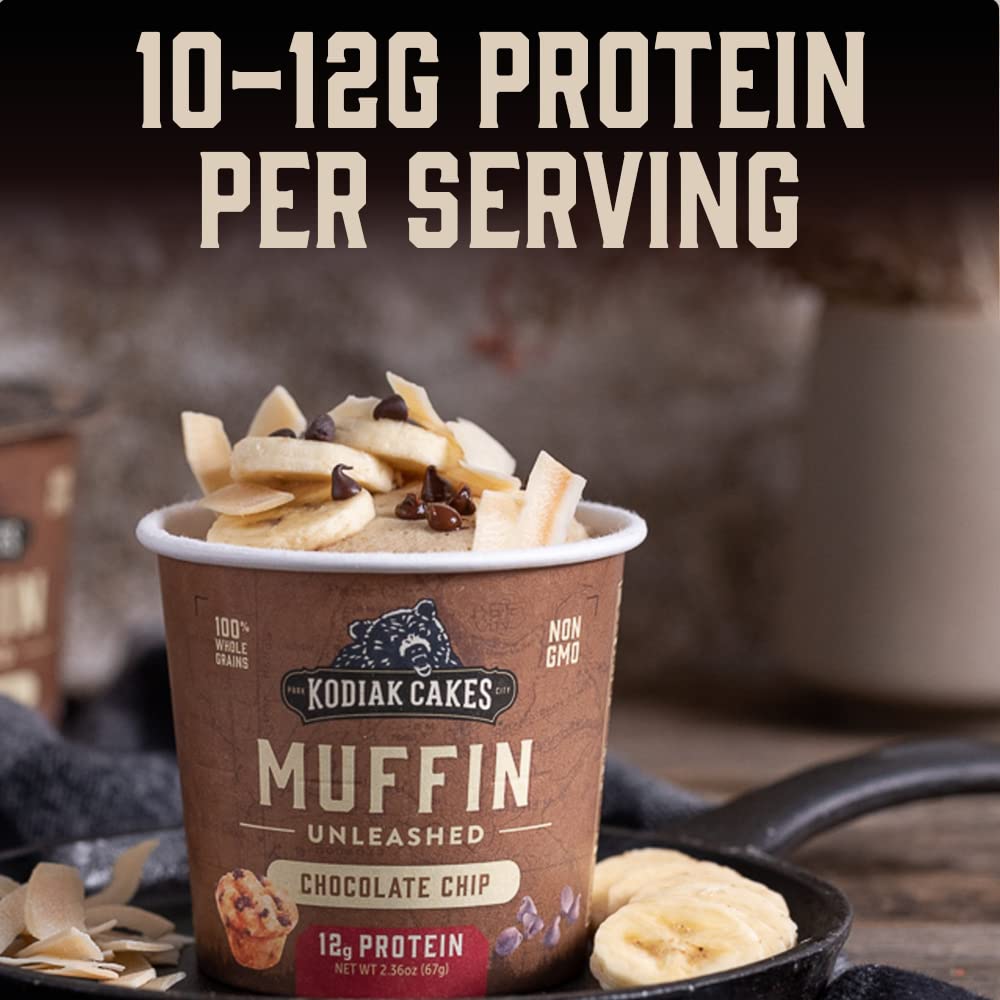 Kodiak Cakes Chocolate Chip muffin unleashed is ideal for those mornings you’re rushing between the gym and work. We craft this frontier-inspired muffin in a cup with 100% whole grains, 12 grams of protein, and Non-GMO ingredients to make it a wholesome, great-tasting breakfast or mid-afternoon snack—all you have to do is add water, stir, and microwave to fuel up for whatever the day brings.