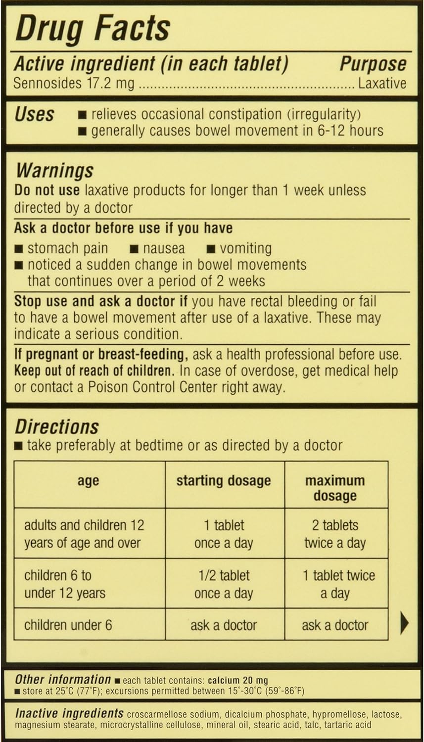 Clinically proven, Senokot Extra Strength tablets have double the strength of our regular tablets but are just as gentle. Senokot Extra Strength uses a natural vegetable laxative ingredient to provide dependable, overnight relief from occasional constipation when taken at bedtime. Senokot Extra Strength tablets generally produce a bowel movement in 6-12 hours and can be used in children ages 6+. For your comfort, the active ingredient in Senokot Extra Strength laxative tablets is purified senna, manufactured to high quality standards. Constipation can certainly interfere with your day and may be caused by travel, stress, dietary changes, or aging. Senokot brings nature and science together to give you five formulations that meet your specific needs. Satisfaction guaranteed. For over 65 years, physicians and pharmacists have trusted – and consumers have relied on – the Senokot brand to provide gentle, effective overnight relief of occasional constipation. Senokot Extra Strength is FSA or HSA eligible. Use as directed.