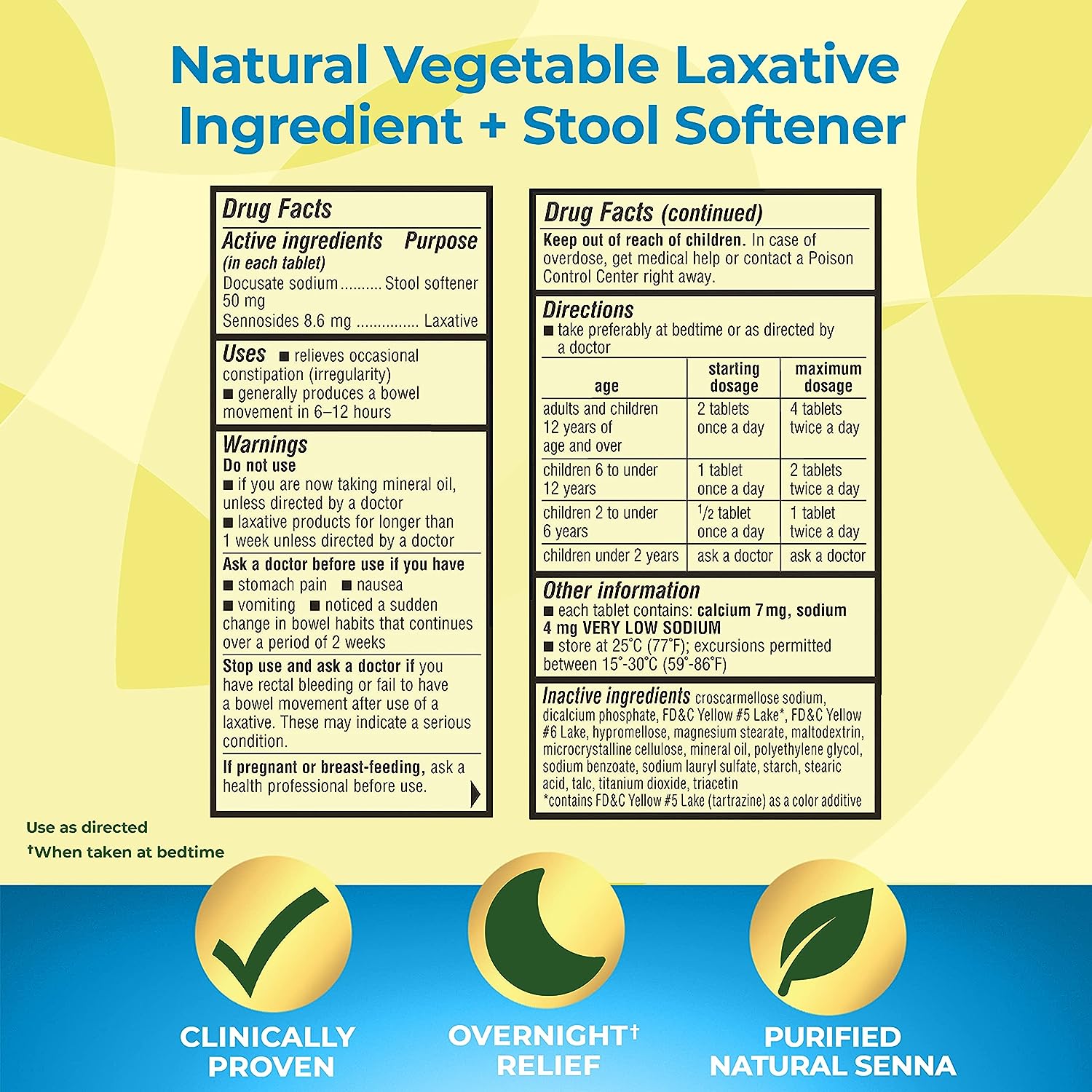 Clinically proven, Senokot-S Dual Action tablets contain a natural vegetable ingredient plus docusate sodium, a stool softener, for gentle, overnight relief of constipation when taken at bedtime. Senokot-S Dual Action tablets generally produce a bowel movement in 6-12 hours and can be used in children ages 2+. For your comfort, the active ingredients in Senokot-S Dual Action laxative tablets are purified senna and docusate sodium, manufactured to high quality standards. Constipation can certainly interfere with your day and may be caused by travel, stress, dietary changes, or aging. Senokot brings nature and science together to give you five formulations that meet your specific needs. Satisfaction guaranteed. For over 65 years, physicians and pharmacists have trusted – and consumers have relied on – the Senokot brand to provide gentle, effective overnight relief of occasional constipation. Senokot-S is FSA or HSA eligible. Use as directed.
