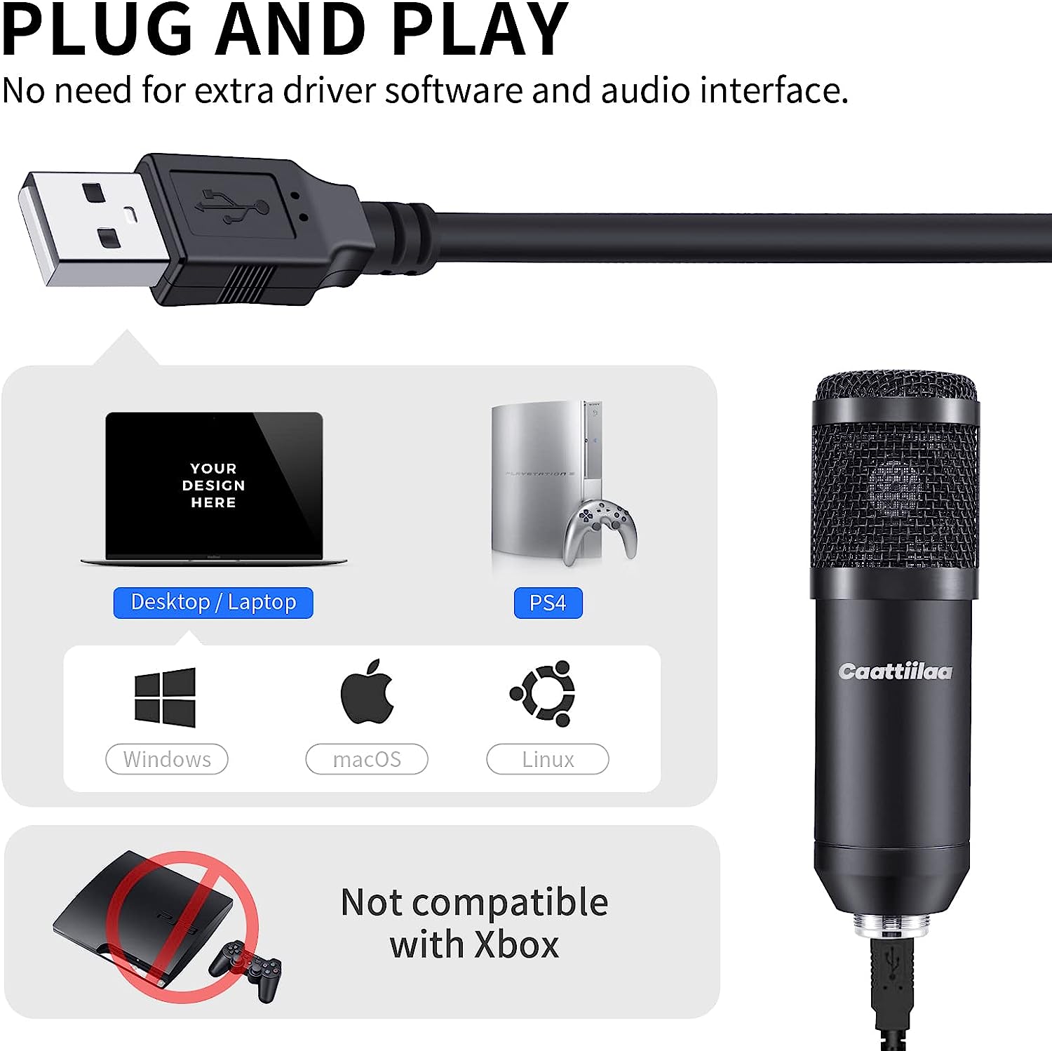 • Plug and Play Microphone, after plugging in, the microphone will be automatically recognized by the computer and can start recording. NO NEED TO install plugins. Note: this pc microphone is not compatible with Xbox and PS4.