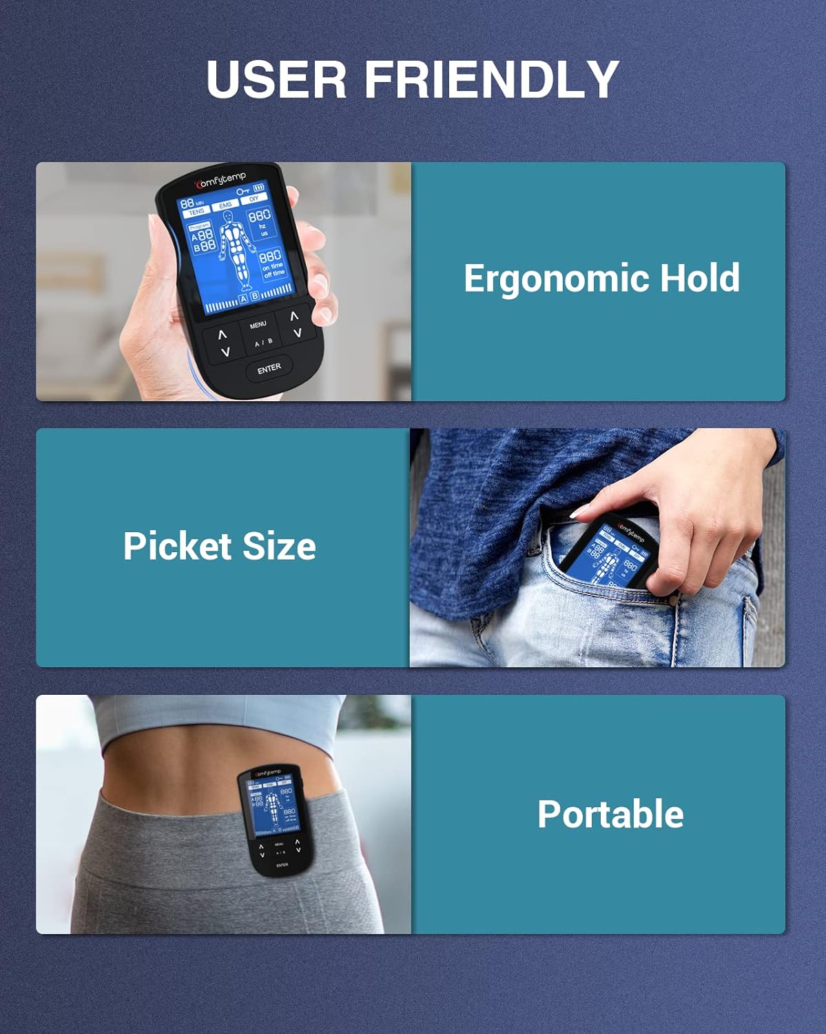 • 3IN LARGE SCREEN & EASY OPERATION: Compared with the common muscle stimulator, Comfytemp portable tens unit adopts a 3-inch high-definition large screen, which is easy to read and operate. The electrodes muscle stimulator for muscle growth provides a key lock function to provide you with safety protection from strong currents caused by accidental touch. The memory function to remember the last used mode and setting, say goodbye to tedious operation.