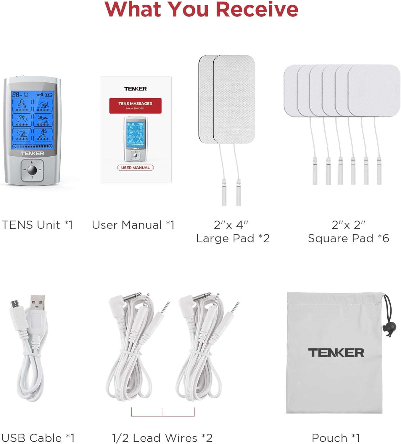 TENKER TENS EMS Unit Muscle Stimulator, 24 Modes TENS Machine for Pain Relief & Muscle Strength Rechargeable Electronic Pulse Massager with 2"x2" and 2"x4" TENS Unit Electrode Pads
