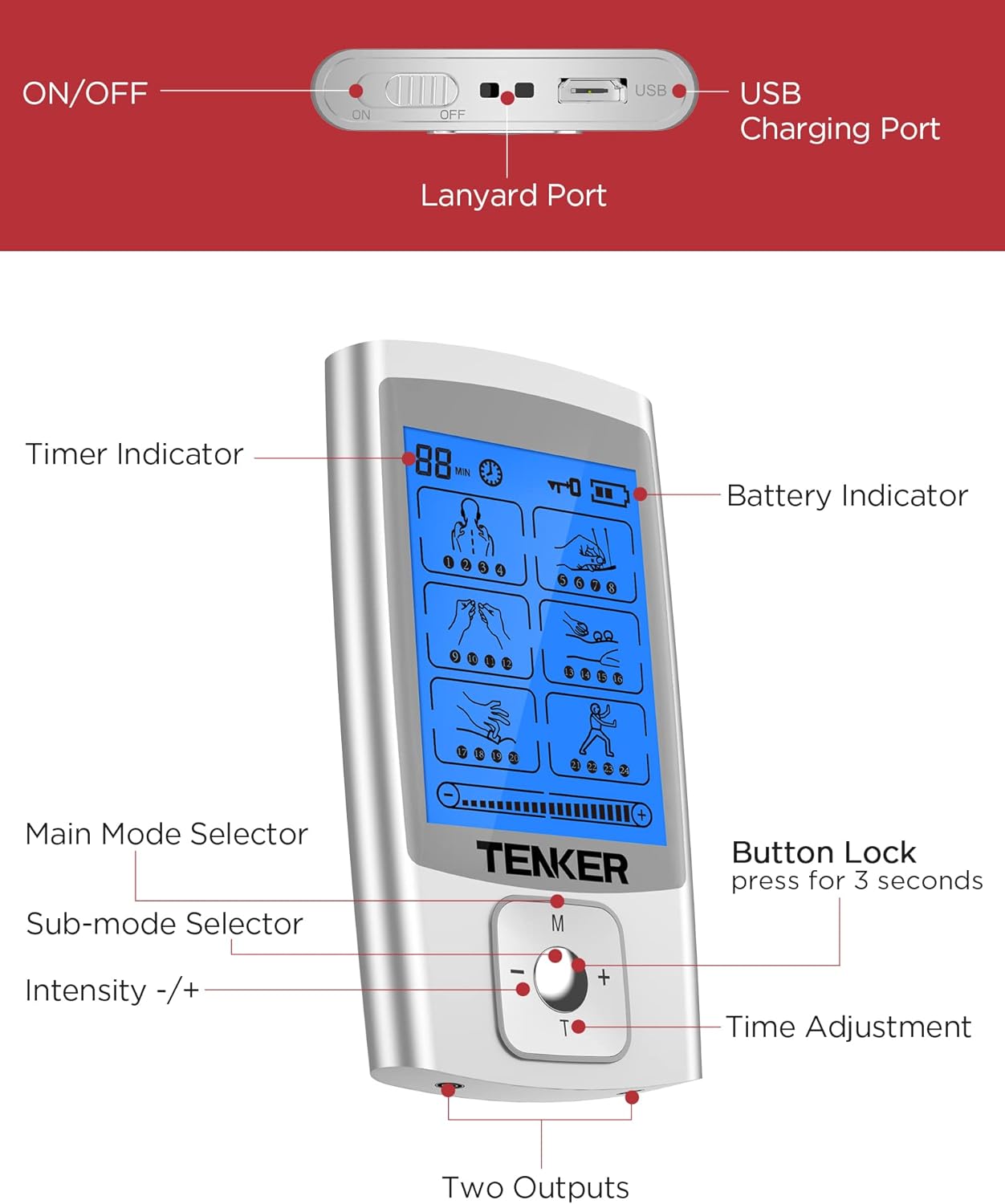 • Dual Output Design for Multi-person Use: Simultaneous dual output design allows use by two persons or for use in two different body areas. Use "+" and "-" buttons to increase/decrease intensity of the selected mode.