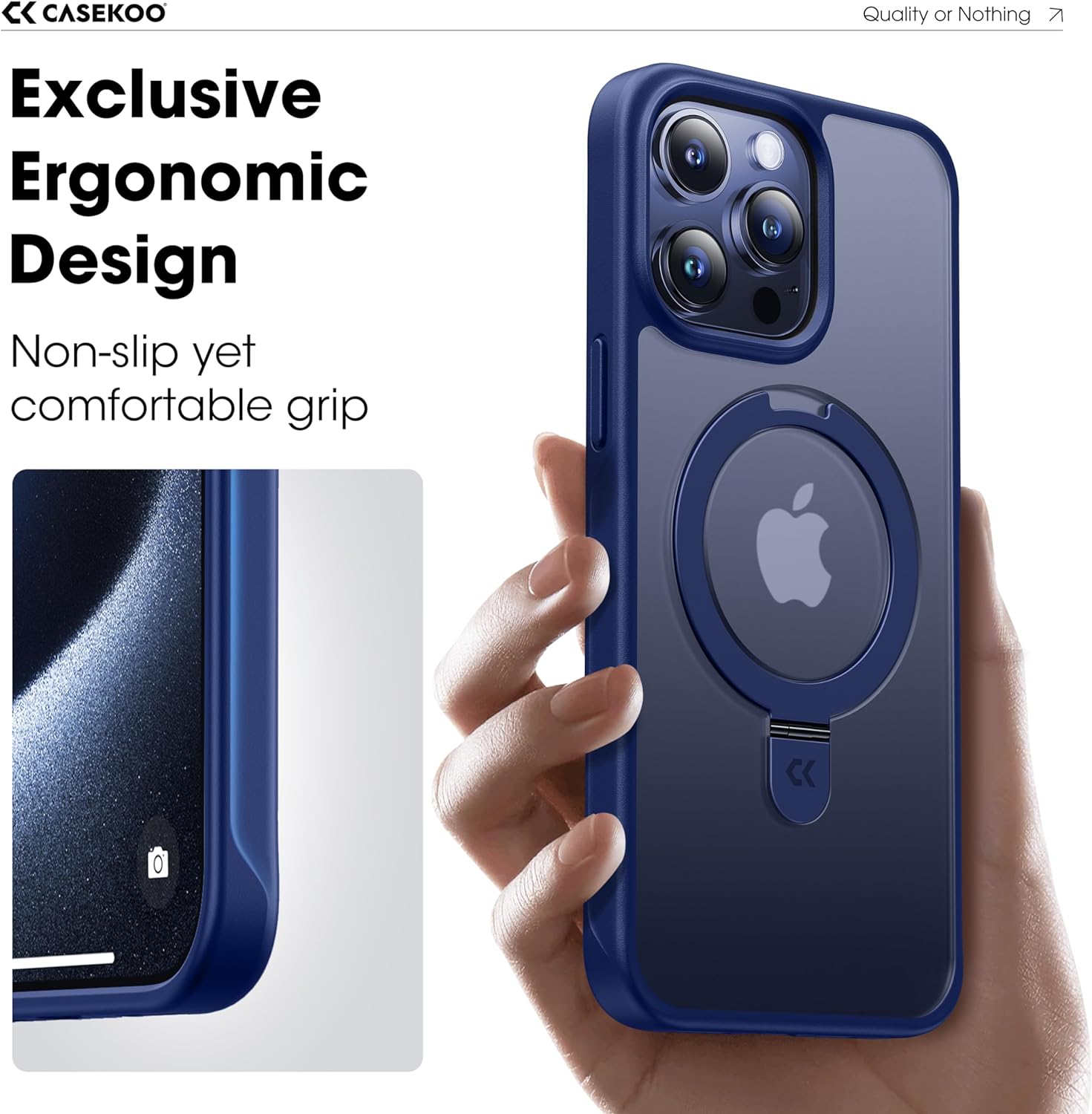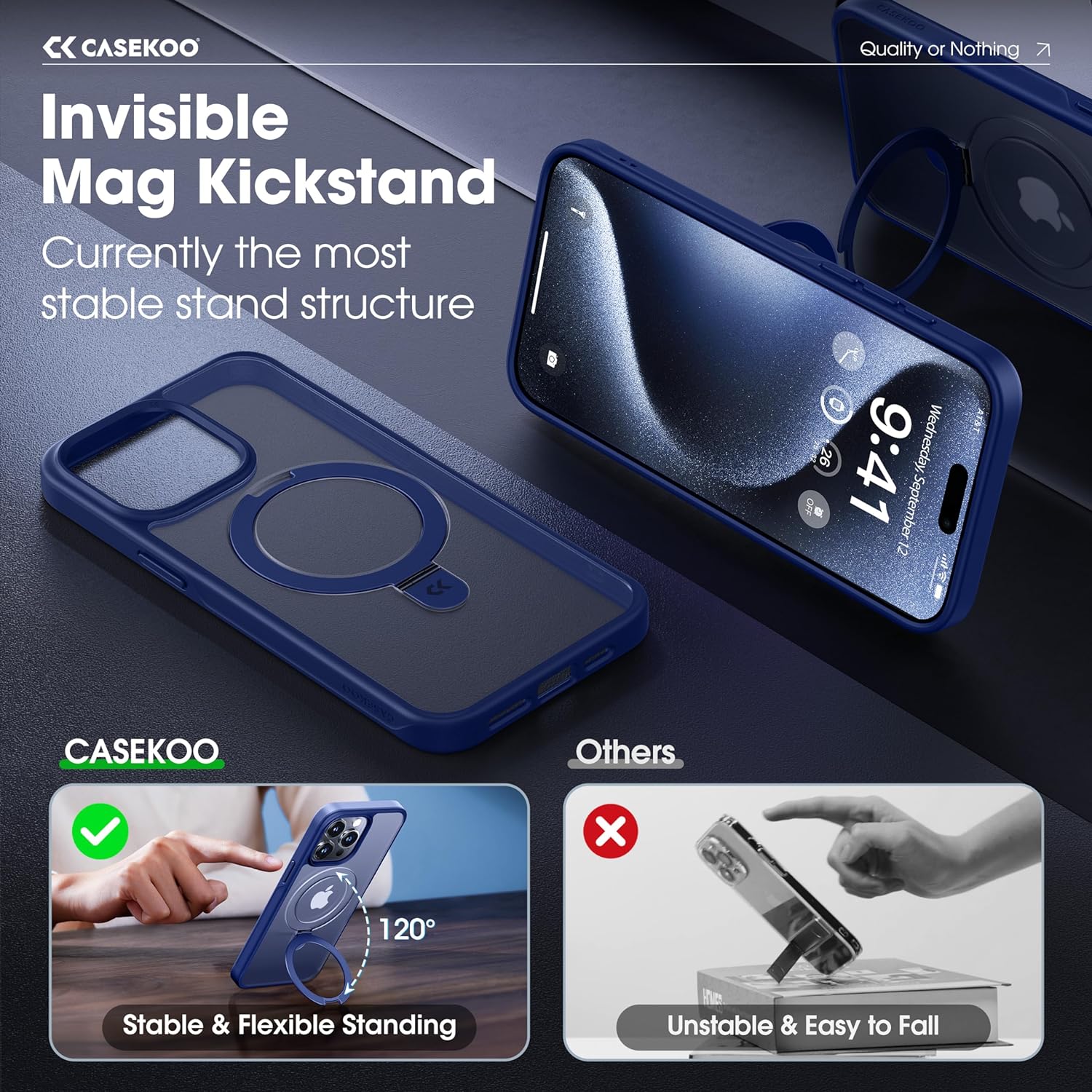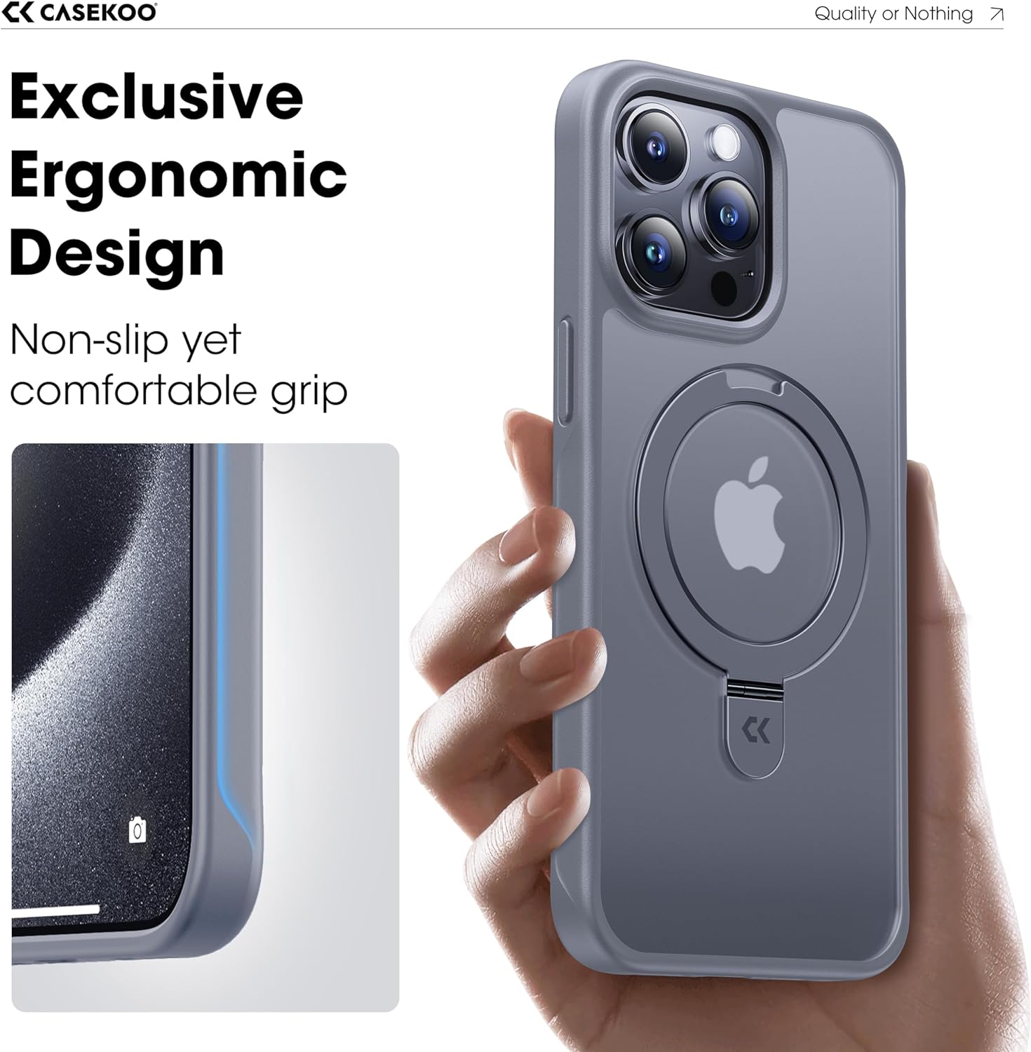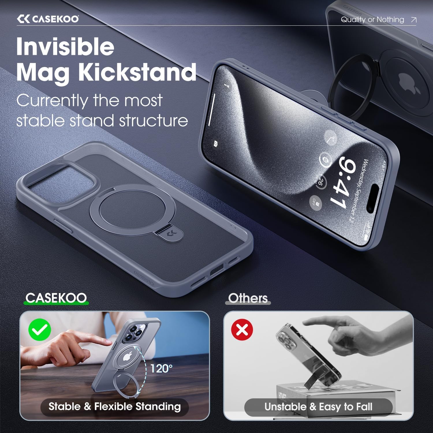 • 【Hands-Free, Hassle-Free】CASEKOO designed for iPhone 15 Pro Max case incorporates an innovative invisible stand design with an exclusive appearance patented. Constructed with the LIGHTWEIGHT YET DURABLE aerospace aluminum alloy, the circular kickstand brings the portability of the phone case to a new level. In addition, it can be placed in portrait or landscape mode stably. You can adjust it between 40°~120° as your wish. Enjoy every watching moment.