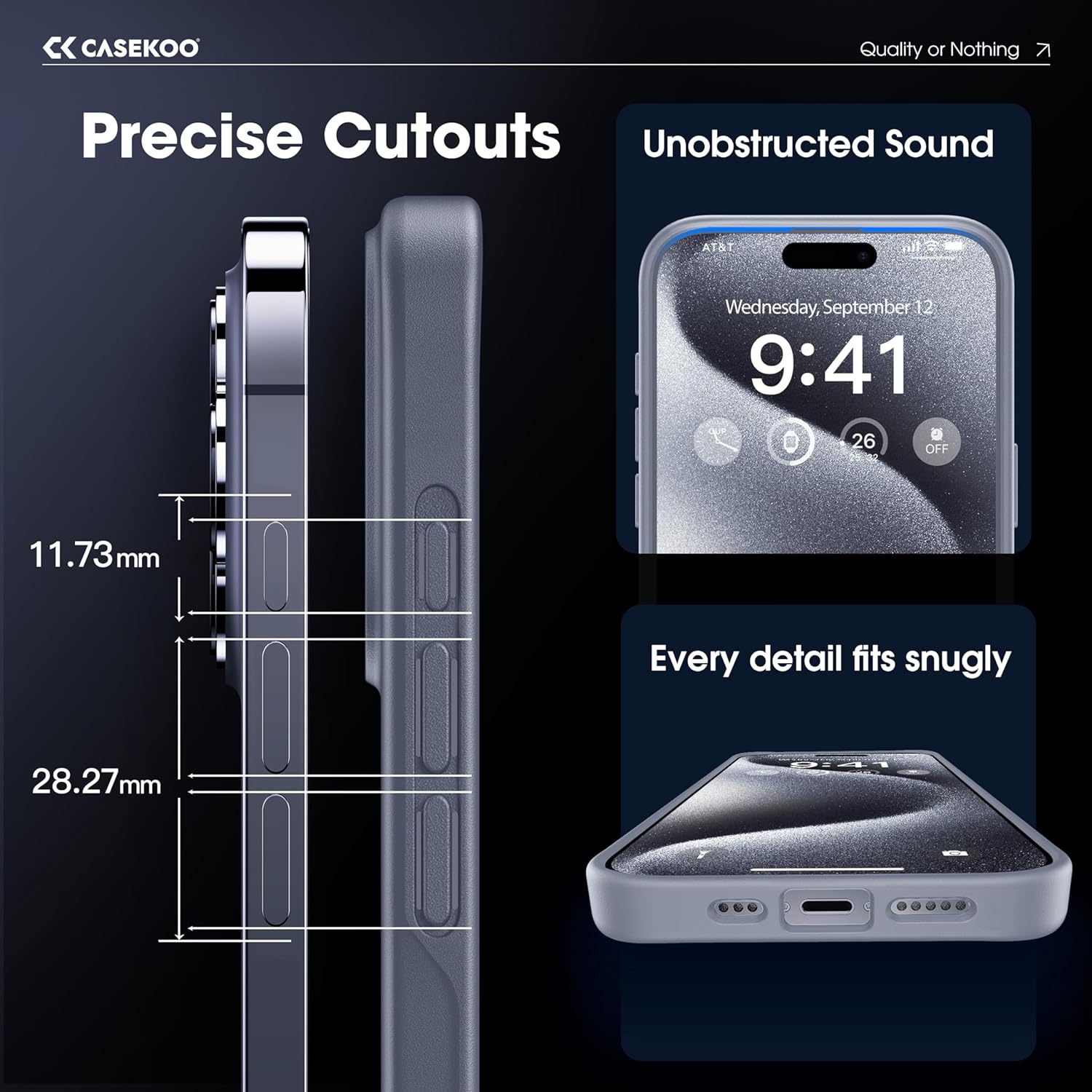 • 【Simplicity Without Compromise】CASEKOO compatible with iPhone 15 Pro Max Phone case comprises a premium matte semi-transparent cover to offer a silky touch feeling. The NON-SLIP grip design on the side of the case provides effective SLIP-RESISTANCE AND TRACTION. Thanks to the long-term anti-fingerprint tech, you can clean this case easily with just a gentle wipe to make all fingerprints invisible.