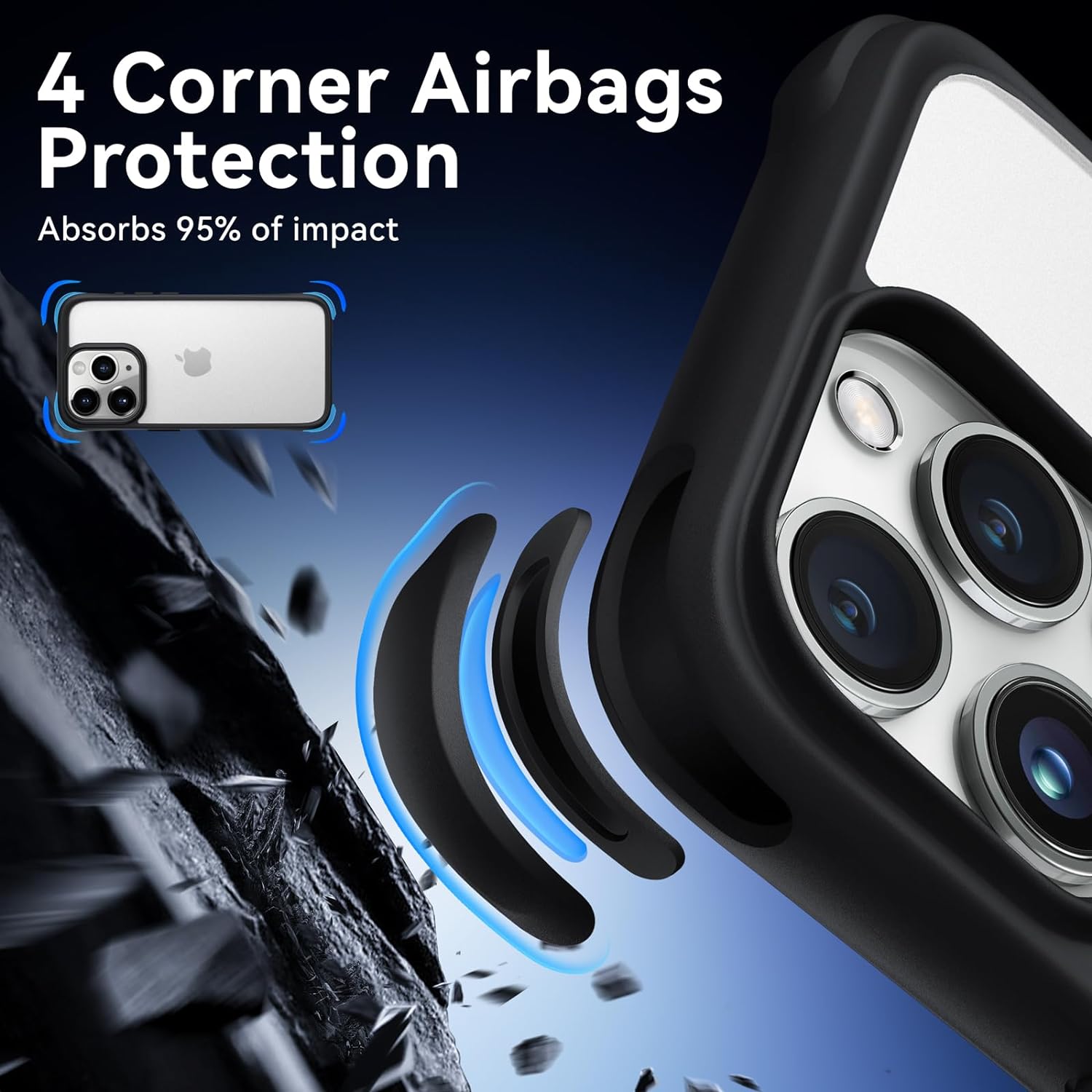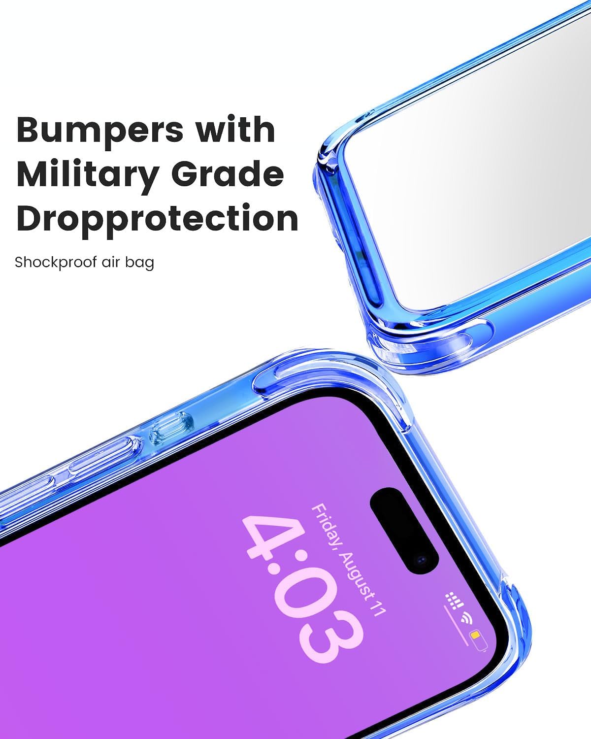 • The case for iPhone 15 Pro has built-in 4 corner airbags like finishes and bumper thickness with a raise of 3.5mm, which can effectively buffer any pressure inflicted on the phone, and protect your phone when suddenly dropping,bumps and scratches.
